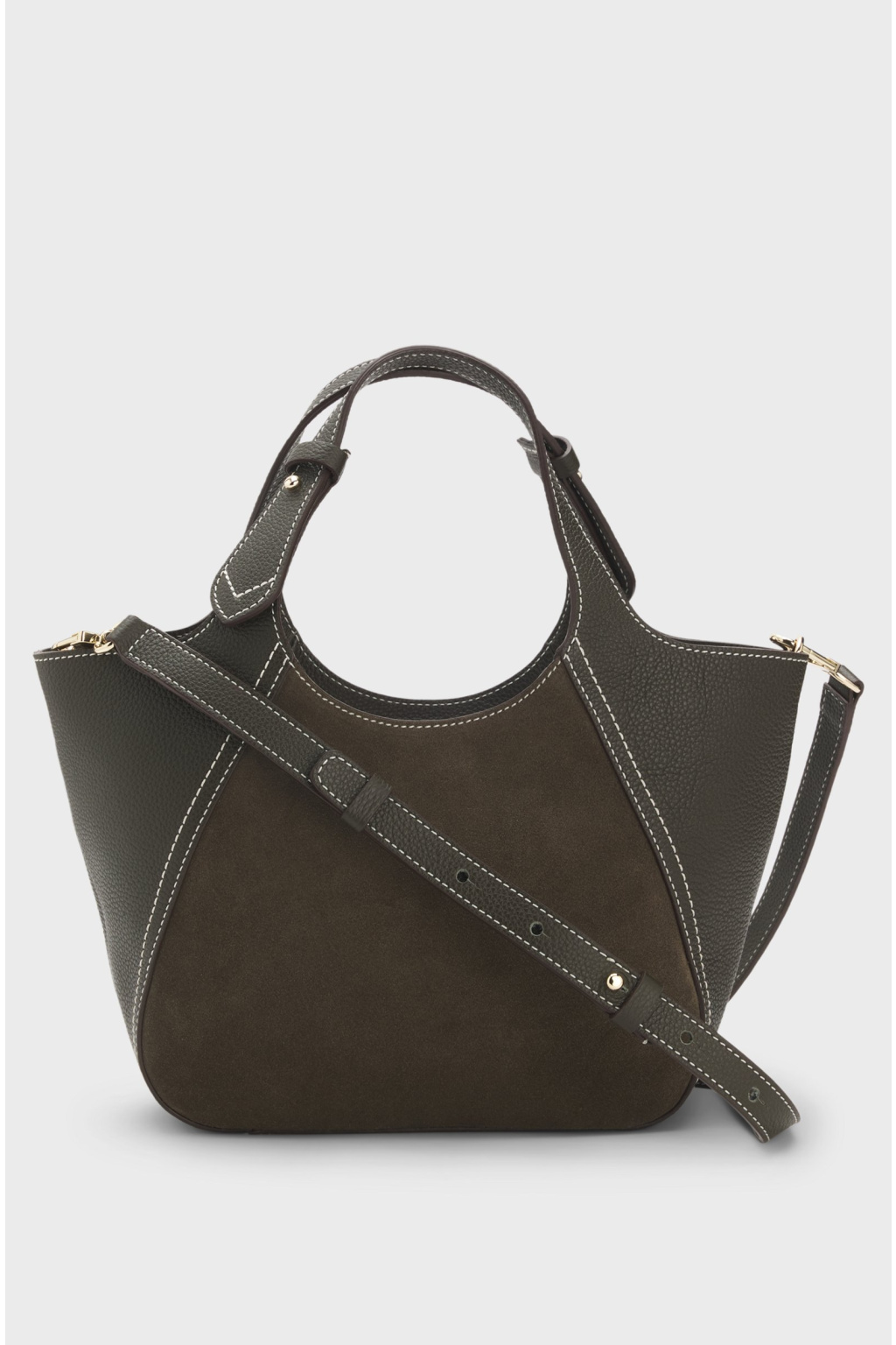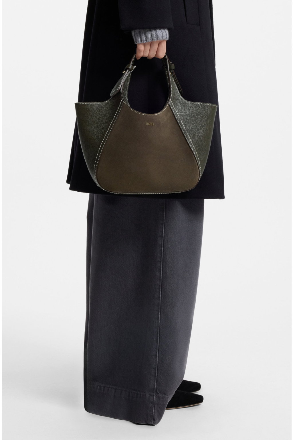 Dámská kabelka menší velikosti od značky BOSS má rozměr 34 x 18 x 9 cm. Model má zapínání na karabinu a uvnitř má kapsičku na zip. Má dvě nastavitelné rukojeti a na přední straně malé logo značky BOSS. Kabelka je vyrobena v kombinaci přírodní a semišové kůže.