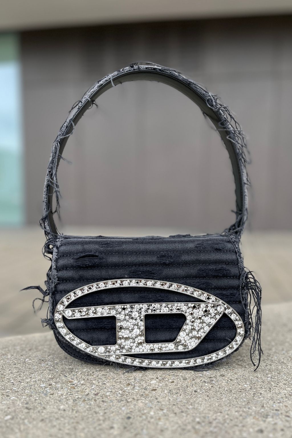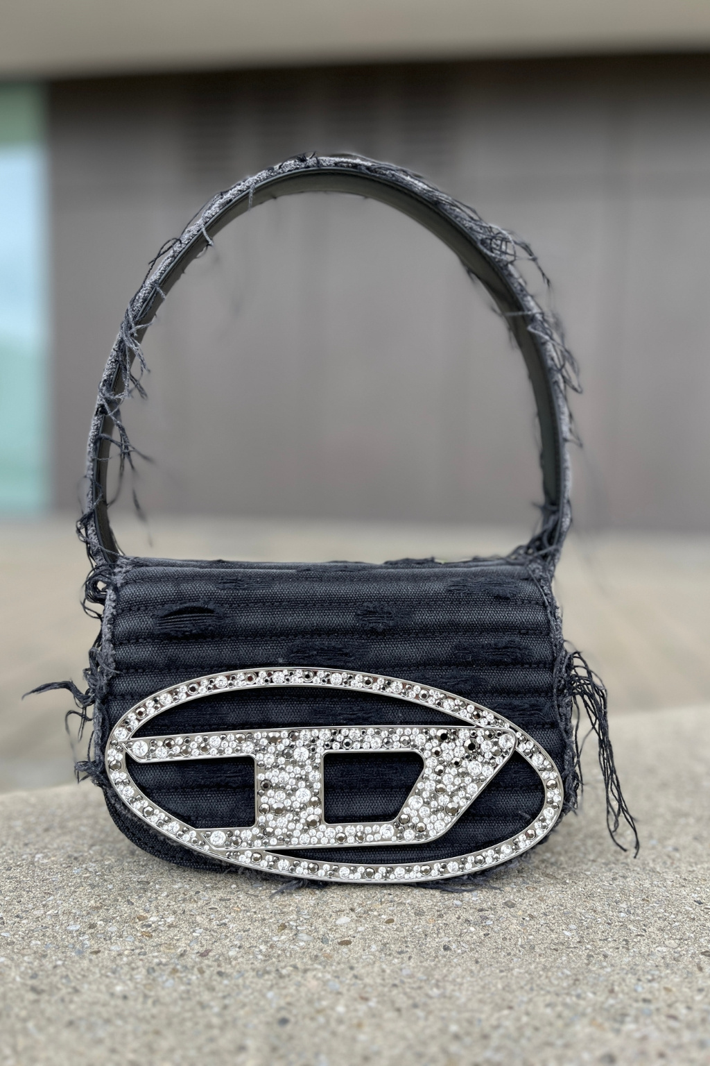 Ikonická dámská kabelka značky DIESEL. Model má poničený vzhled, který kontrastuje s luxusním nádechem. Kabelka je vyrobena z upraveného, prošívaného plátna s visícími roztřepenými nitěmi a koženými detaily. Má na přední straně maxi plaketu ve formě oválného loga písmene D, doplněné o kamínky. Kabelka má odnímatelný crossbody popruh a jedno delší ucho. Má klopu s magnetickým zapínáním a uvnitř přihrádku. Rozměry kabelky jsou 20,5 x 14 cm.