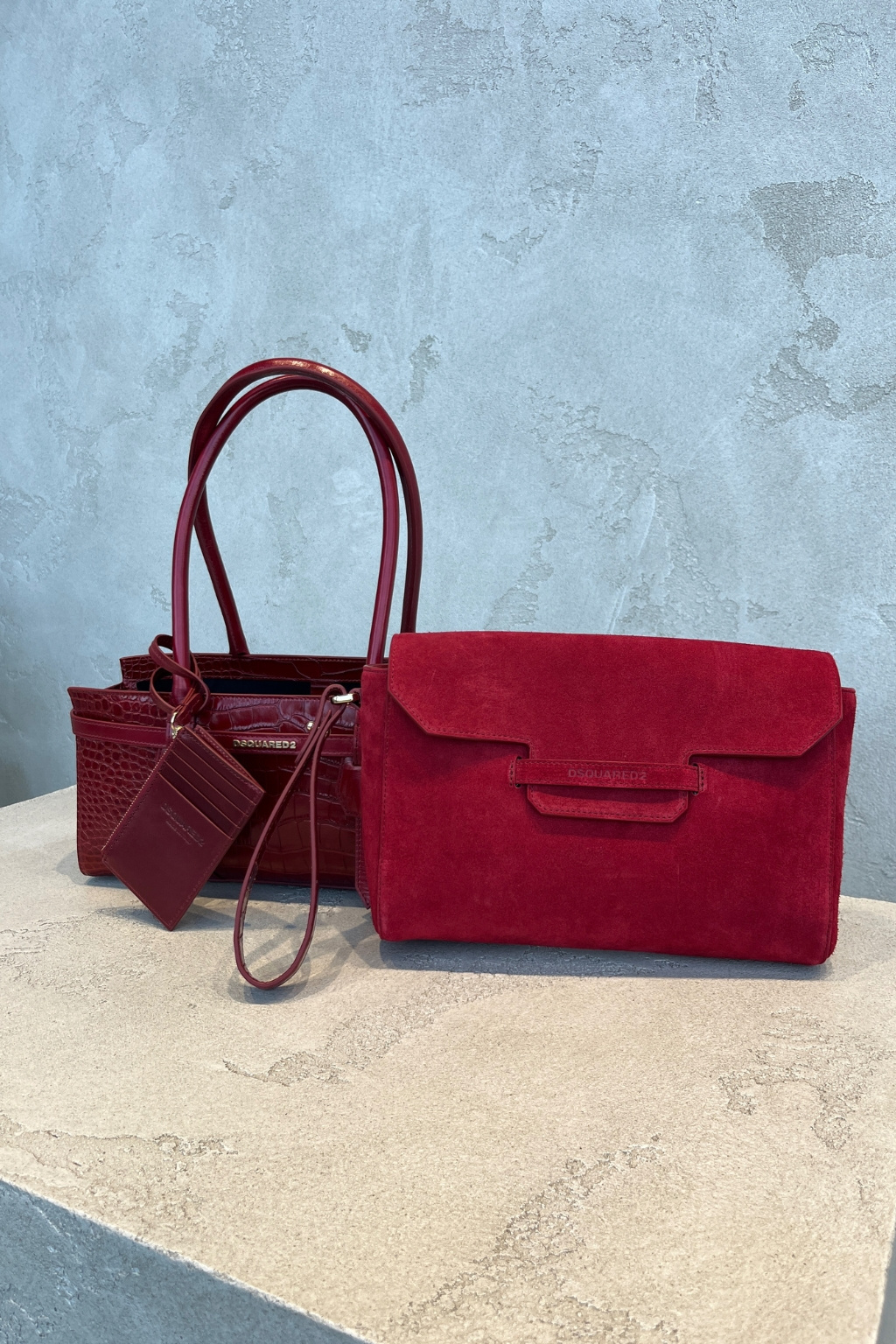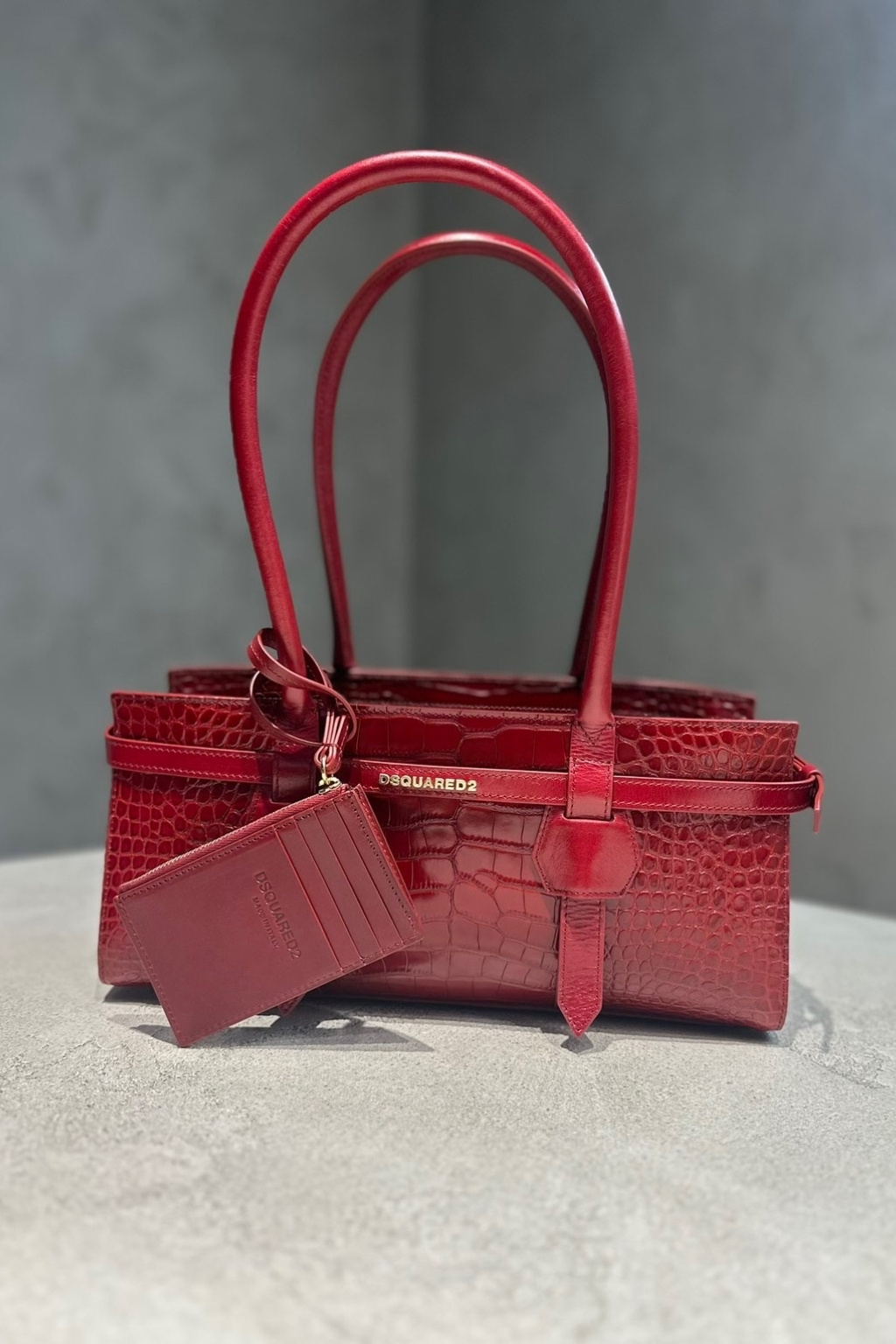 Dámská kabelka značky DSQUARED2 je vyrobena z telecí kůže s krokodýlím motivem. Model má dvě trubkovité rukojeti a na nich odnímatelnou peněženku na zip s kapsičkami na karty. Peněženka má ikonické logo značky DSQUARED. Uvnitř kabelky je odnímatelné semišové pouzdro, uvnitř kabelky je zapínatelná kapsička. Kolem modelu je vodorovný řemínek, na kterém je doplněný nápis značky.