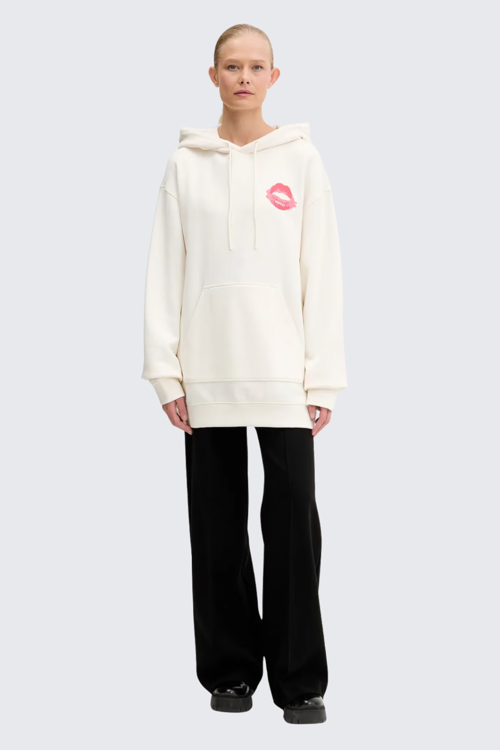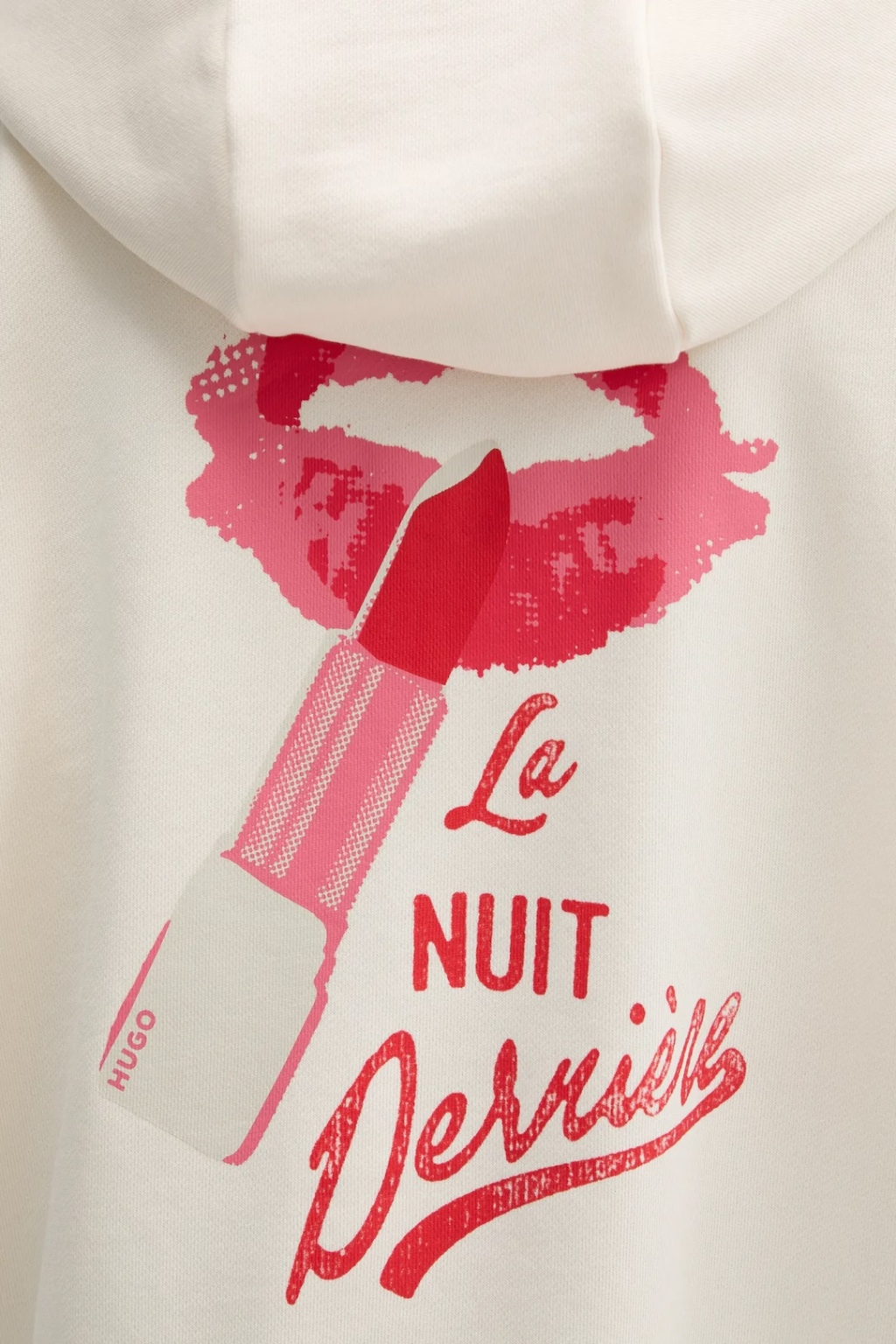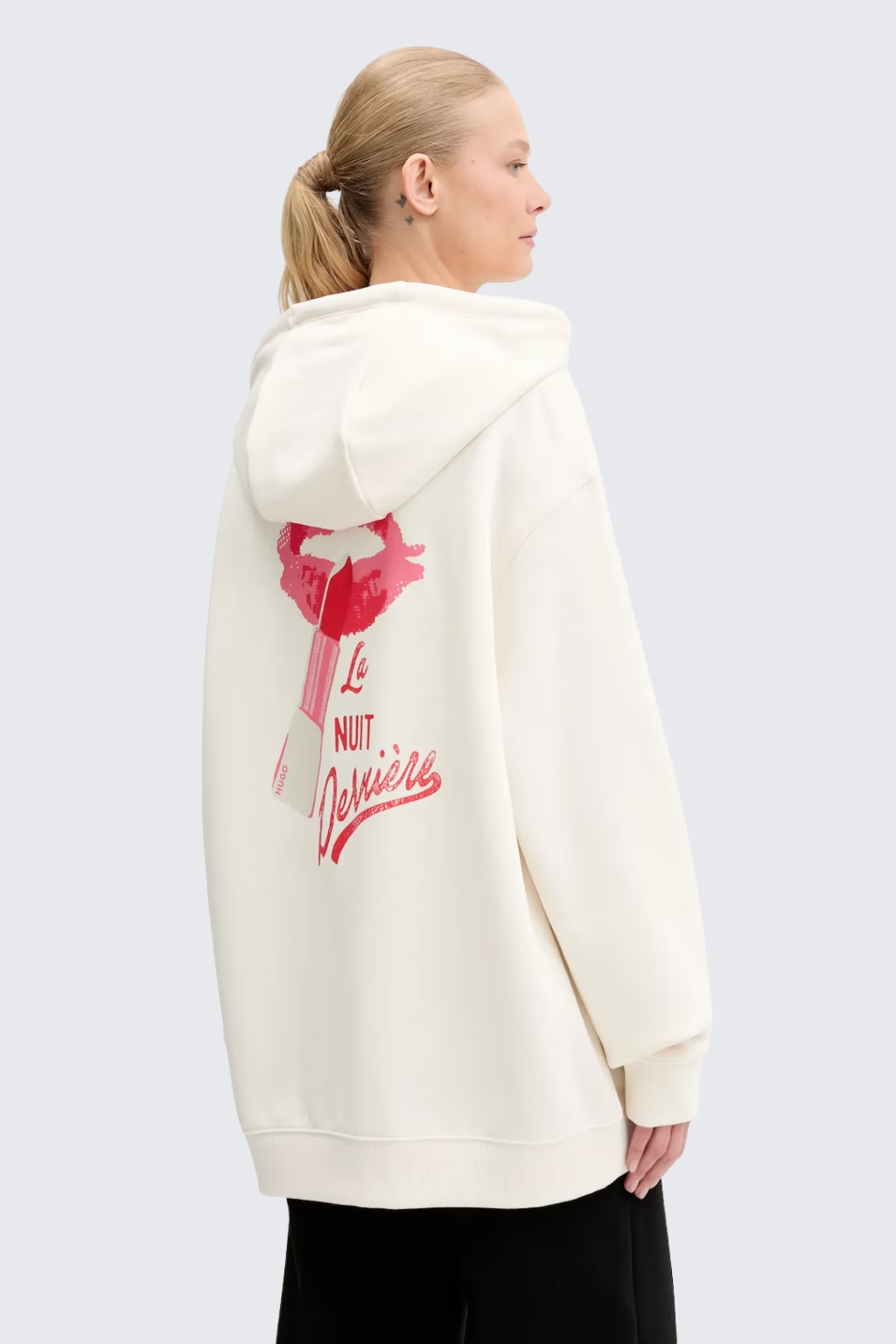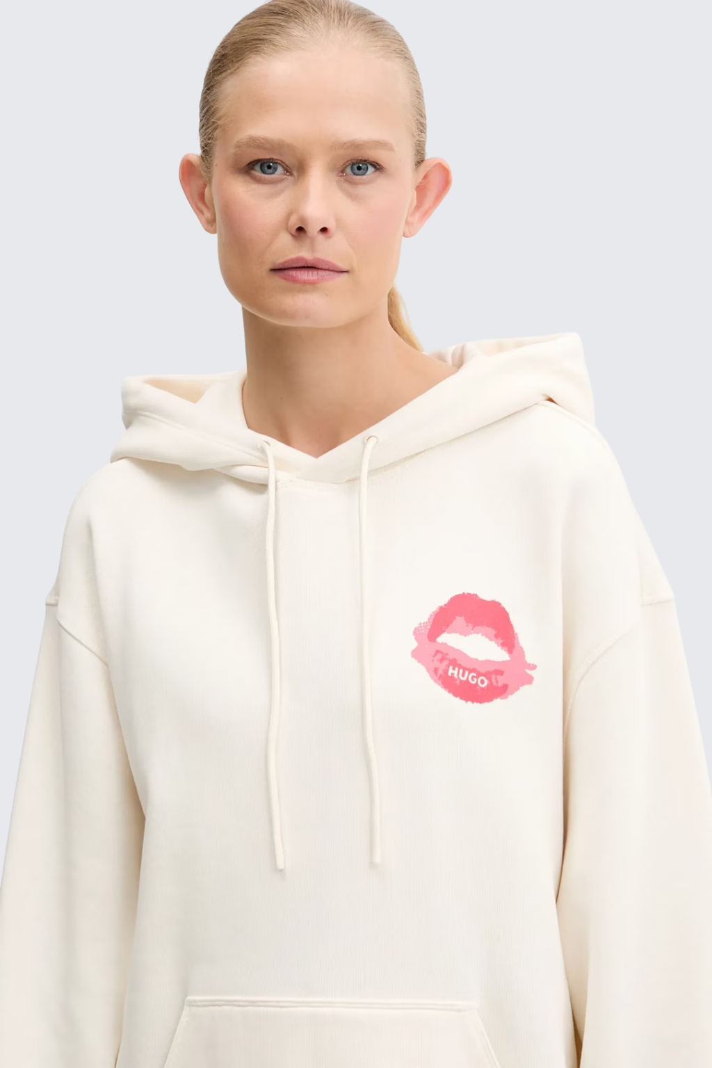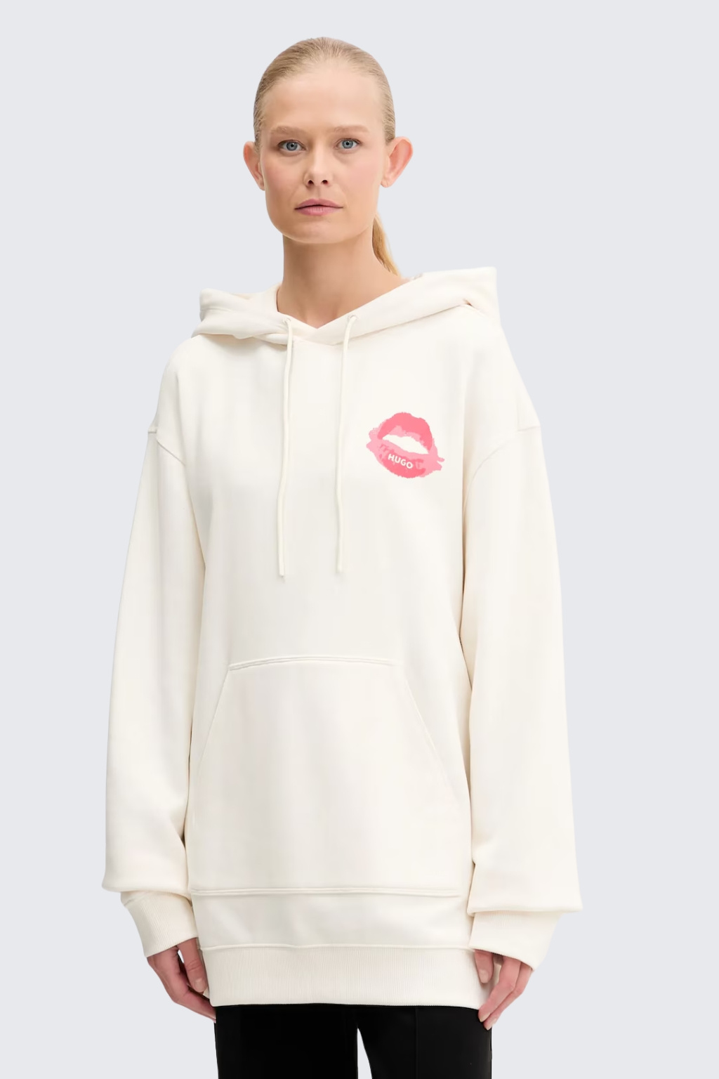 Dámská mikina značky HUGO je volného střihu s kapucí. Model je vyroben z pleteniny s potiskem a je z mimořádně příjemného bavlněného materiálu. Má kapuci se stahovací šňůrkou a velkou klokaní kapsu. Model má sníženou linii ramen a žebrované manžety vespod a na koncích rukávů. Na hrudi je vepředu vlevo malý potisk, doplněný o nápis HUGO a na zadní straně je barevný, velký potisk.