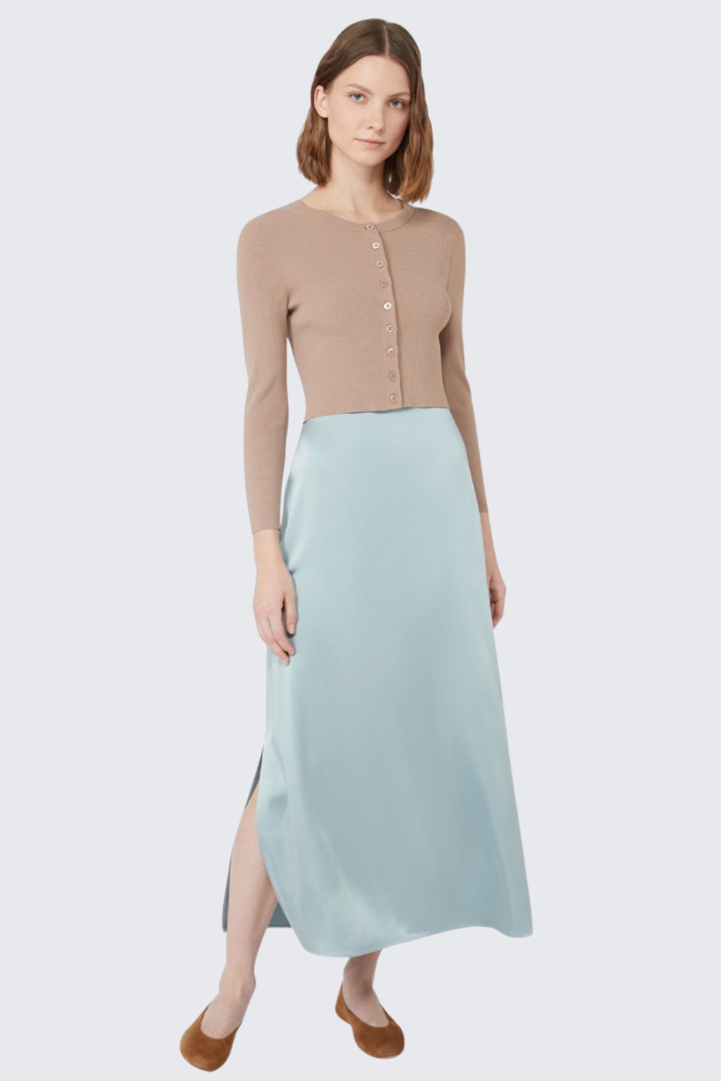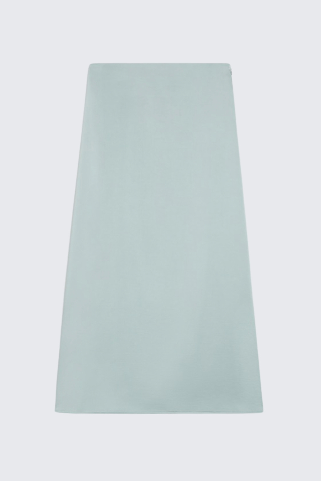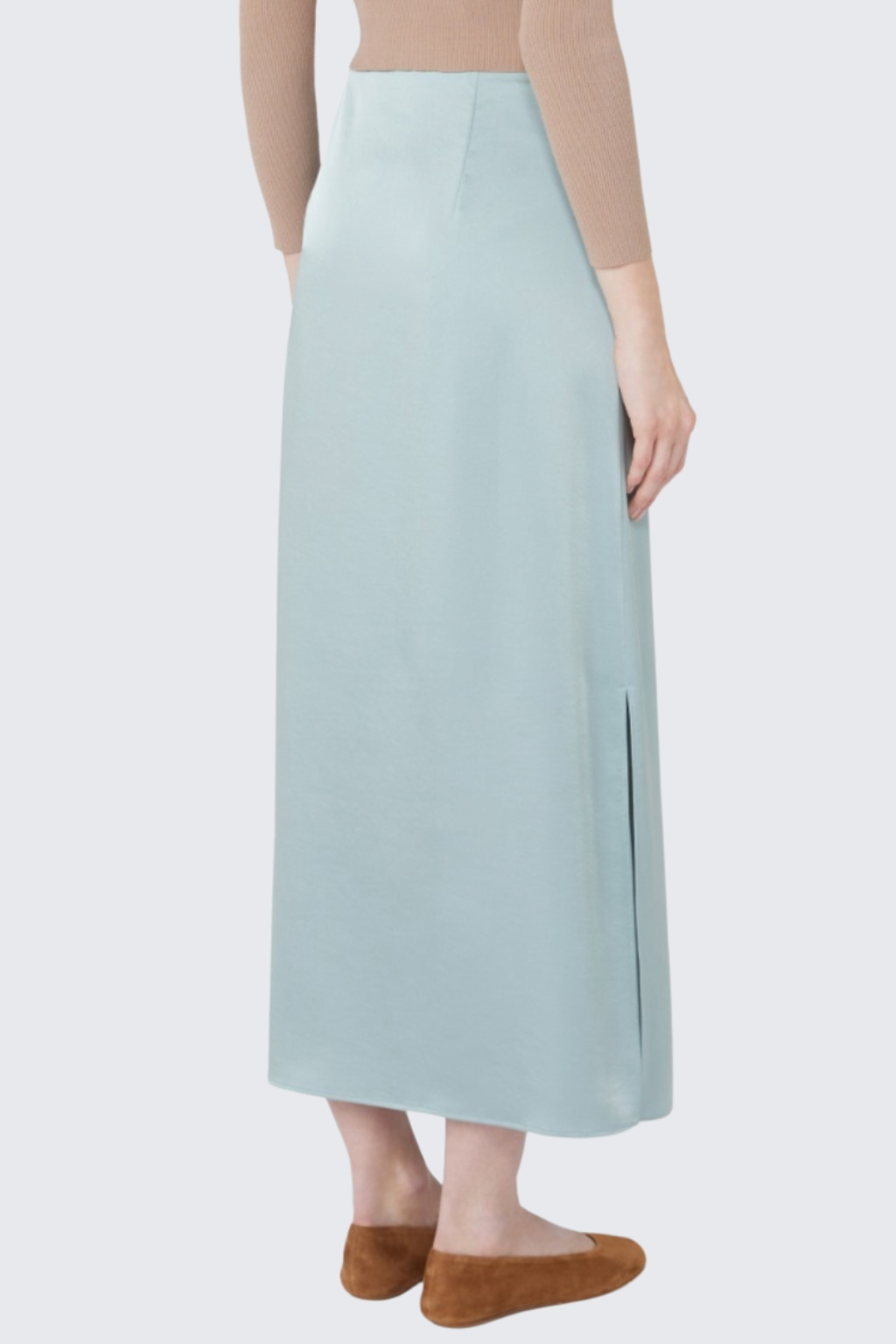 Dámská sukně značky MaxMara má délku nad kotníky. Model je saténového materiálu a má boční zapínání na zip. Sukně má vzadu u pasu všité sklady.