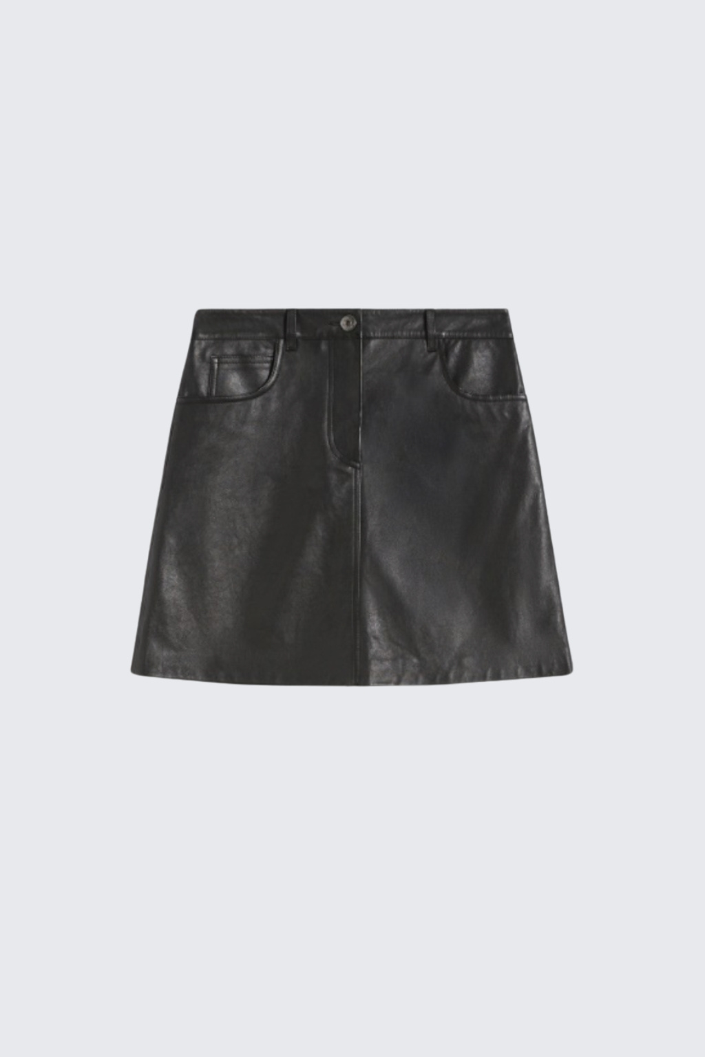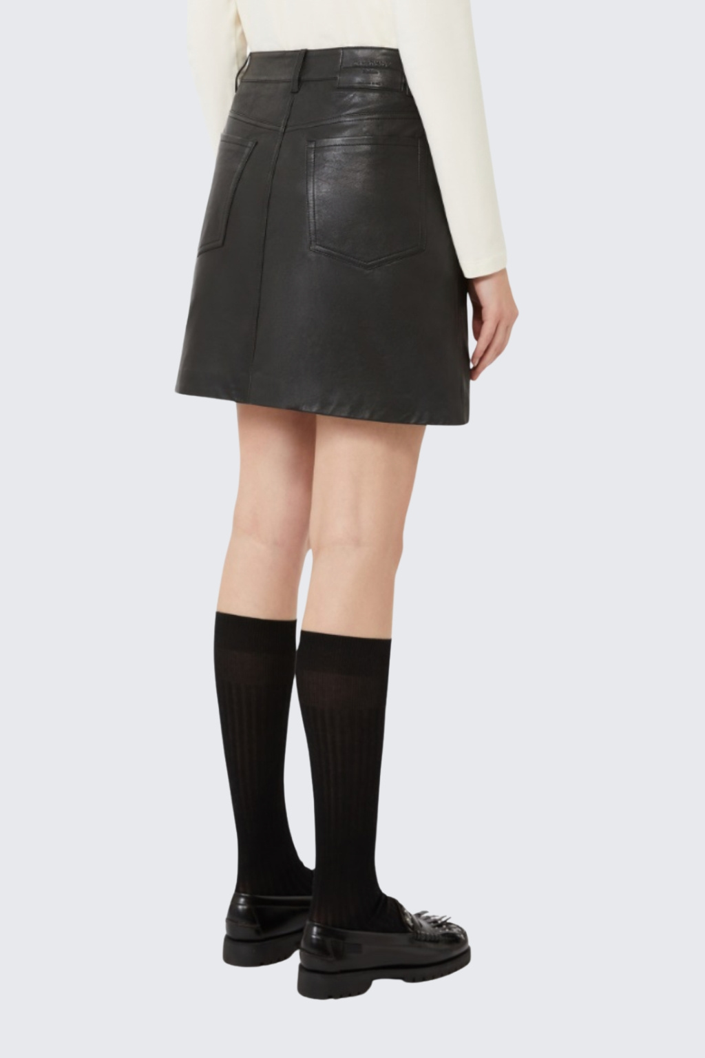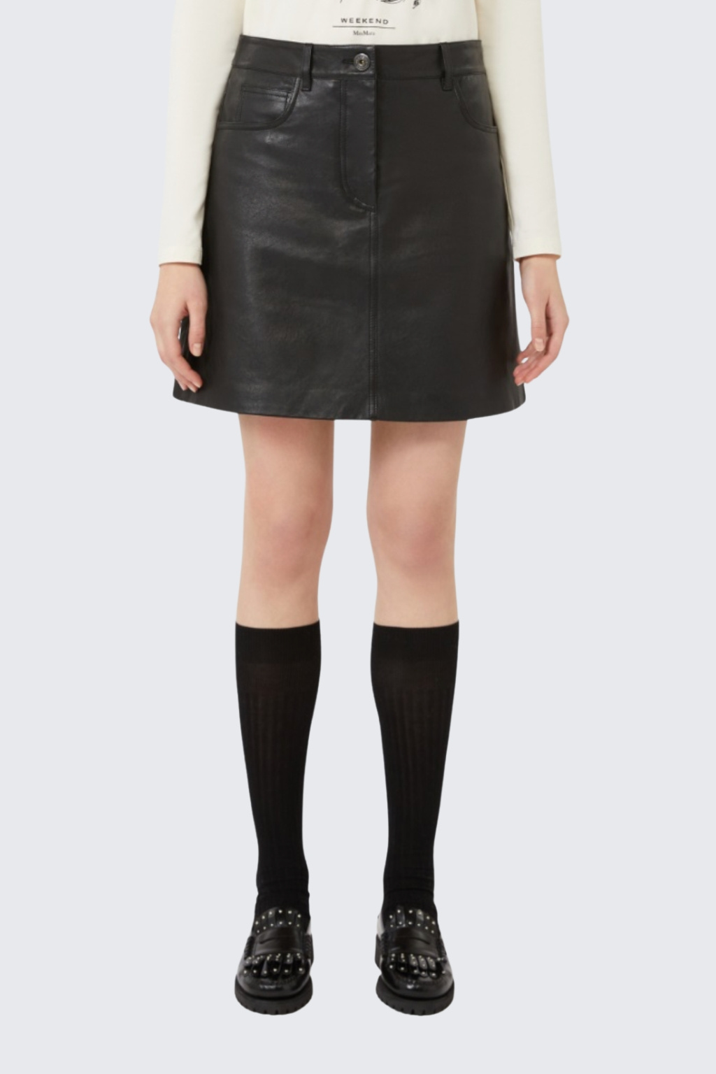 Dámská minisukně značky MaxMara je charakteristická áčkovým střihem. Model má pět kapes, tři na přední straně a dvě zezadu. Sukně je vyrobená z měkké nappa kůže s obnošeným efektem. V pase jsou poutka pro doplnění opasku a na zadní straně je v pase nášivka s logem značky MaxMara. Zapínání je na skrytý zip a knoflík.