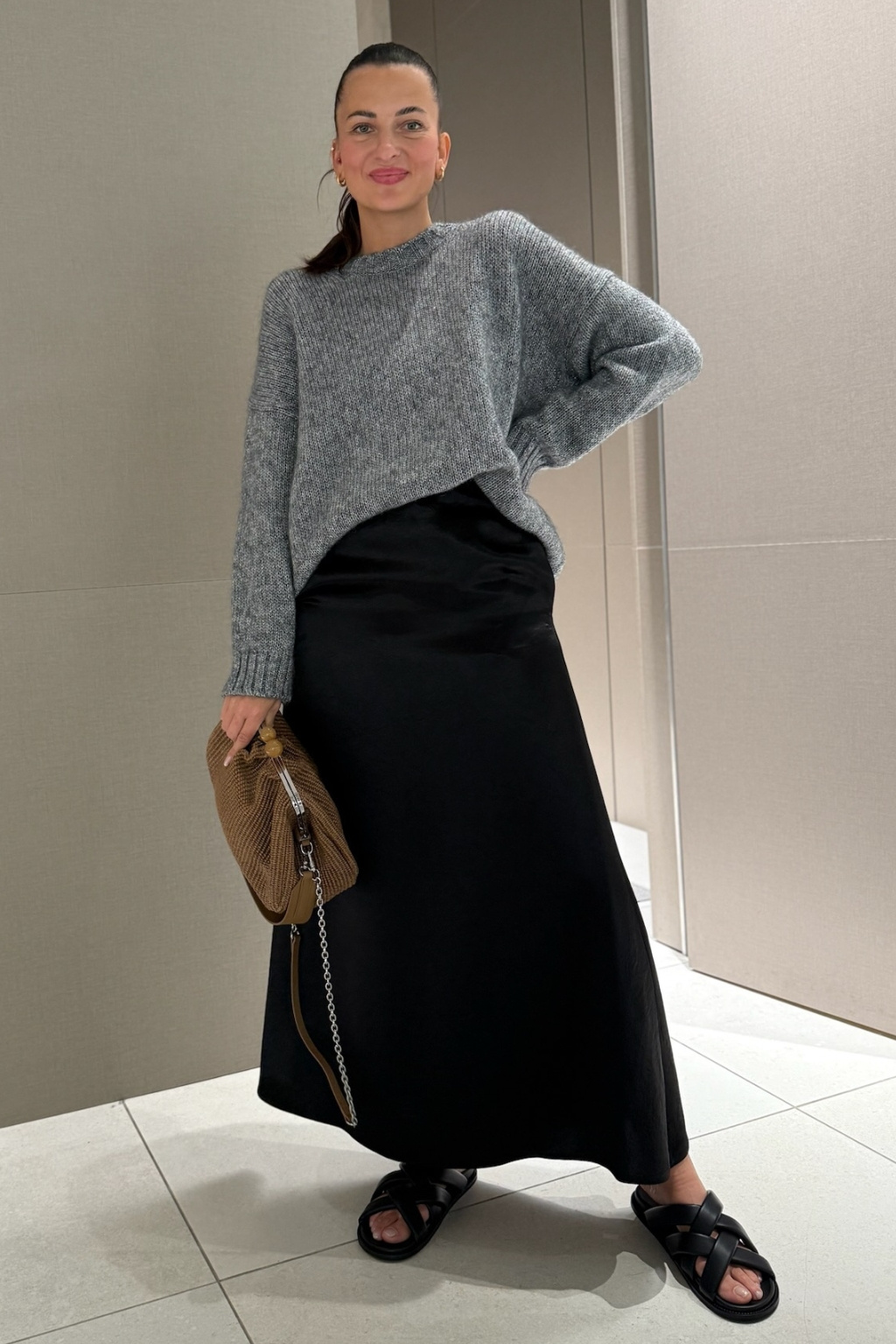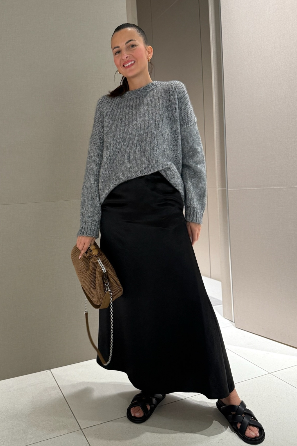 Dámská sukně značky MaxMara má maxi délku a regular fit střih. Model má v pase elastickou manžetu a po stranách dvě šikmo střižené, průhmatové kapsy.