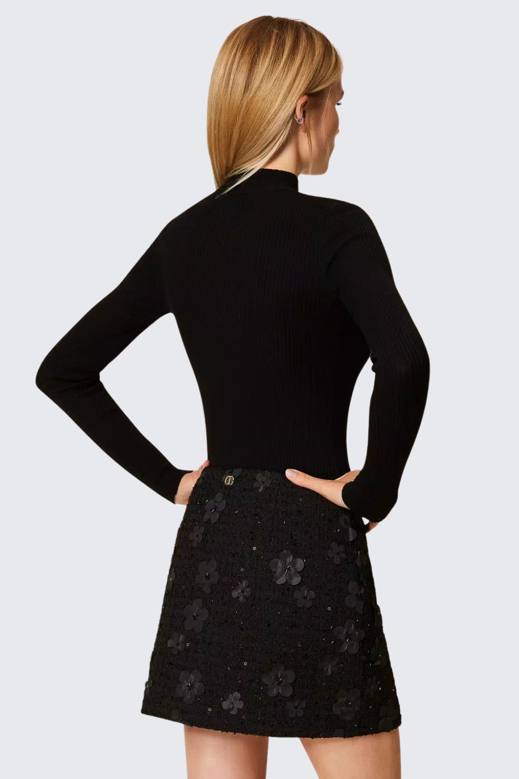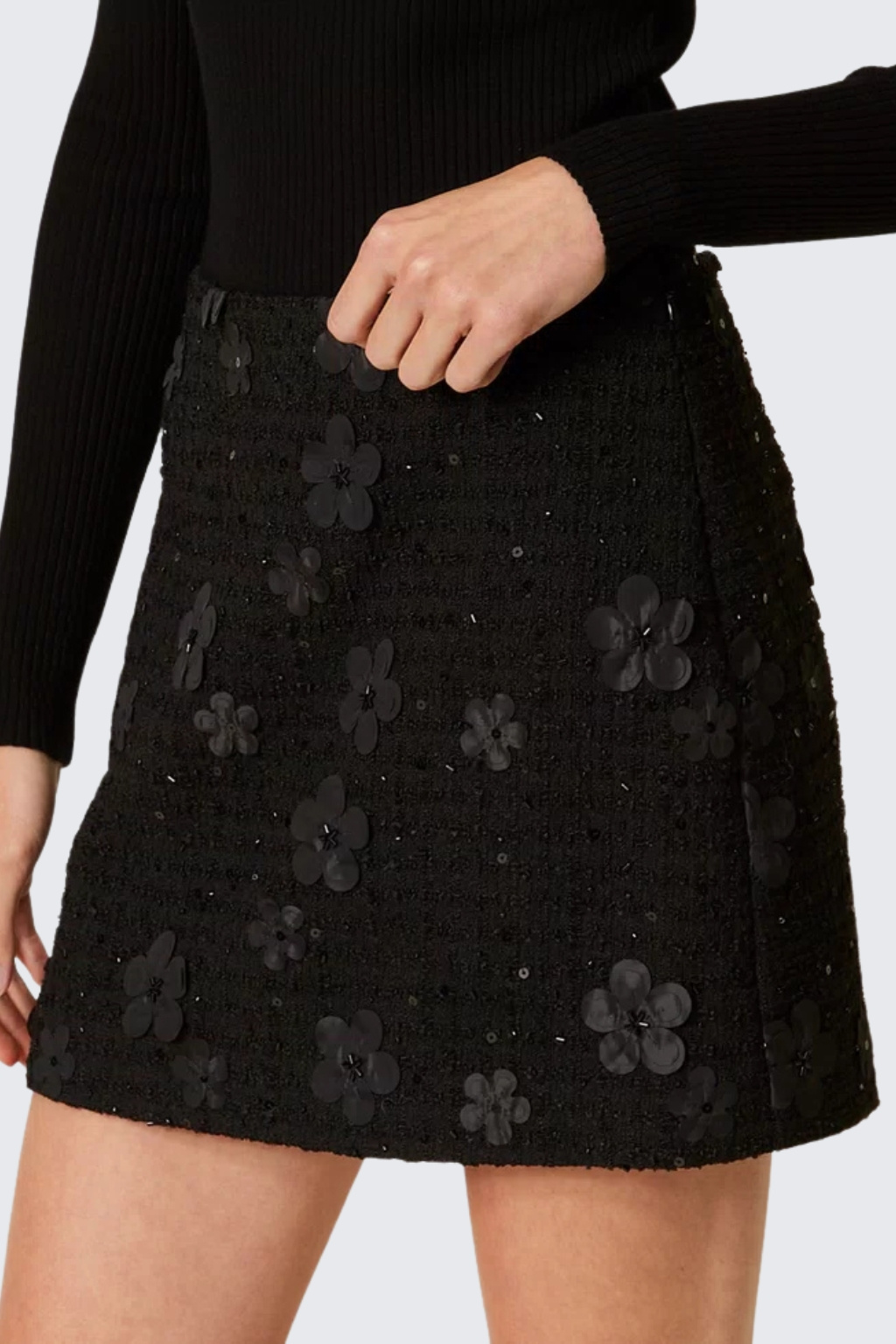 Dámská sukně značky TWINSET je vyrobena z tkaniny s kamínkovou a květovanou aplikací. Sukně má mini délku a skryté zapínání na zip a háček na boku.