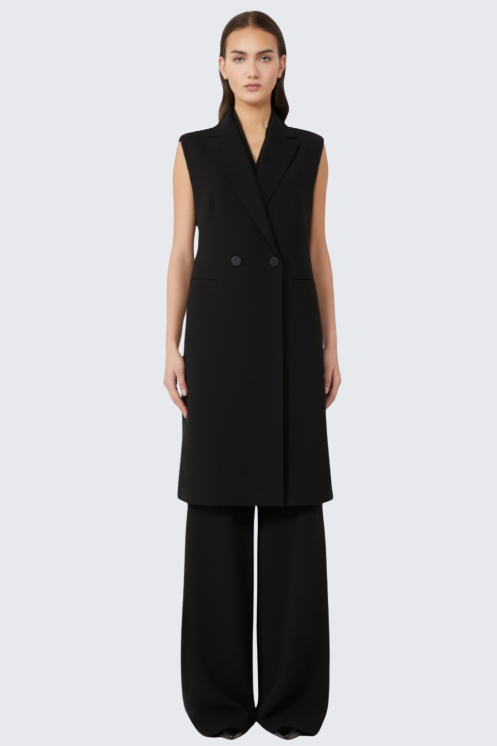 Dámská dlouhá vesta značky MaxMara má dvouřadé zapínání na knoflíky a špičaté klopy. Model má široká ramínka a rovný střih. Vesta má přední lemované kapsy a podšívku.