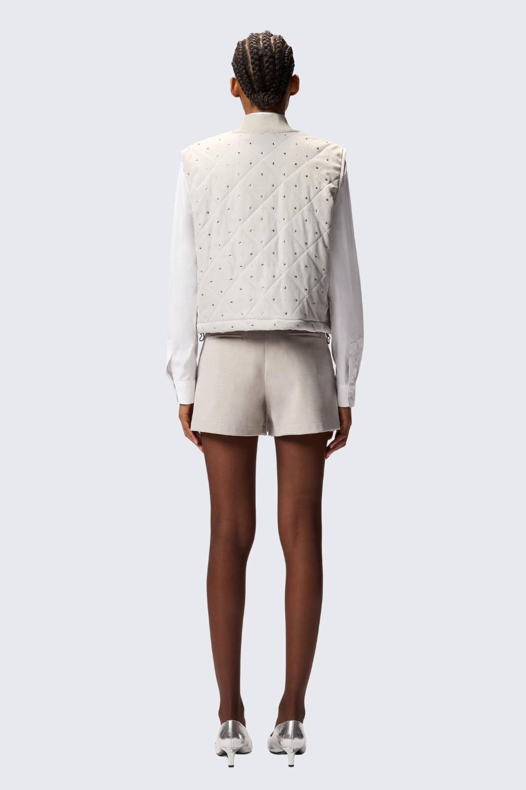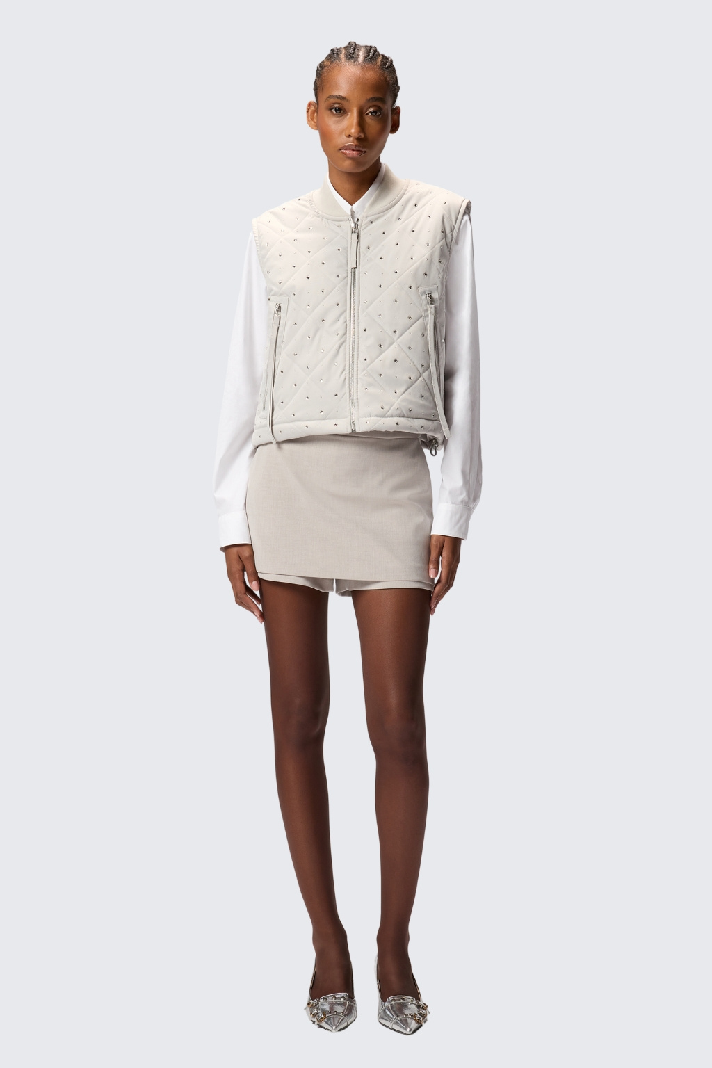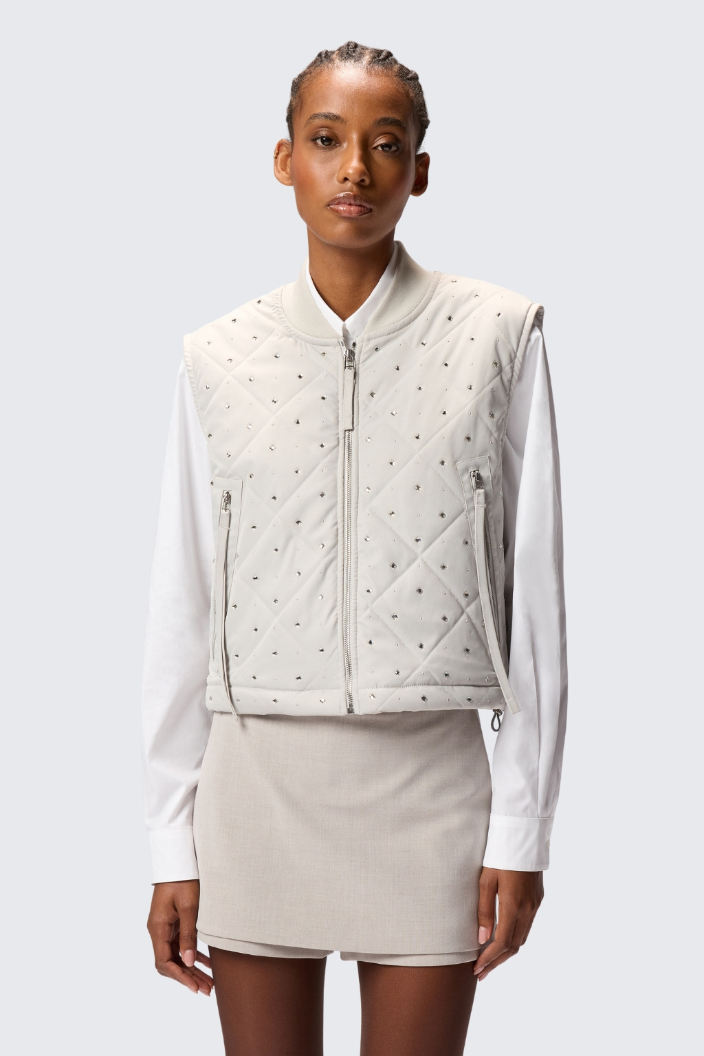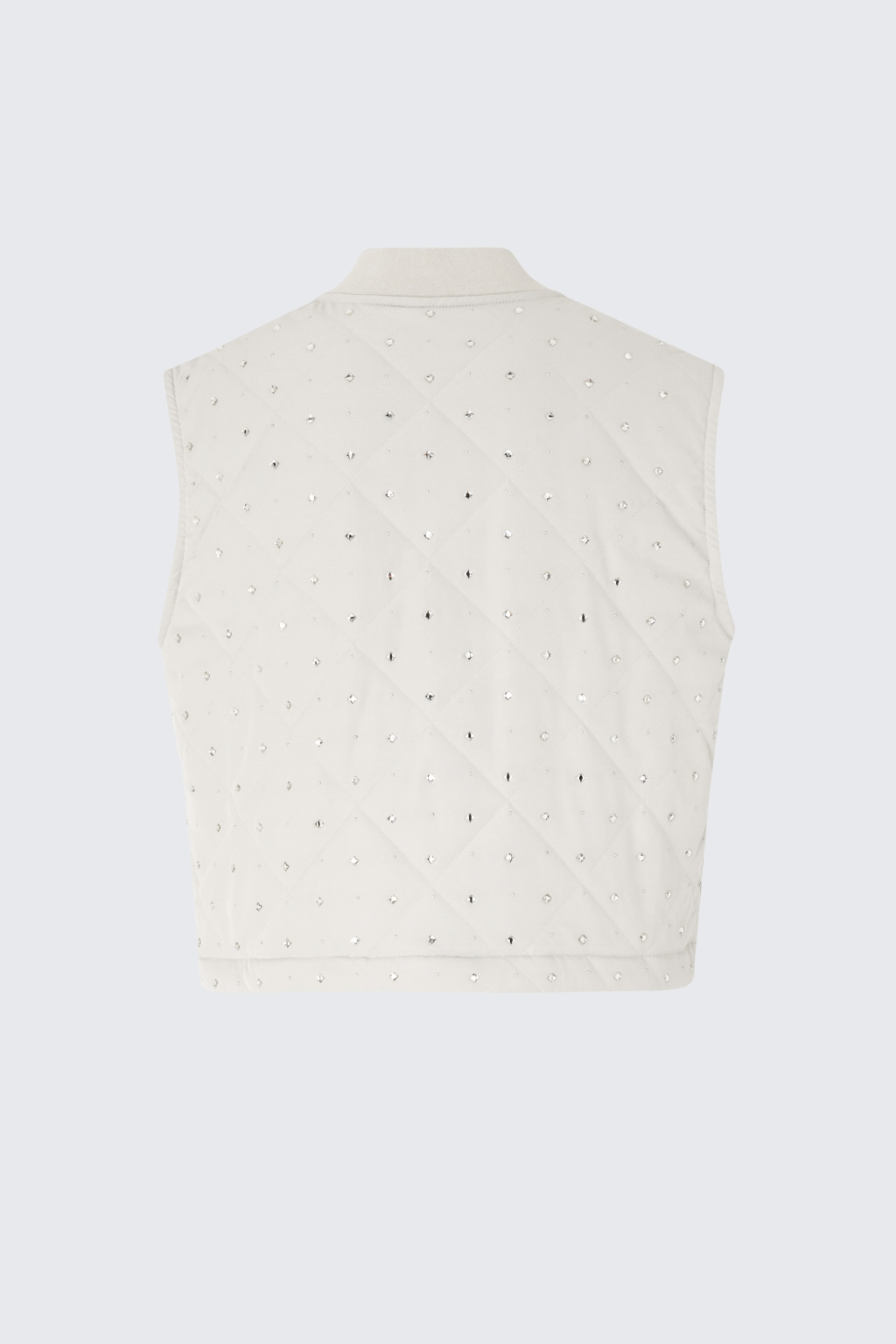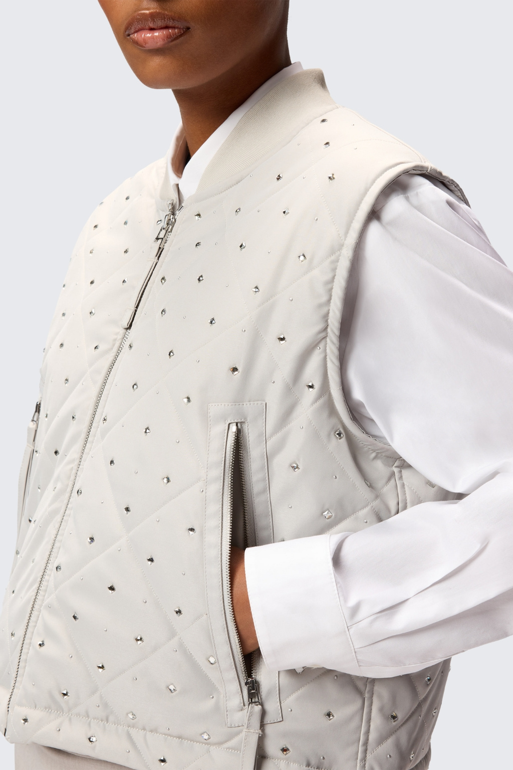 Dámská prošívaná vesta značky PINKO je vyrobená z matného keprového materiálu. Model je vzorovaný diamantovými kamínky ve dvou velikostech z obou stran. Model má zapínání na zip po celé své délce a u krku má krátký stojáček. Po stranách má dvě kapsy na zip a ve spodním lemu vesty je stahovací gumička.