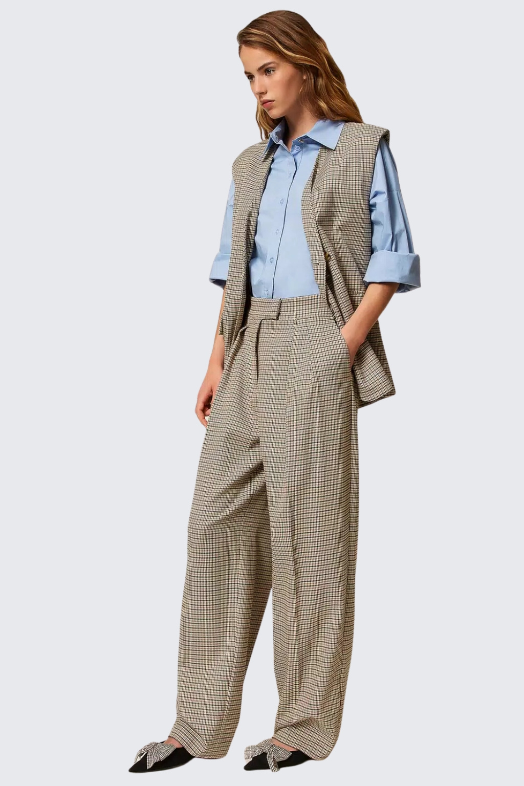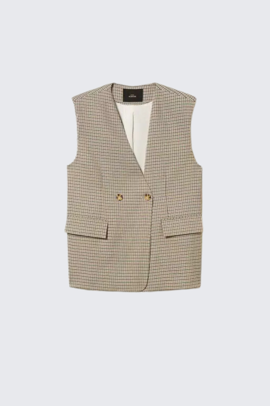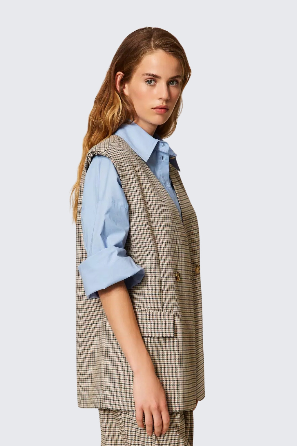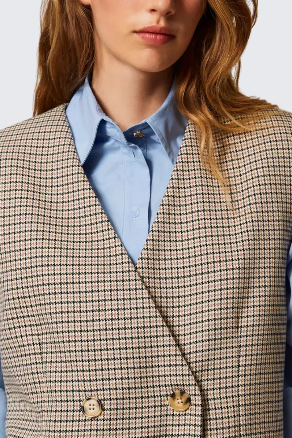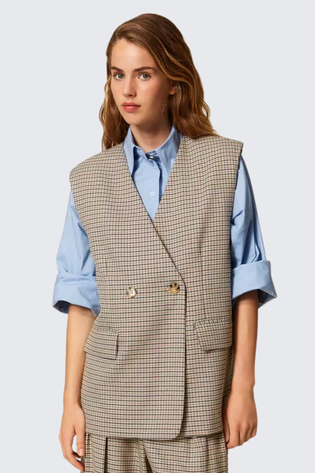 Dámská vesta značky TWINSET má rovný střih a dvouřadé zapínání na knoflíky. Vesta má široká ramínka, véčkový výstřih a po stranách dvě kapsy s klopami. Na zadní straně je uprostřed krátký rozparek a u krku malá nášivka s písmenem A.