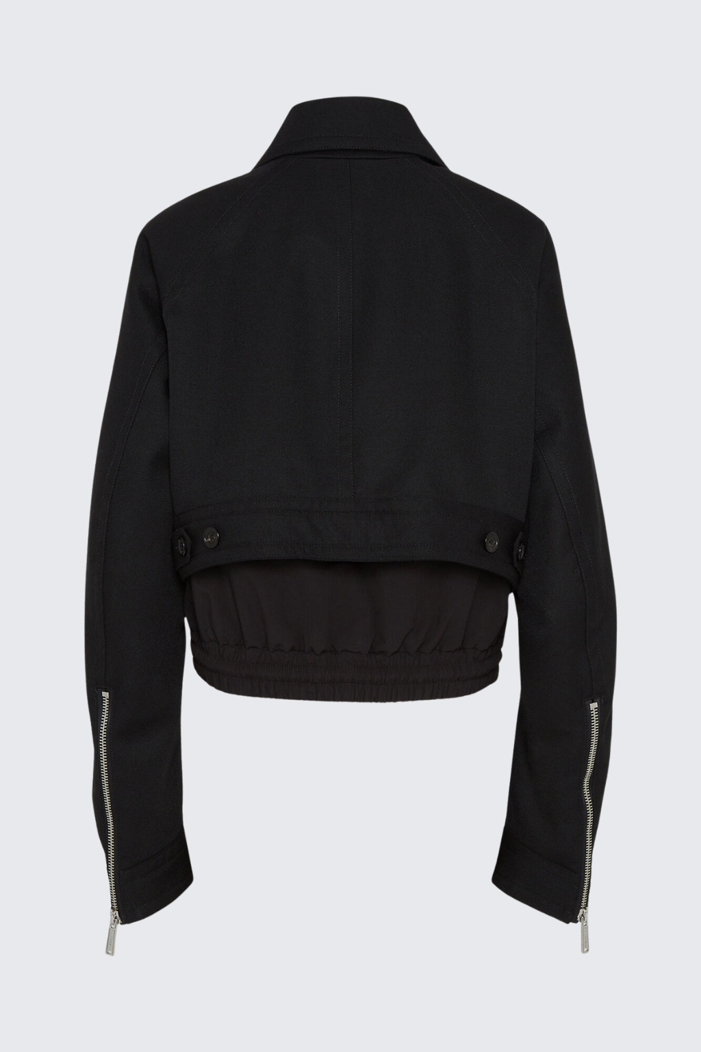 Dámská bunda značky DSQUARED2 je vyrobena z vlněného materiálu. Model má zkrácenou délku, košilový límeček a dlouhé rukávy. Bundička má zapínání na zip a spodní vrstva má vespod stahovací šňůrku a druk. Na hrudi jsou dvě prostorné náprsní kapsy s klopou a knoflíkem. Rukávy mají sníženou linii ramen a na koncích rukávů je krátké zapínání na zip a manžeta. V pase jsou na zadní straně řemínky.