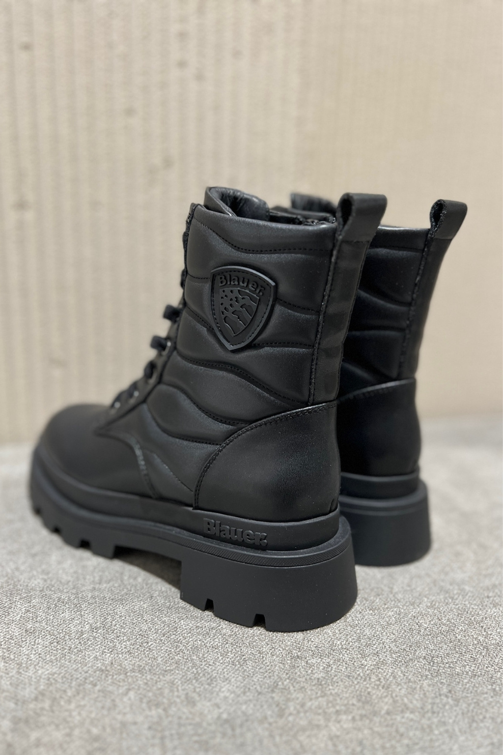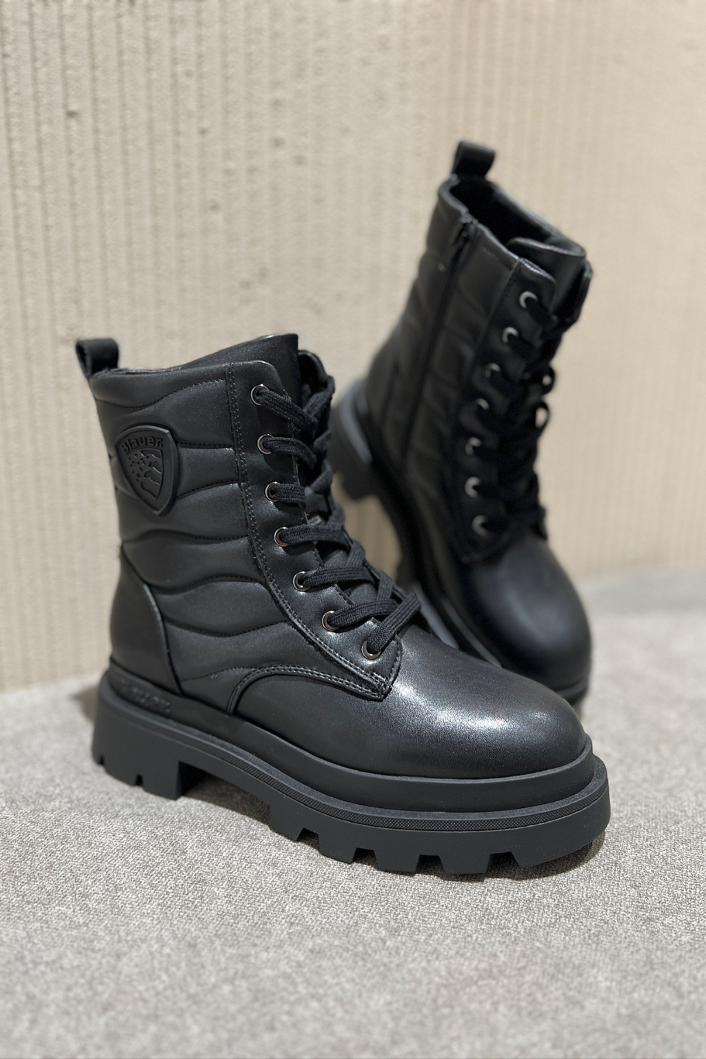 Dámské kotníkové boty z kolekce Blauer. Model je vyroben v kombinaci přírodní a eko kůže. Model má gumovou, vroubkovanou podrážkou a široký nízký klínek. Model má vyztuženou špičku a patu, celá bota je vlnkovitě prošívaná. Na zadní straně je poutko pro snadné nazouvání. Boty se zavazují na ploché tkaničky. Na vnější straně je erb s logem značky BLAUER.