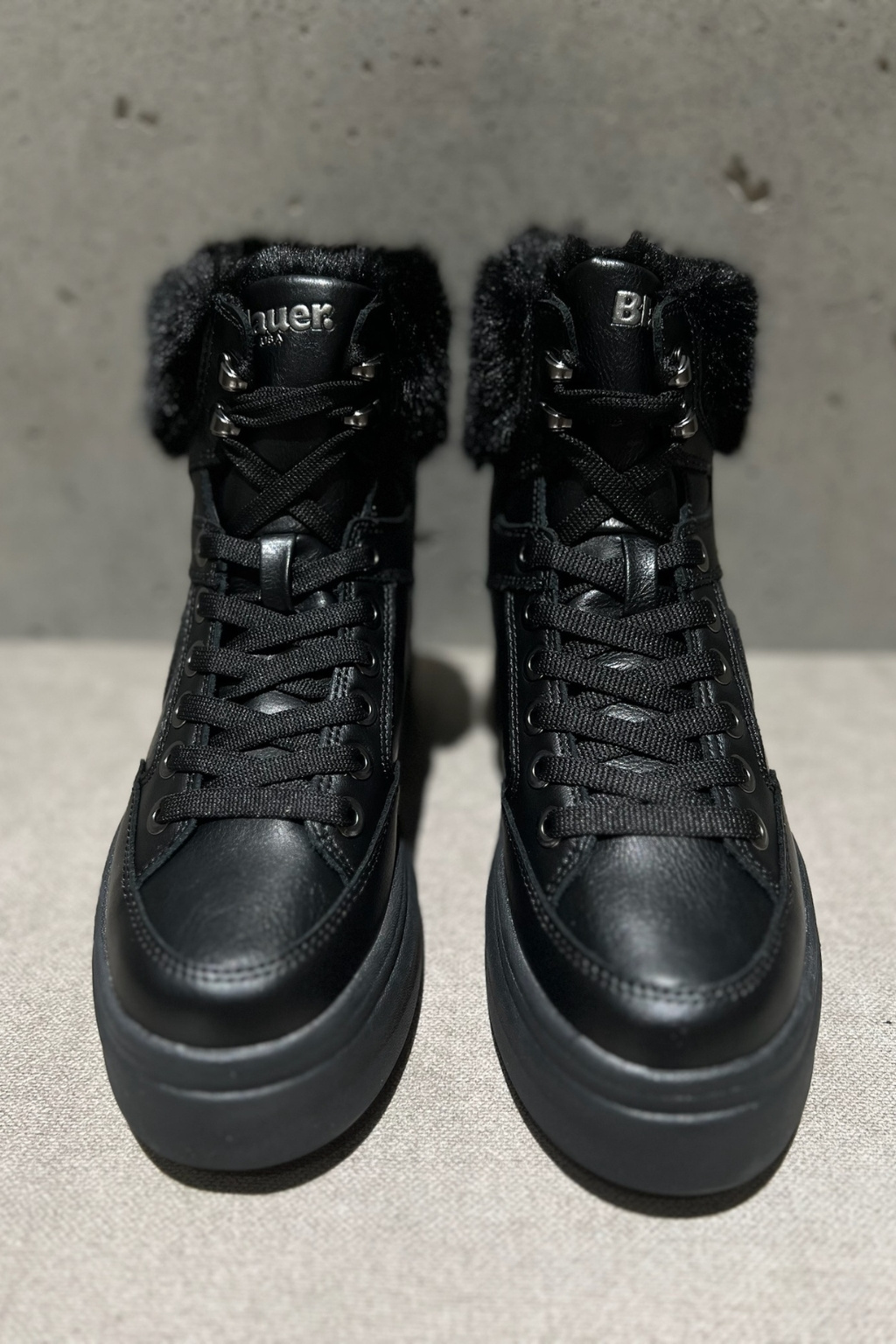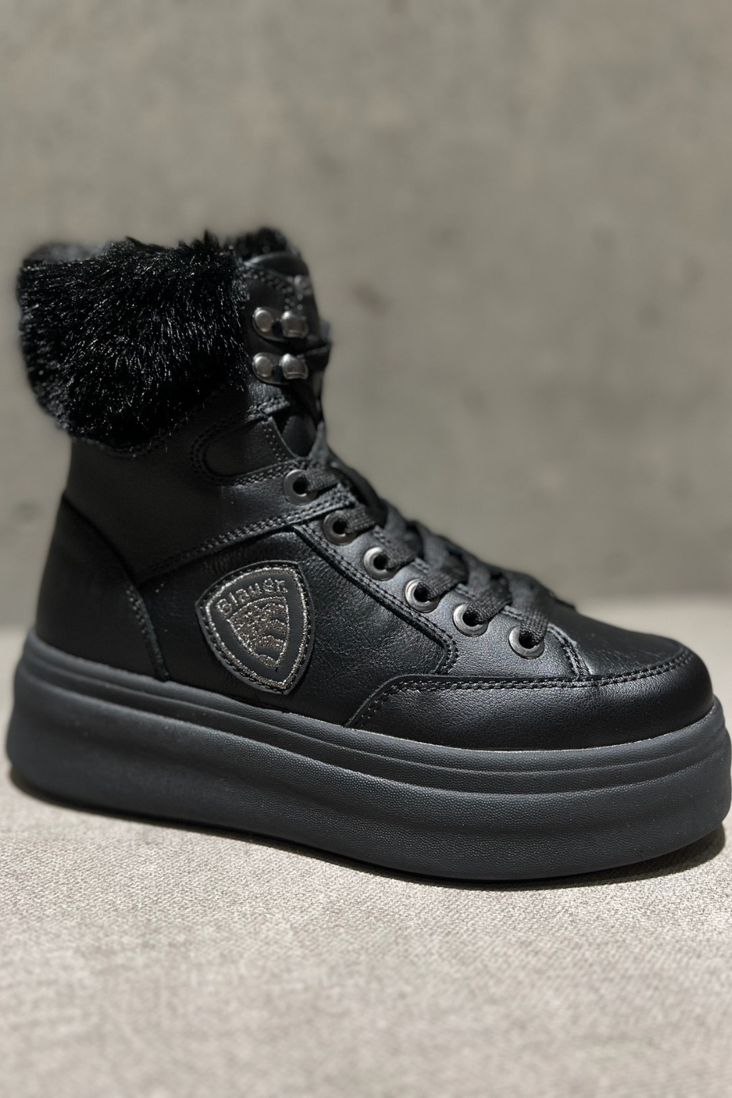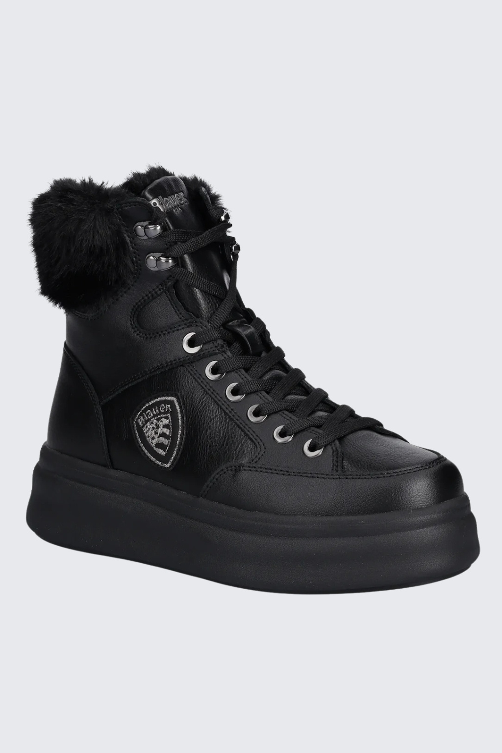 Dámské kotníkové boty značky BLAUER jsou zateplené kožíškem. Model je vyroben z kombinace semišové kůže, ekologické kůže a textilního materiálu. Boty mají vyztuženou patu a kulatou špičku. Zavazování je na ploché tkaničky. Na vnější straně boty je logo značky BLAUER ve tvaru erbu. Boty mají vroubkovanou podrážku a 5 cm platformu.