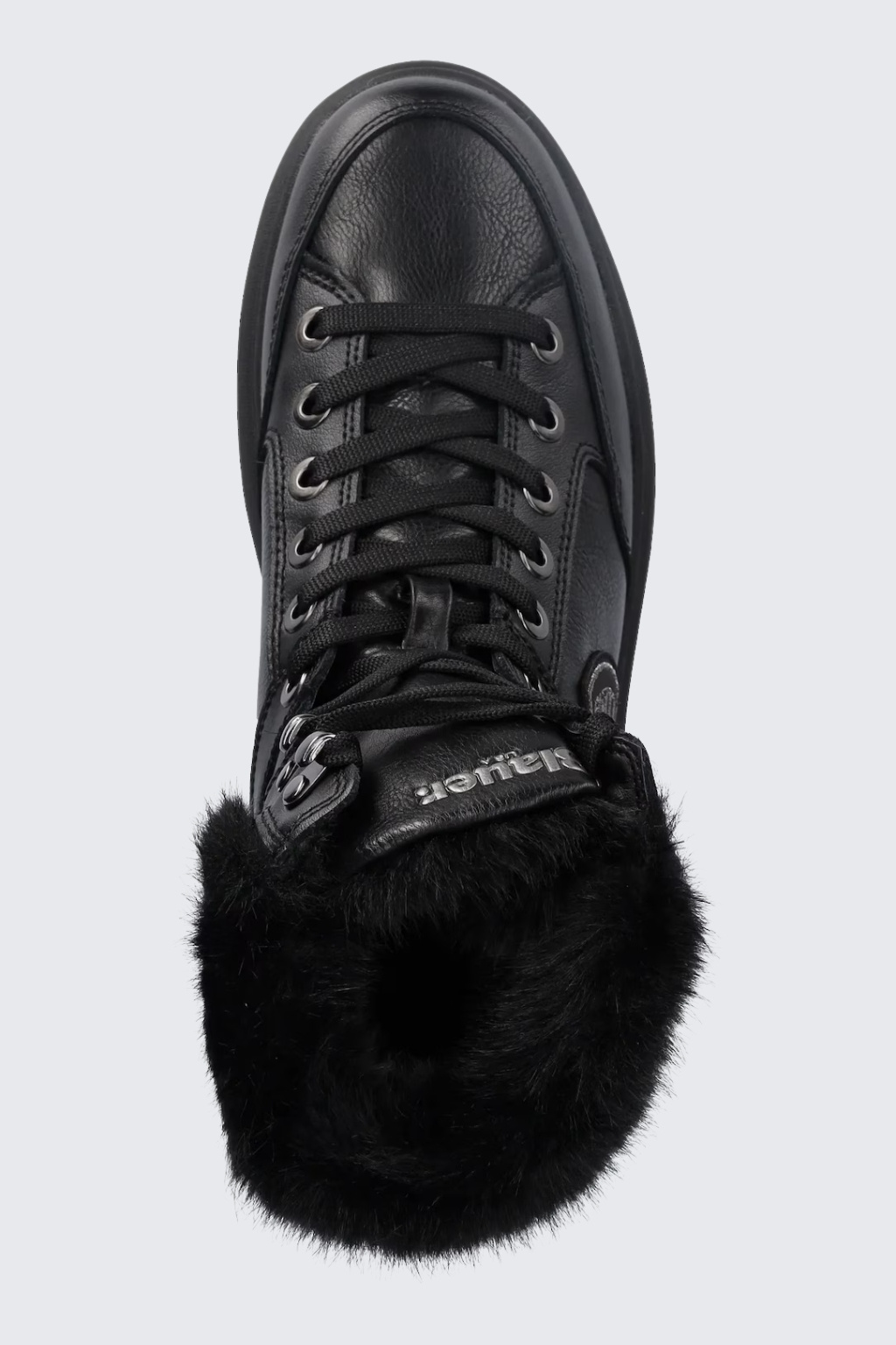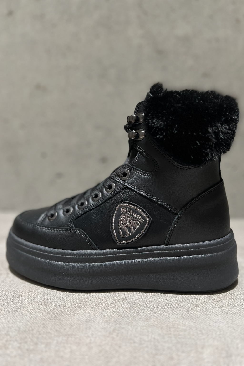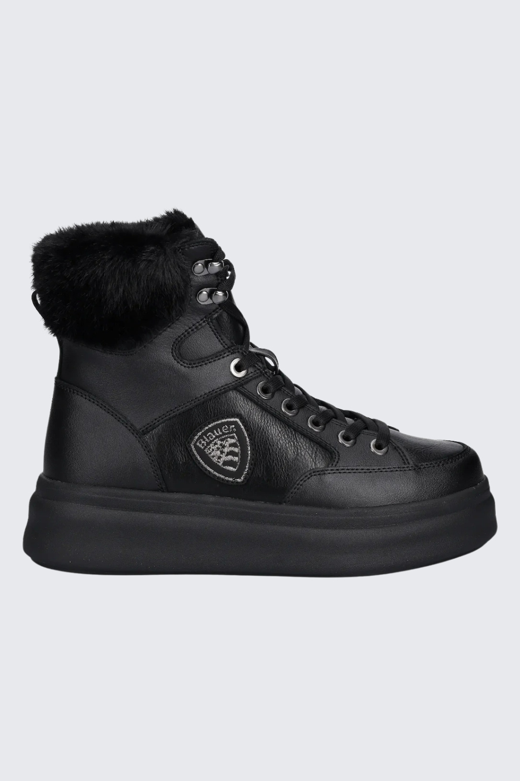 Dámské kotníkové boty značky BLAUER jsou zateplené kožíškem. Model je vyroben z kombinace semišové kůže, ekologické kůže a textilního materiálu. Boty mají vyztuženou patu a kulatou špičku. Zavazování je na ploché tkaničky. Na vnější straně boty je logo značky BLAUER ve tvaru erbu. Boty mají vroubkovanou podrážku a 5 cm platformu.