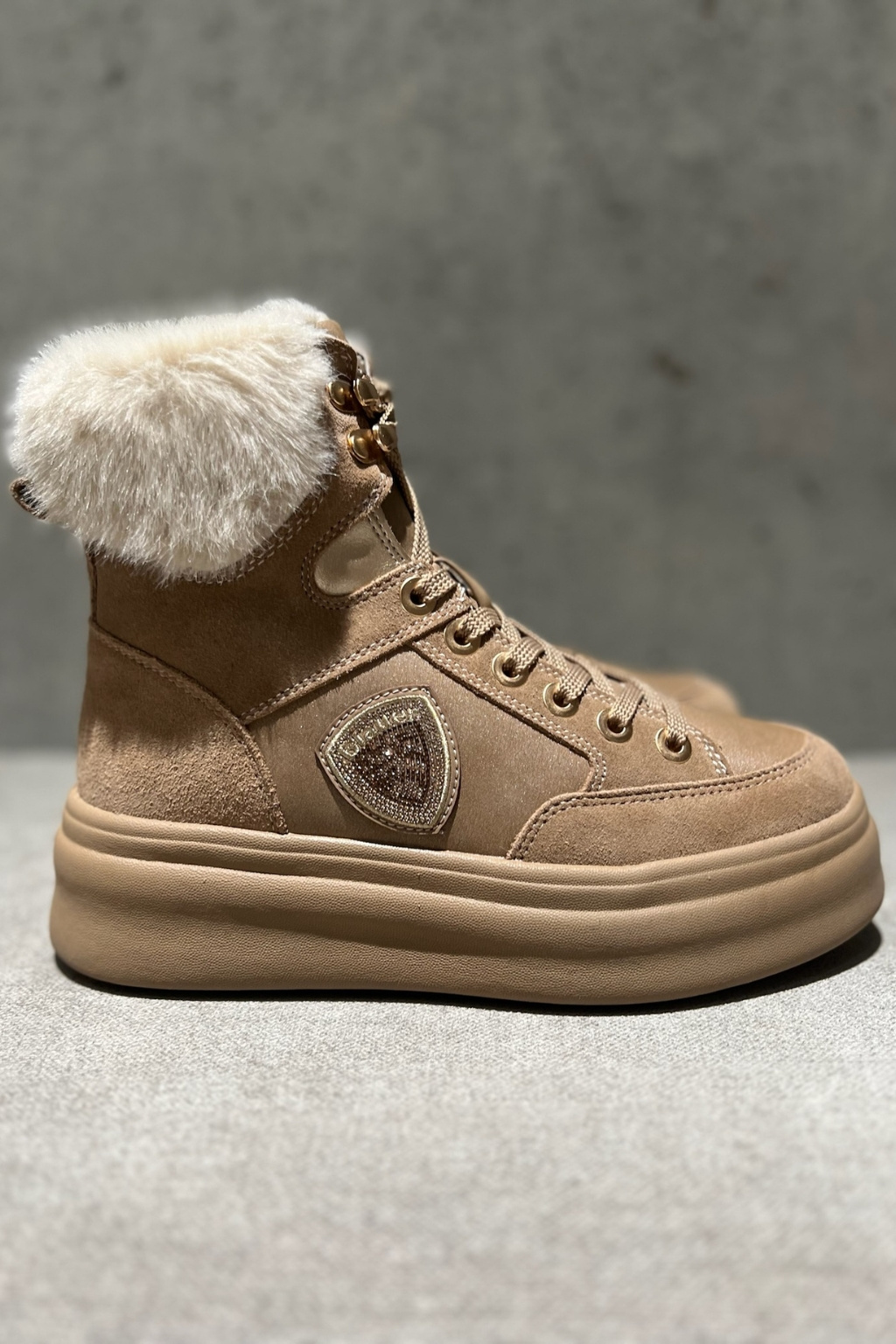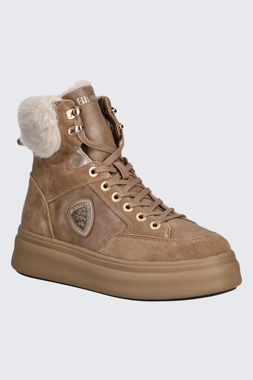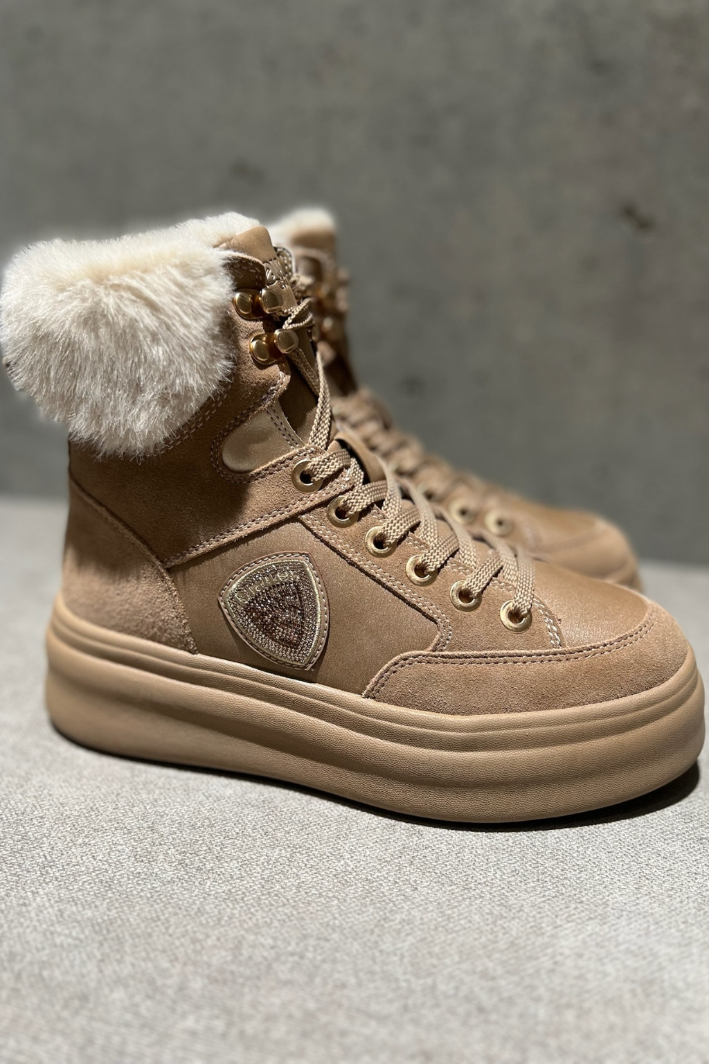 Dámské kotníkové boty značky BLAUER jsou zateplené kožíškem. Model je vyroben z kombinace semišové kůže, ekologické kůže a textilního materiálu. Boty mají vyztuženou patu a kulatou špičku. Zavazování je na ploché tkaničky. Na vnější straně boty je logo značky BLAUER ve tvaru erbu. Boty mají vroubkovanou podrážku a 5 cm platformu.