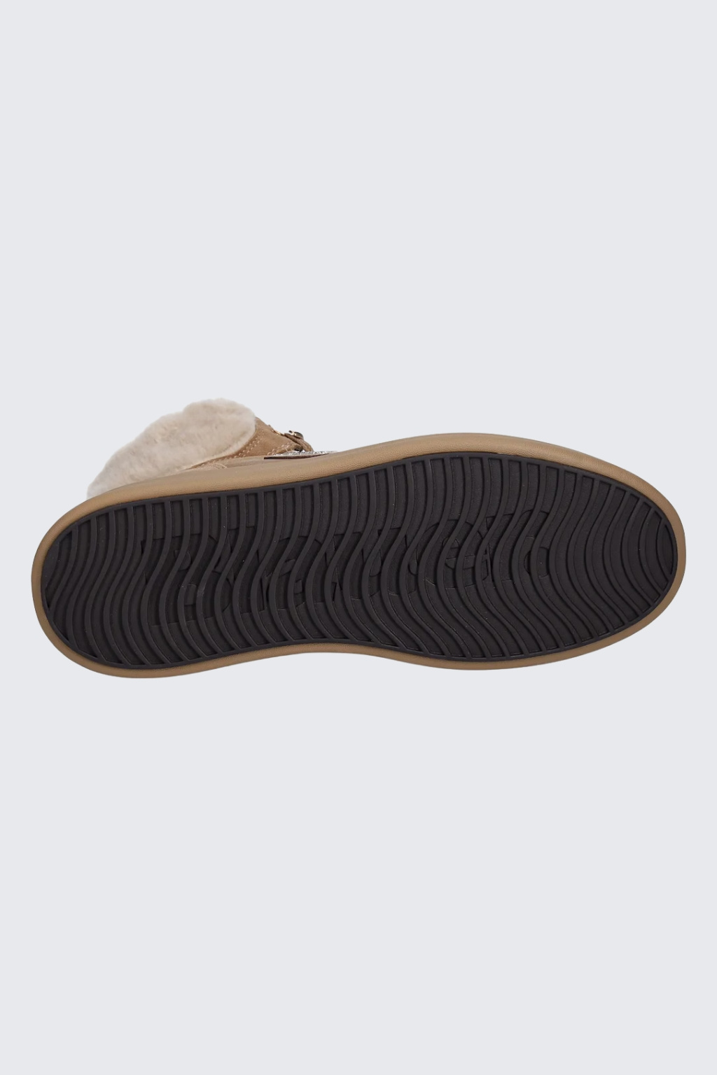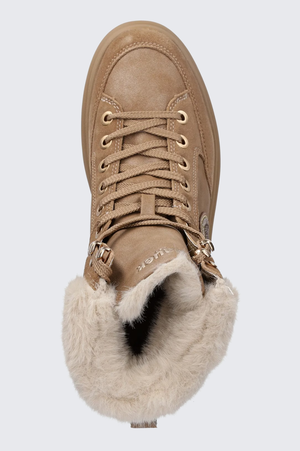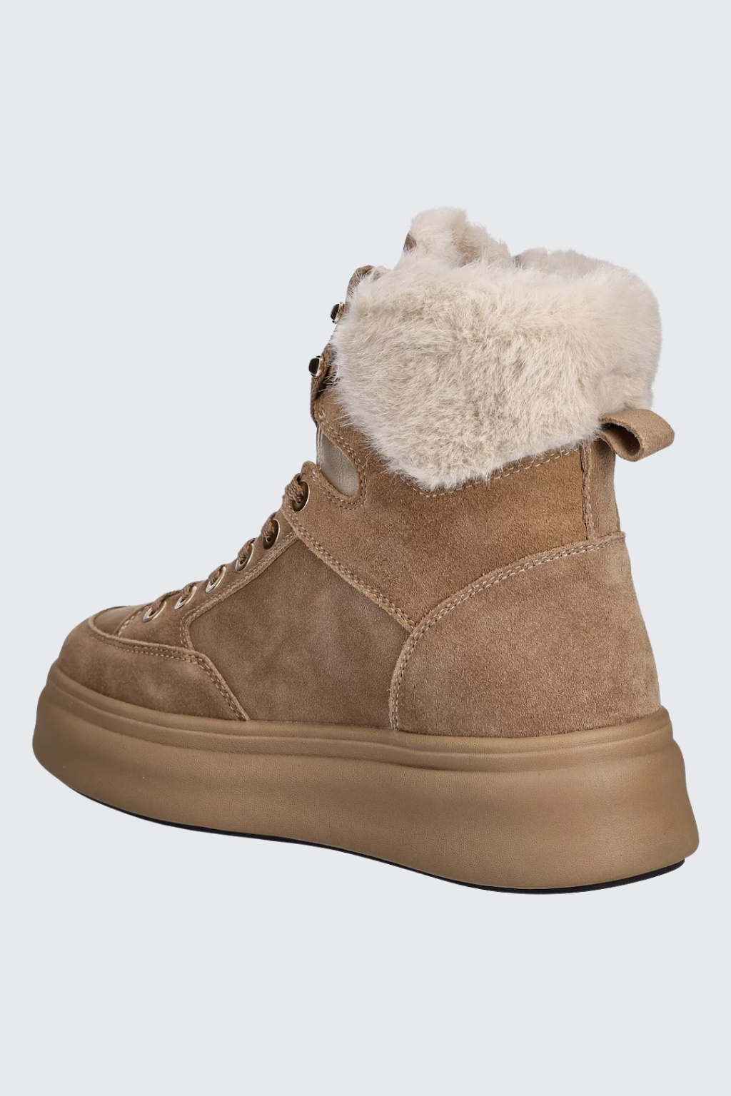 Dámské kotníkové boty značky BLAUER jsou zateplené kožíškem. Model je vyroben z kombinace semišové kůže, ekologické kůže a textilního materiálu. Boty mají vyztuženou patu a kulatou špičku. Zavazování je na ploché tkaničky. Na vnější straně boty je logo značky BLAUER ve tvaru erbu. Boty mají vroubkovanou podrážku a 5 cm platformu.