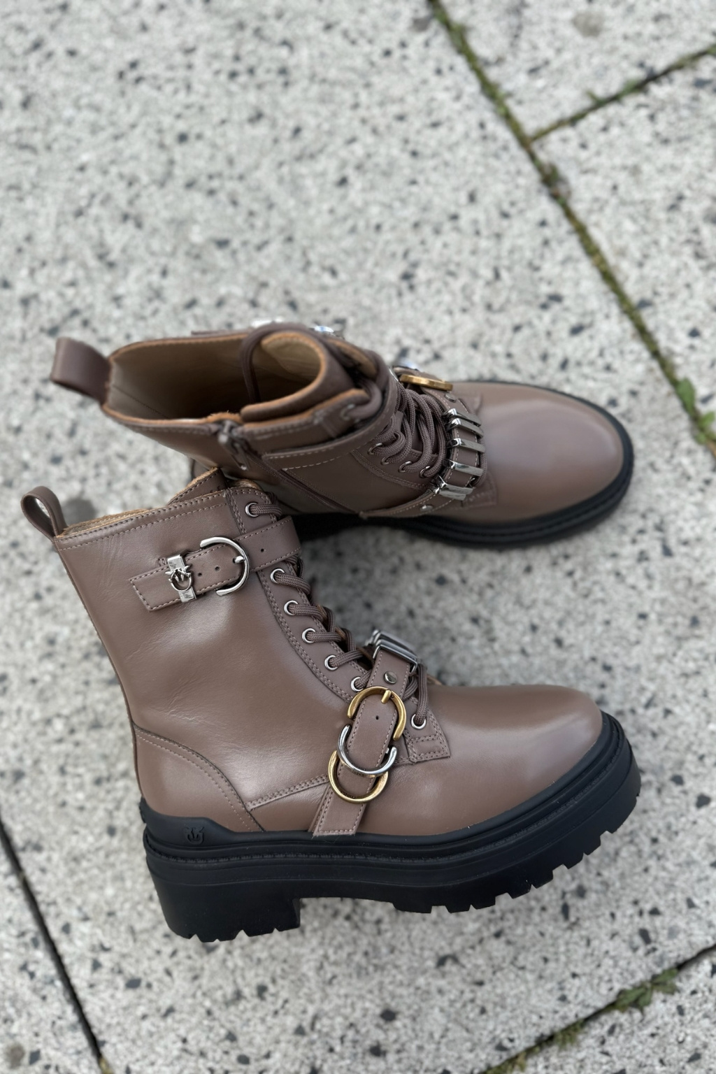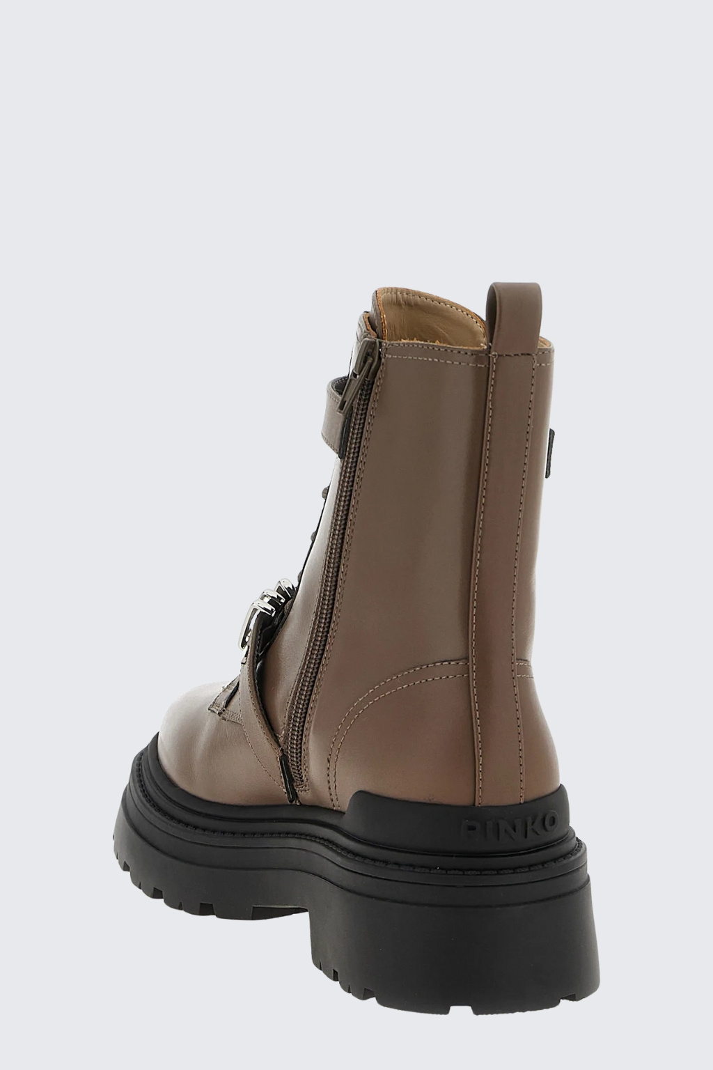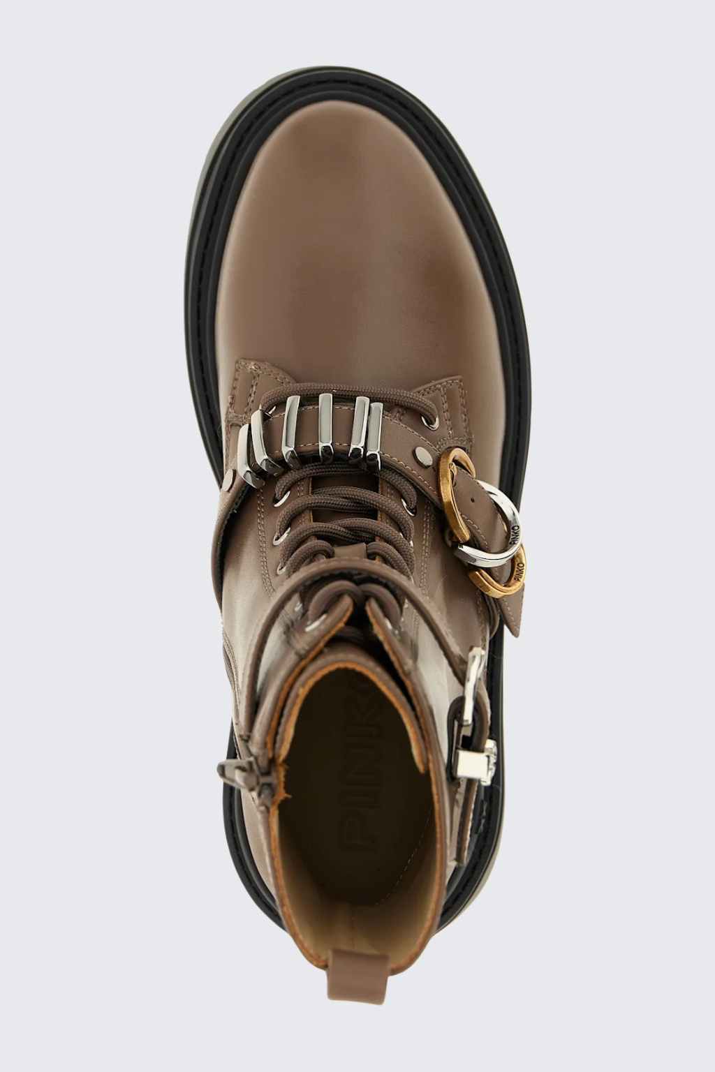 Dámské nezateplené, kotníkové boty značky PINKO mají přes nárt a nahoře boty pásek s přezkou a kovovou úpravou. Na páscích a platformě je doplněno logo značky PINKO LOVE BIRDS. Boty mají z vnitřní strany zapínání na zip a vzadu poutko pro snadné nazouvání. Zavazování je na kulaté tkaničky. Boty mají vyšší platformu s nízkým, širokým podpatkem. Podrážka je vroubkovaná a pata vyztužená, boty mají klasickou, kulatou špičku.