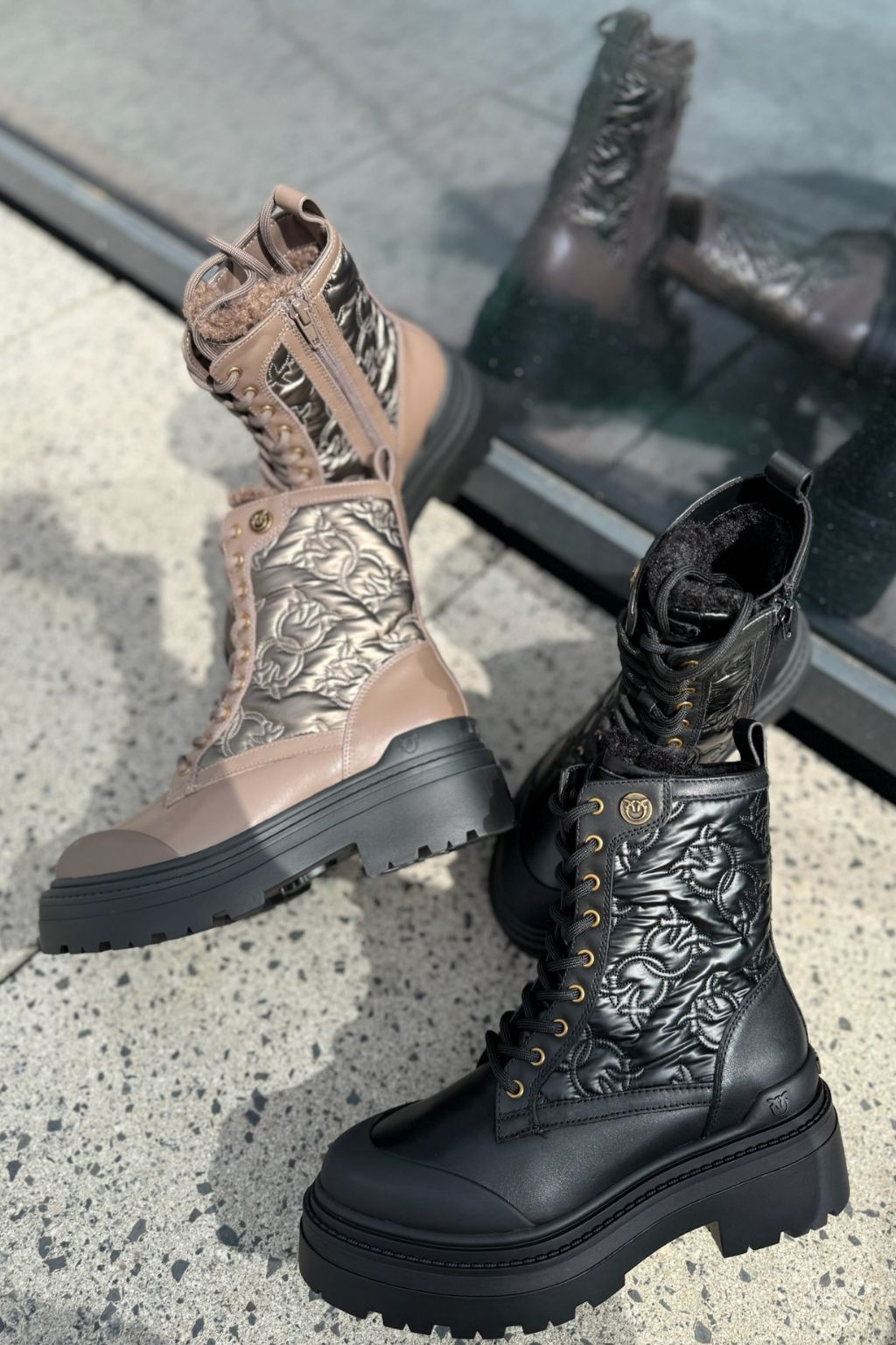 Dámské kotníkové boty značky PINKO mají po stranách lesklou úpravu se vzorováním loga značky PINKO LOVE BIRDS. Na vnější straně boty a na platformě je doplněno logo značky. Boty mají z vnitřní strany zapínání na zip a vzadu poutko pro snadné nazouvání. Zavazování je na kulaté tkaničky. Boty mají vyšší platformu s nízkým, širokým podpatkem. Podrážka je vroubkovaná a pata vyztužená, boty mají klasickou, kulatou špičku. Model má uvnitř kožíšek.