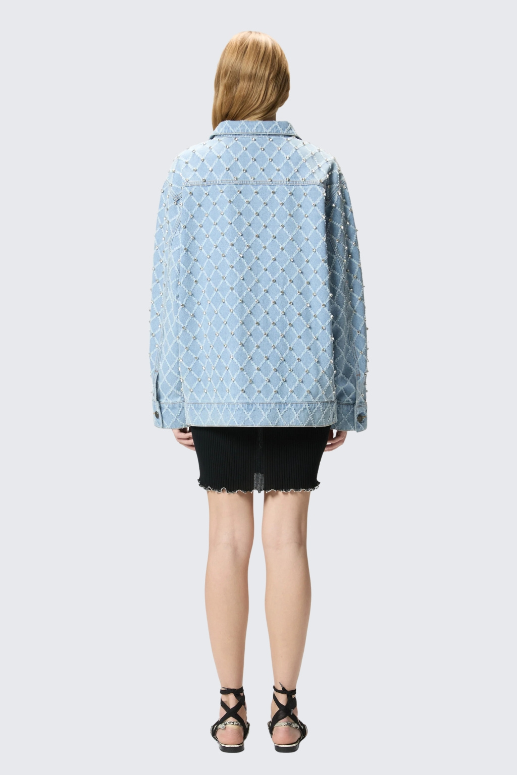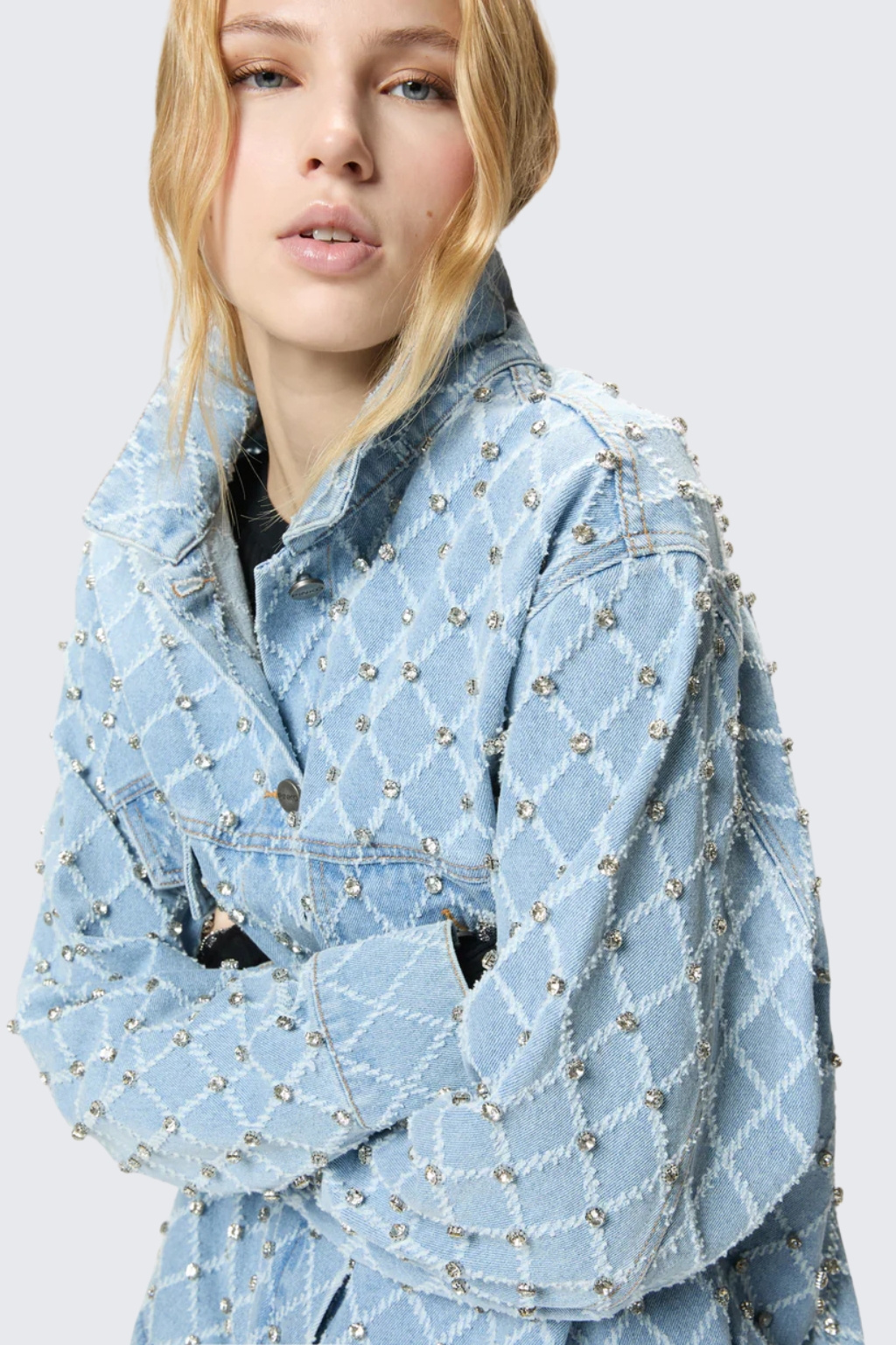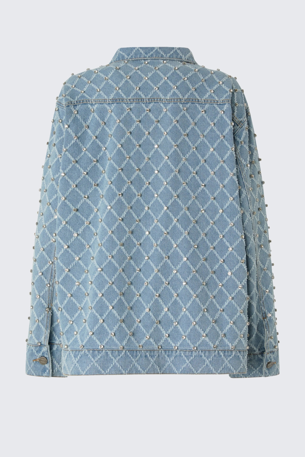 Dámská džínová bunda značky PINKO je vyrobena z čisté bavlny. Má košilový límeček, standardní délku a dlouhé rukávy se sníženou linií ramen. Model má na koncích rukávů manžety s knoflíky. Zapínání je po celé délce na knoflíky a na hrudi jsou dvě kapsy s klopami a knoflíkem. Model má na sobě kamínky a na knoflících vyryté PINKO.