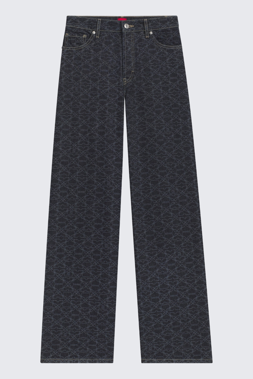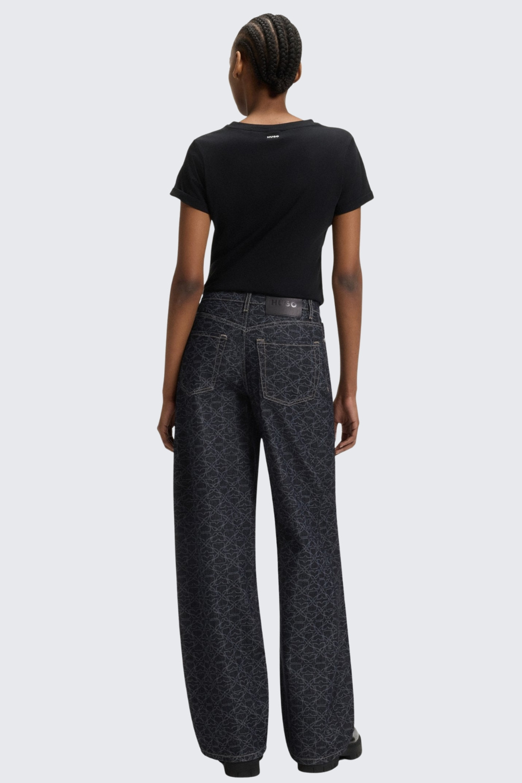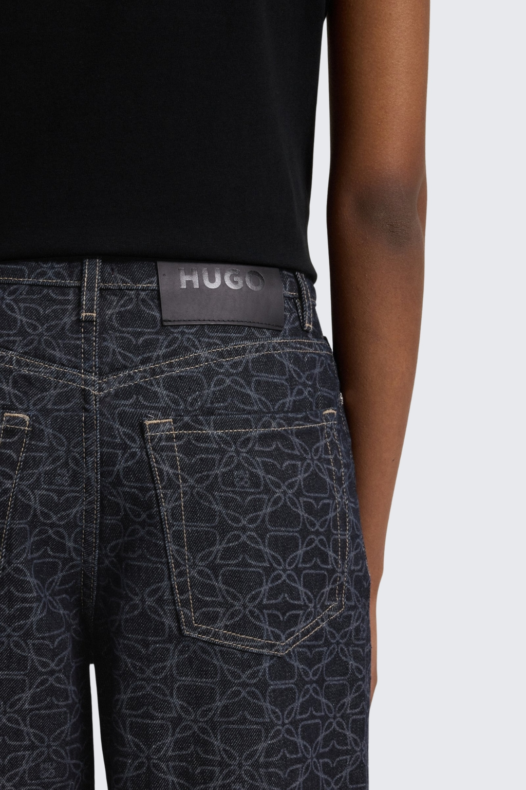 Dámské džíny z kolekce HUGO mají střih se širokými nohavicemi a zvýšeným pasem. Model je vyroben z tuhého denimu. Má v pase manžetu a poutka pro doplnění opasku. Zapínání je na zip, knoflík a háček. Na přední straně jsou tři kapsy a na zadní straně dvě. V pase je vzadu nášivka s logem značky HUGO.