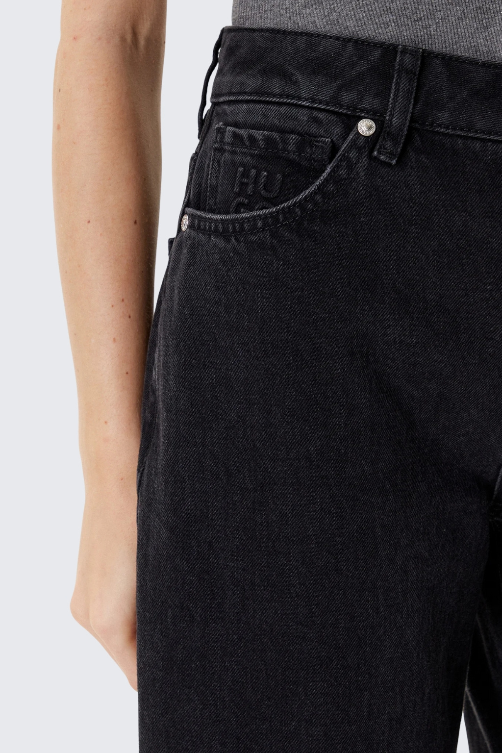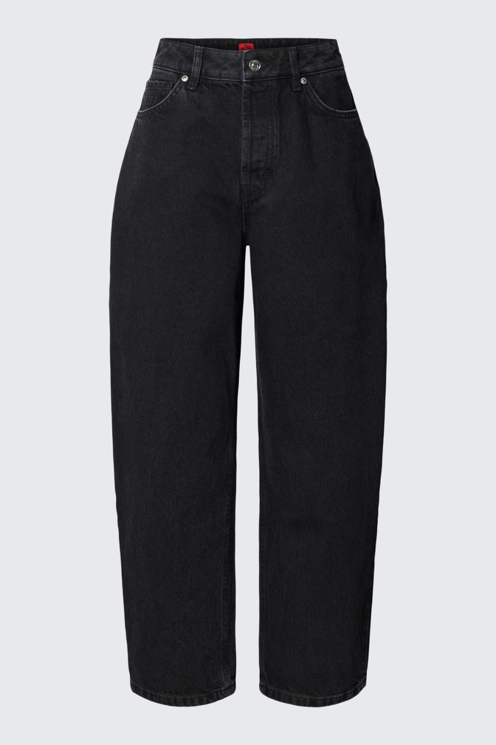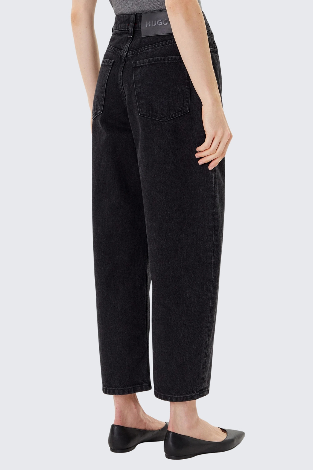 Dámské džíny značky HUGO jsou volného střihu s vysokým pasem a širokými nohavicemi. Model je vyroben z bavlněného denimu. Zapínání je na zip a knoflík a v pase je manžeta s poutky pro doplnění opasku. Džíny mají pět kapes, tři na přední straně a dvě zezadu. Na zadní straně je v pase nášivka s logem značky HUGO.