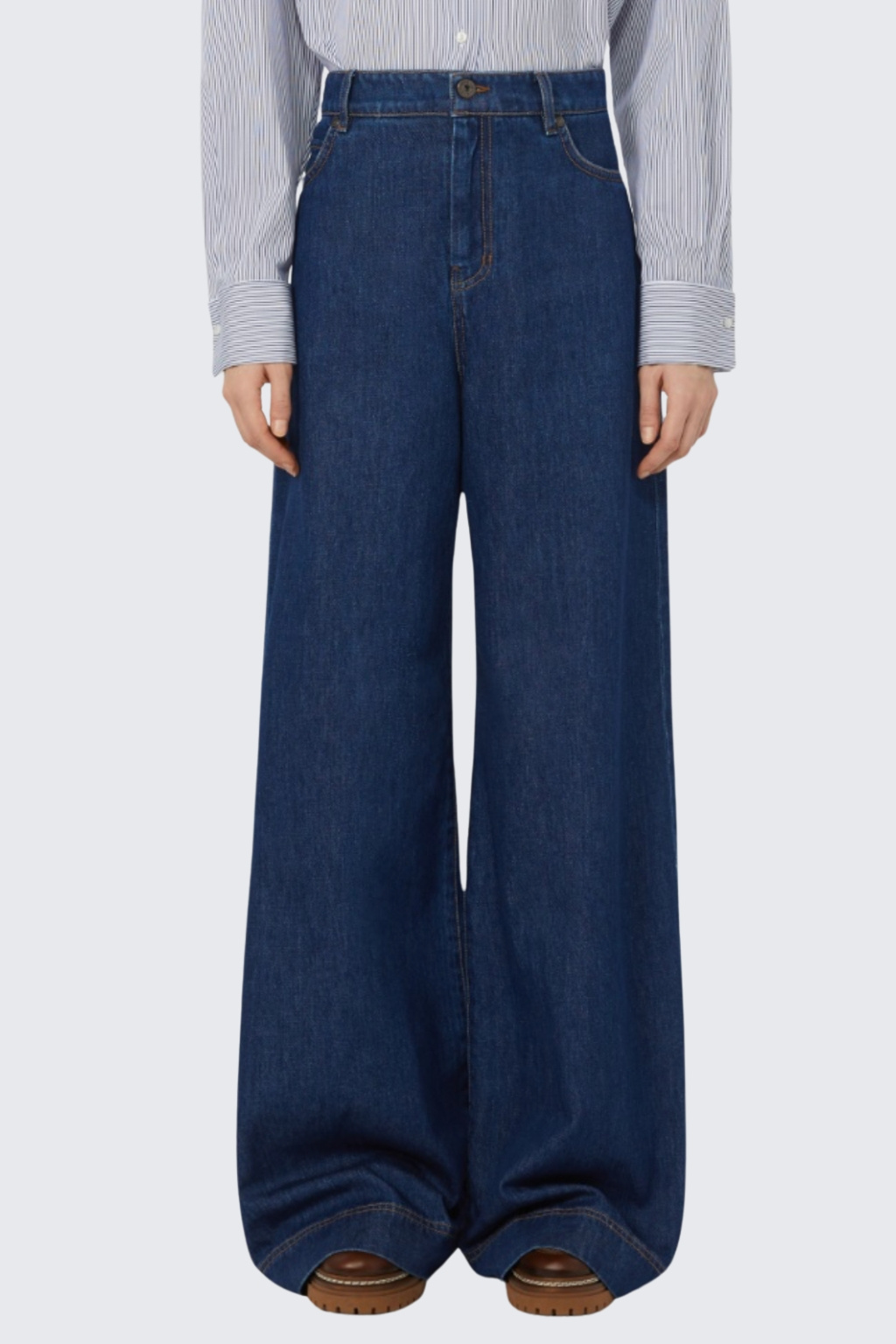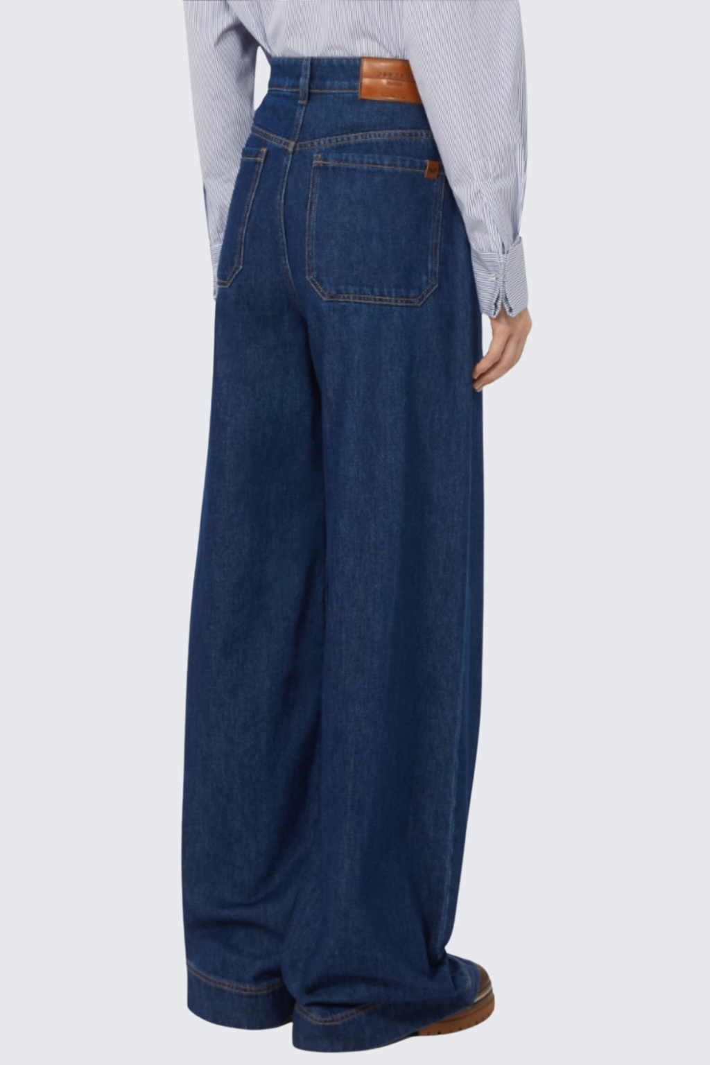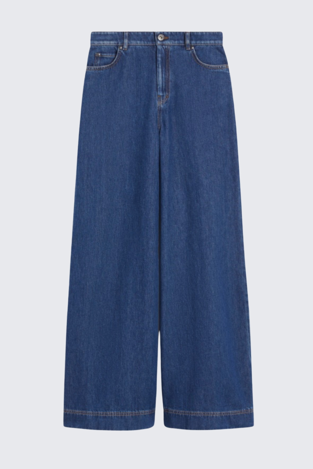 Dámské džíny značky MaxMara jsou s pěti kapsami a mají široké volné nohavice. Kalhoty jsou vyrobeny z čisté bavlny a mají vysoký pas. Mají kontrastní prošívání s klasické zapínání na zip a knoflík. V pase jsou poutka pro doplnění opasku a na zadní straně je v pase kožená nášivka s logem značky MaxMara.