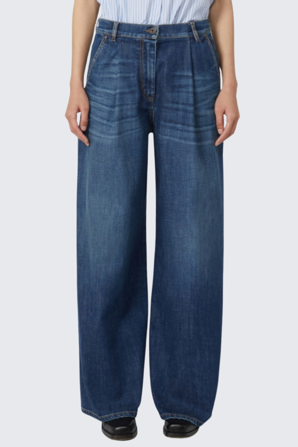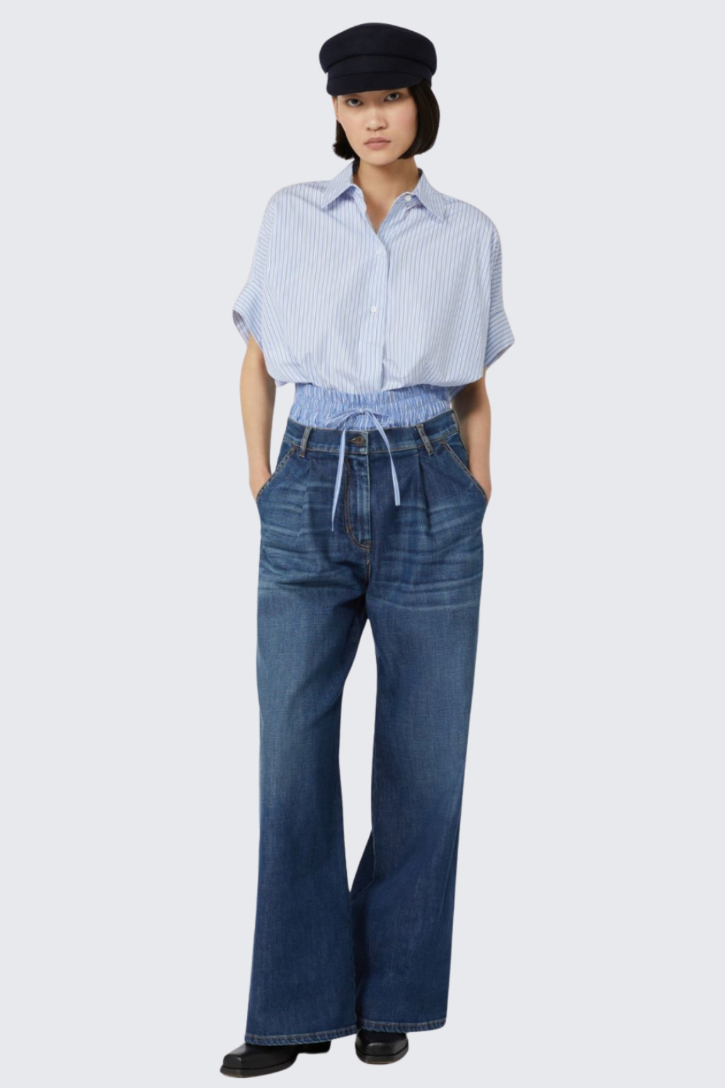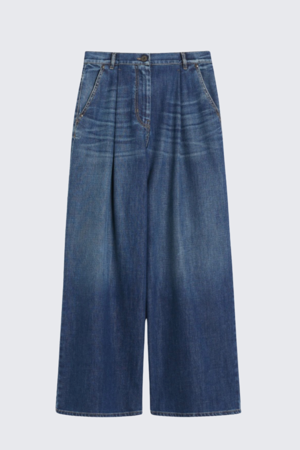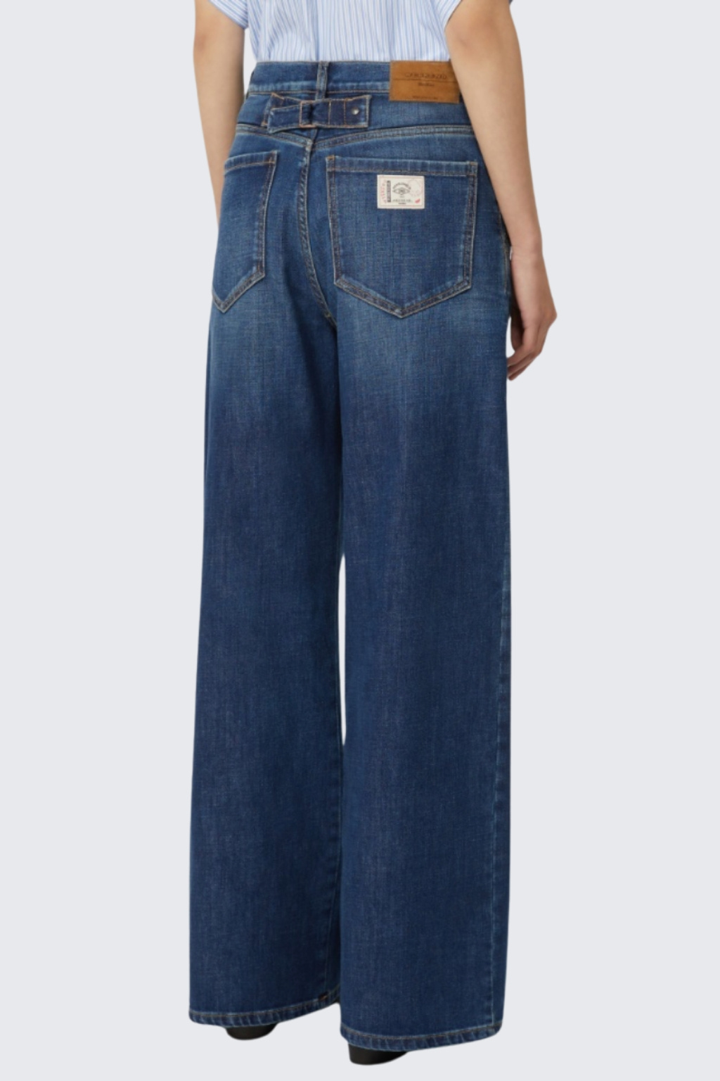 Dámské džíny značky MaxMara jsou širokého střihu se sníženým sedem. Model má zapínání na zip a knoflík. V pase jsou poutka pro doplnění opasku. Kalhoty mají dvě přední, šikmo střižené, průhmatové kapsy a dvě na zadní straně. Na zadní straně jsou dvě nášivky s logem značky MaxMara. Vzadu je nastavitelný, překřížený popruh.