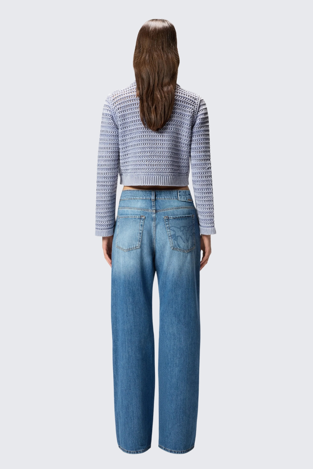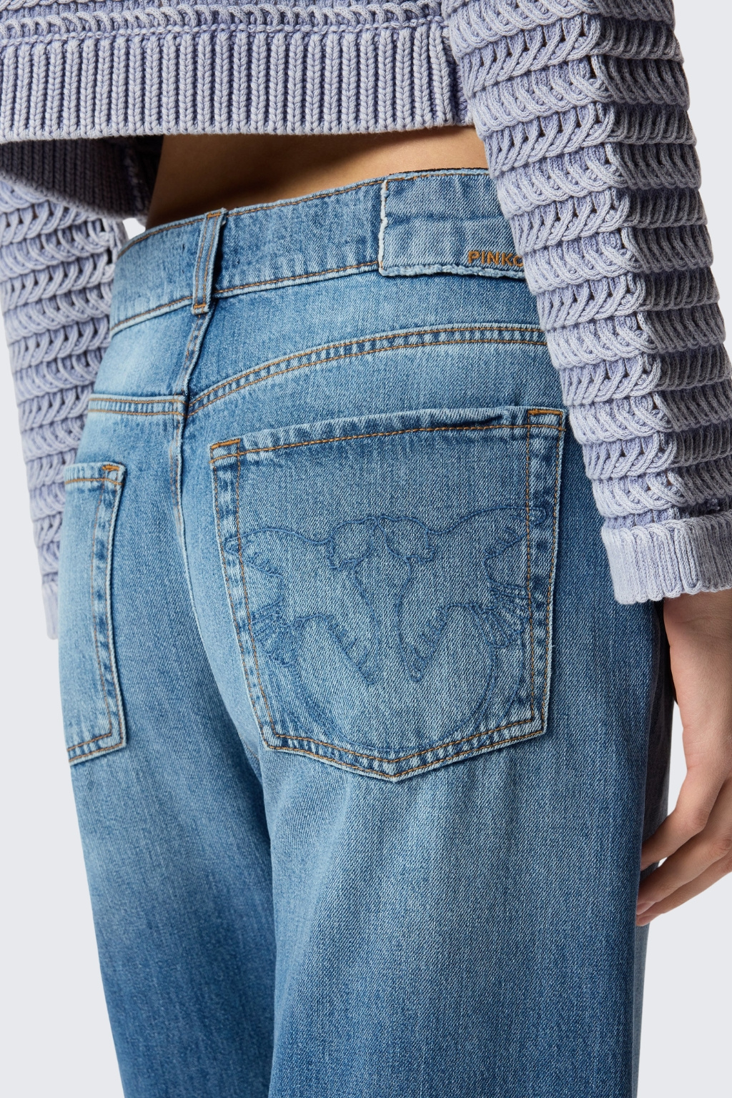 Dámské džíny značky PINKO mají široké nohavice a snížený sed. Model má v pase poutka pro doplnění opasku, zapínání je na zip a knoflík. Džíny mají pět kapes, tři na přední straně a dvě zezadu. Na zadní pravé kapse je našité logo značky PINKO LOVE BIRDS a v pase nášivka s nápisem PINKO.