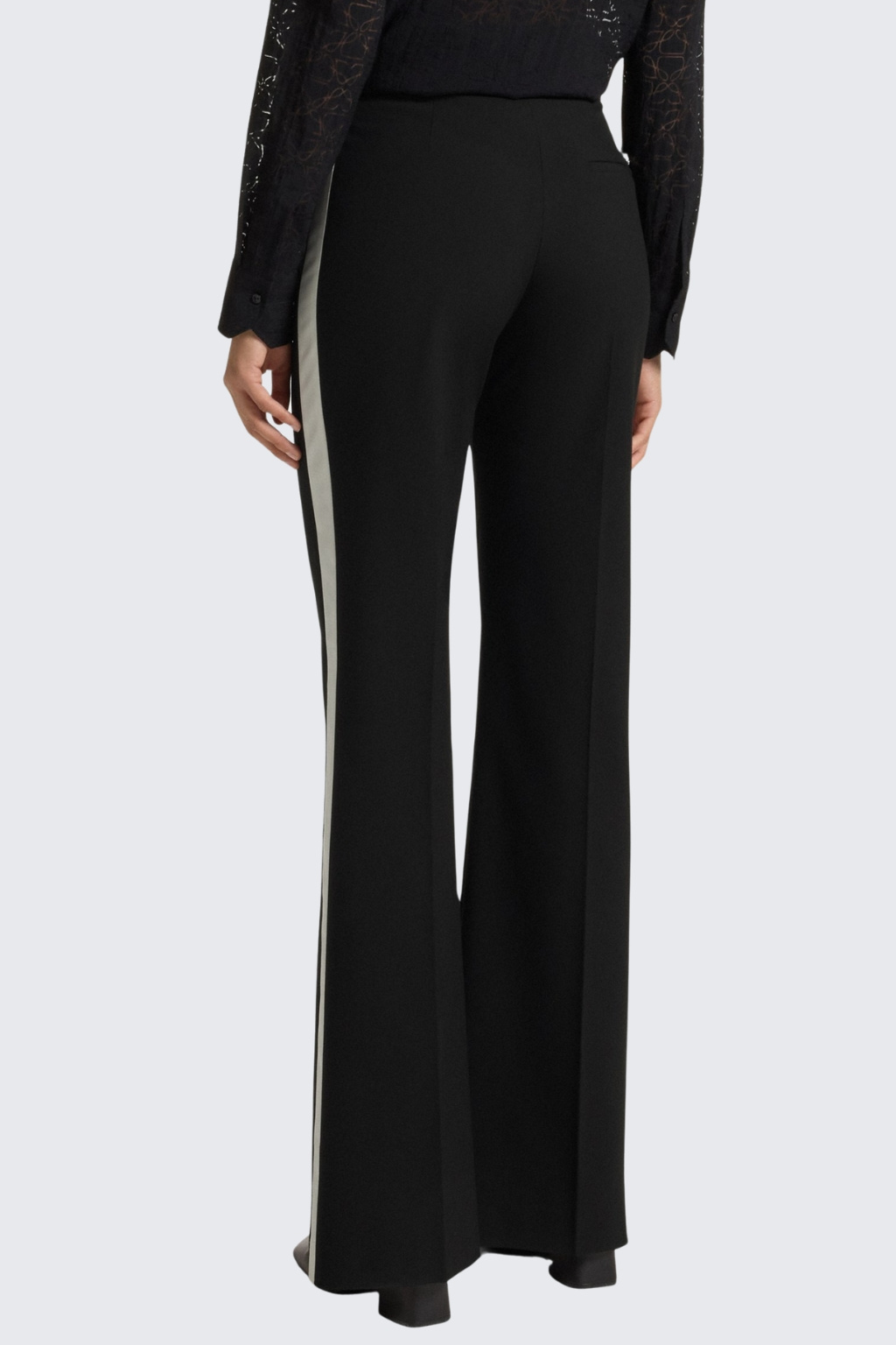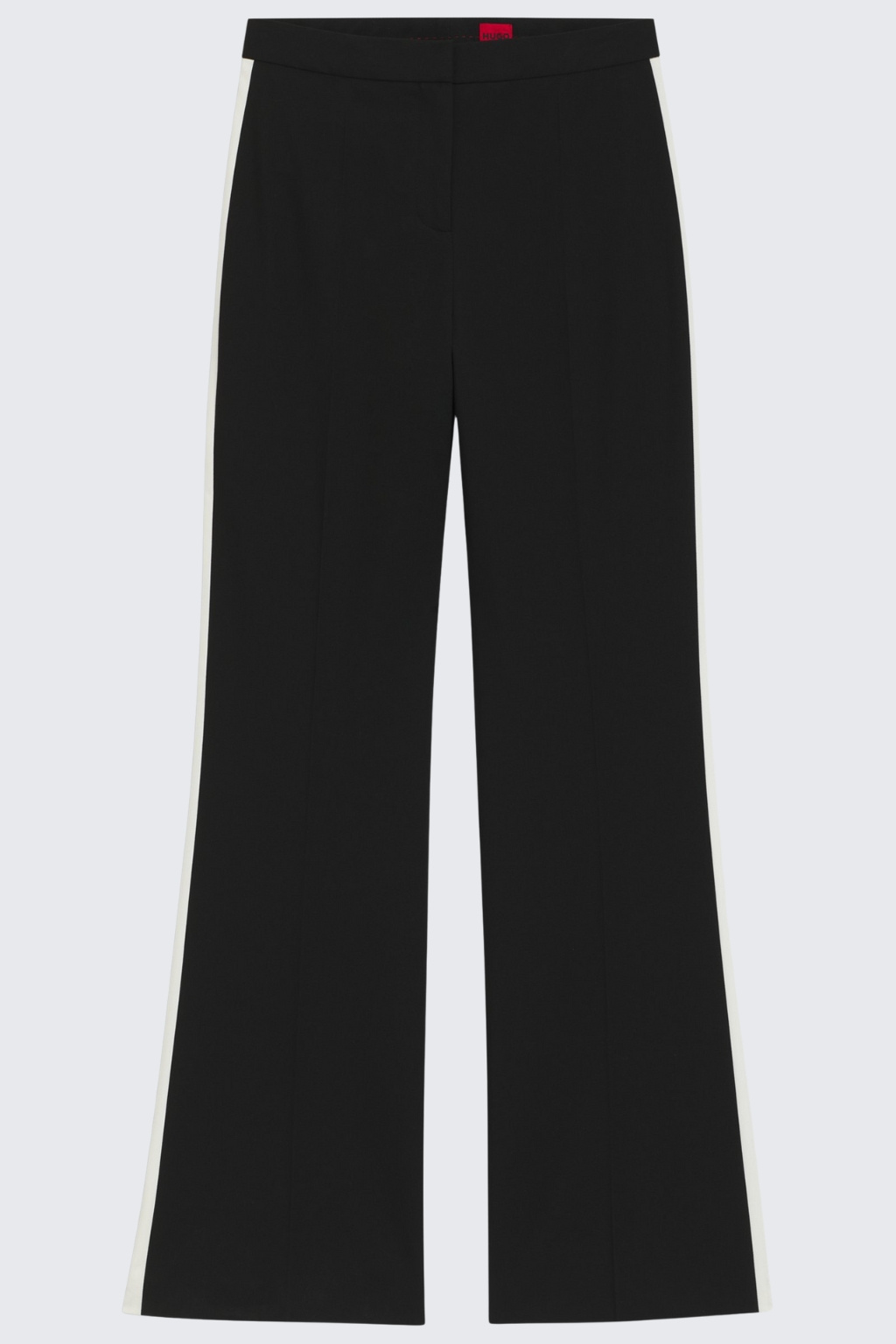 Dámské kalhoty z kolekce HUGO mají volný střih s rozšiřujícími se nohavicemi. Model je vyroben z hladké tkaniny. Má zapínání na zip, knoflík a háček a zažehlené nohavice. Kalhoty mají v pase manžetu a zadní imitaci kapsy, nad kterou je doplněno stříbrné logo značky HUGO.