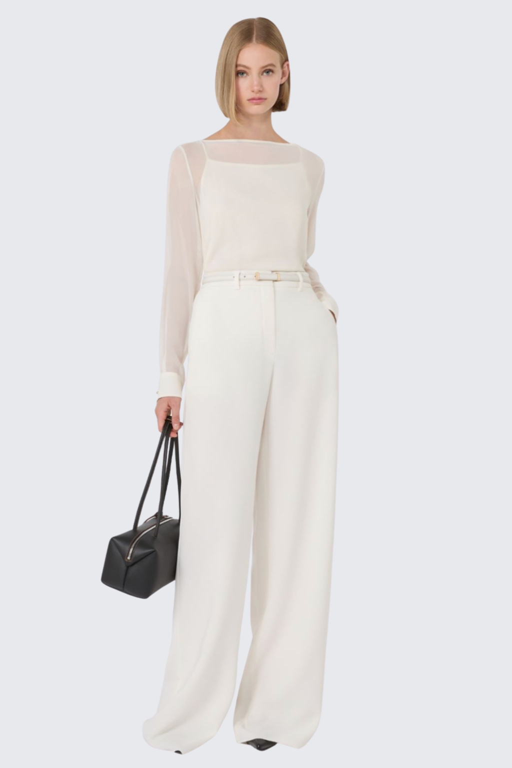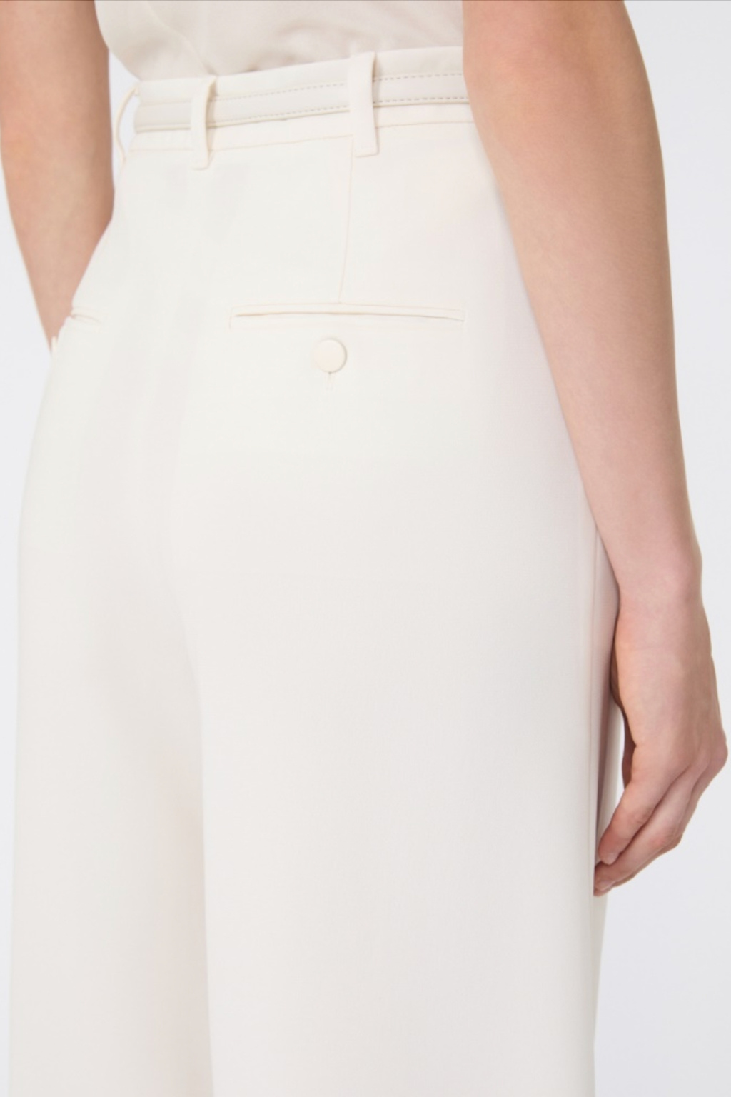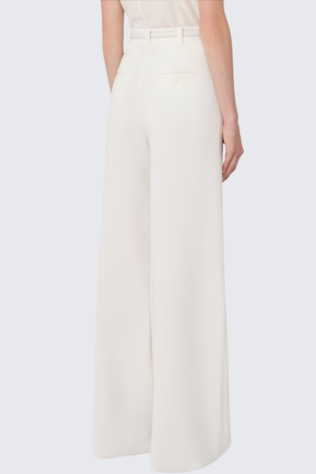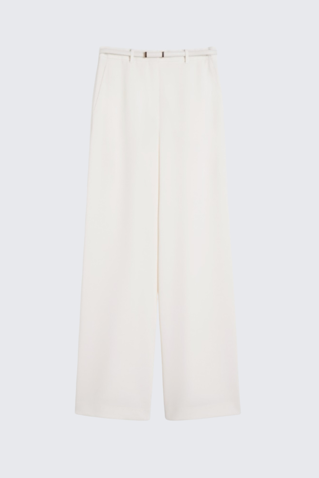 Dámské kalhoty značky MaxMara mají volný střih se širokými nohavicemi a vysokým pasem. Kalhoty mají v pase poutka na opasek a pásek z potahované látky. Zapínání je na zip a háček, po stranách jsou dvě šikmo střižené kapsy. Na zadní straně jsou dvě lemované kapsy s knoflíky.