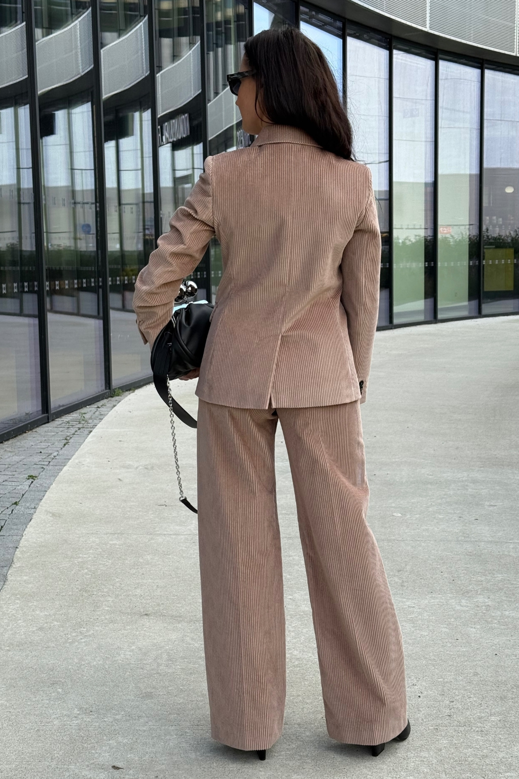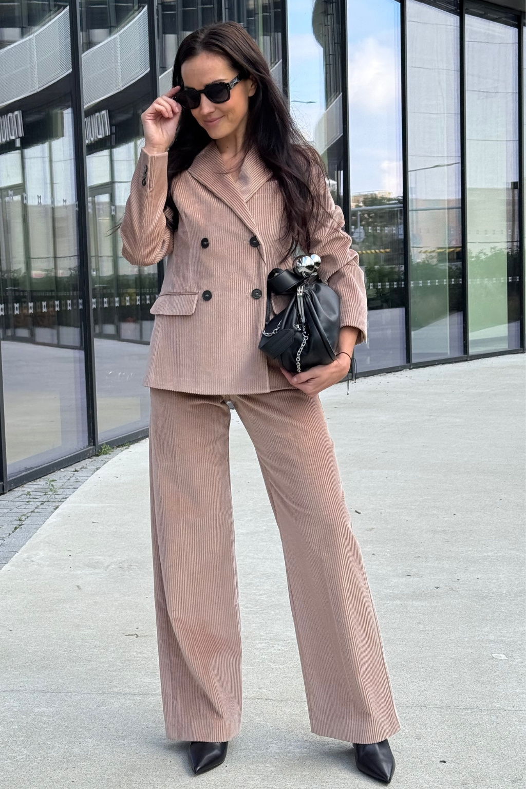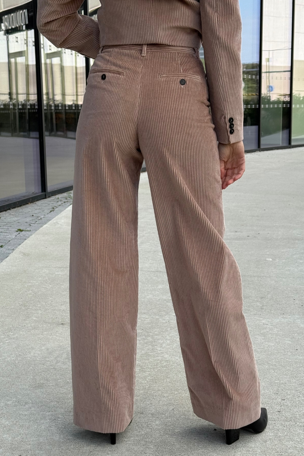 Dámské manšestrové kalhoty značky MaxMara mají vysoký pas, volný střih a široké nohavice. Kalhoty jsou vyrobeny z čisté bavlny a mají v pase manžetu s poutky pro doplnění opasku. Zapínání je na zip a háček. Po stranách jsou dvě šikmé průhmatové kapsy a na zadní straně dvě s knoflíkem.