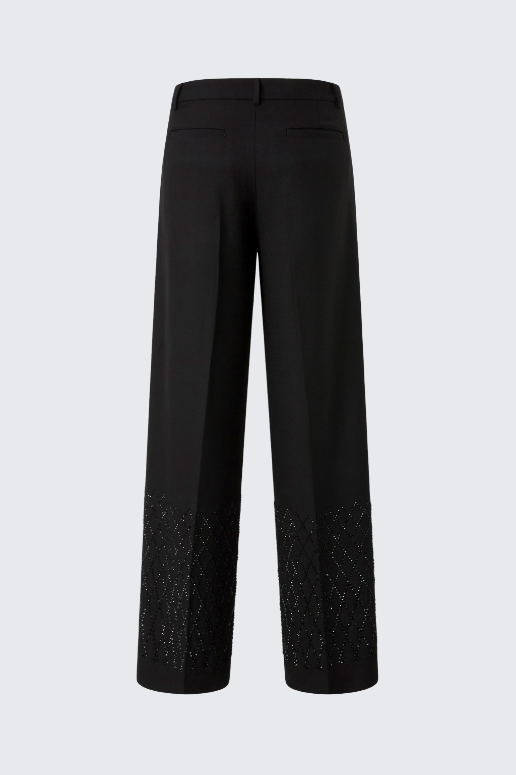 Dámské kalhoty značky PINKO mají vysoký pas a volnější střih. Zapínání je na zip a háček, v pase je manžeta s poutky pro doplnění opasku. Nohavice jsou na zadní straně uprostřed s krátkým rozparkem. Kalhoty jsou vespod nohavic s aplikací kamínků v různých tvarech a velikostech.