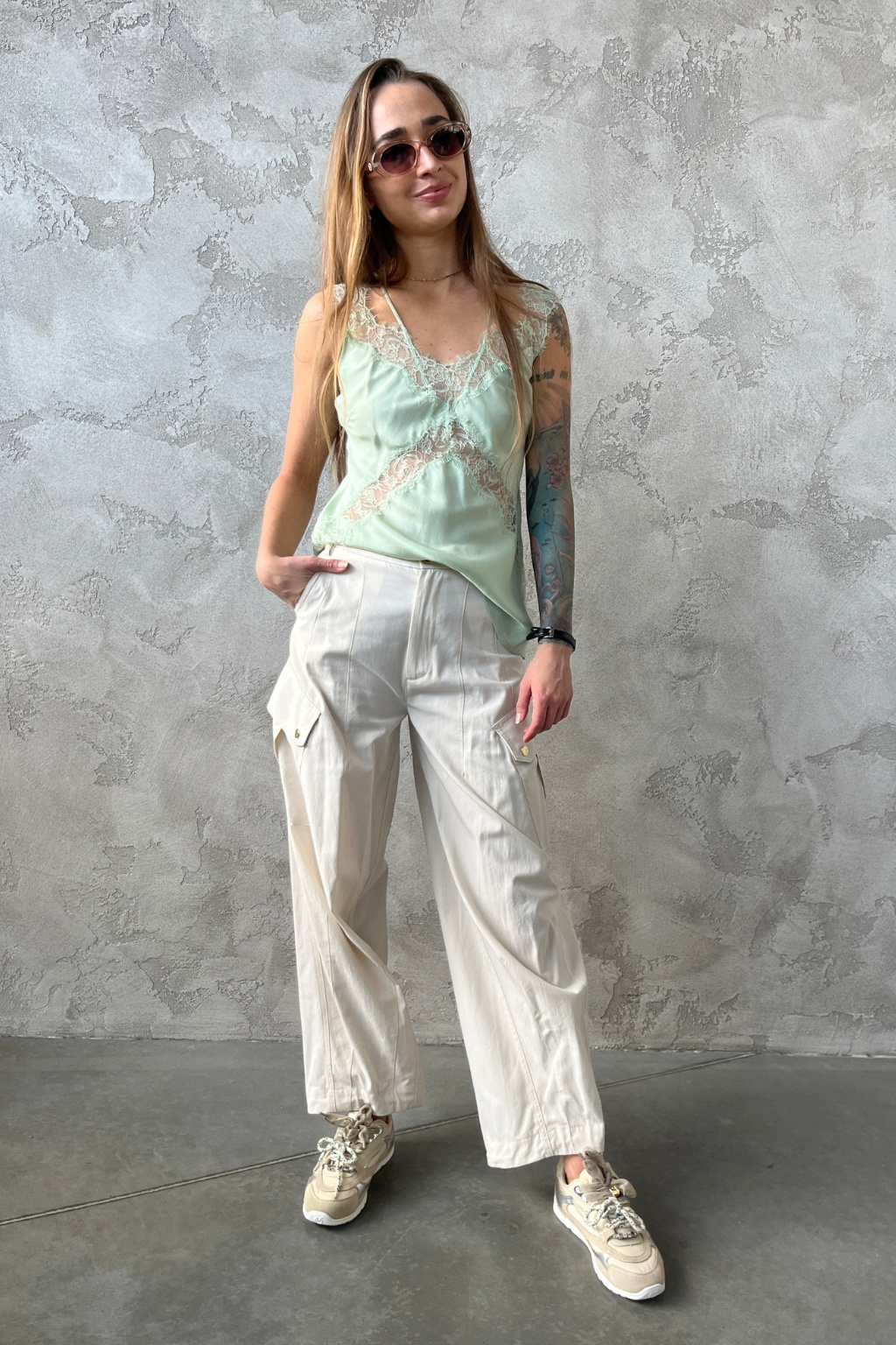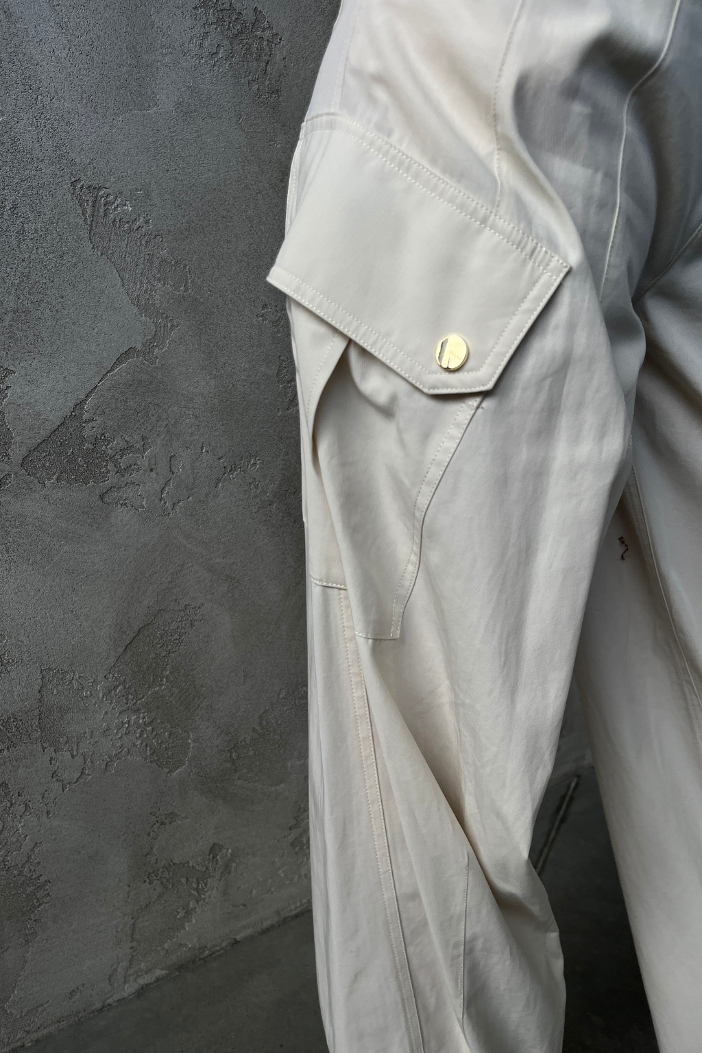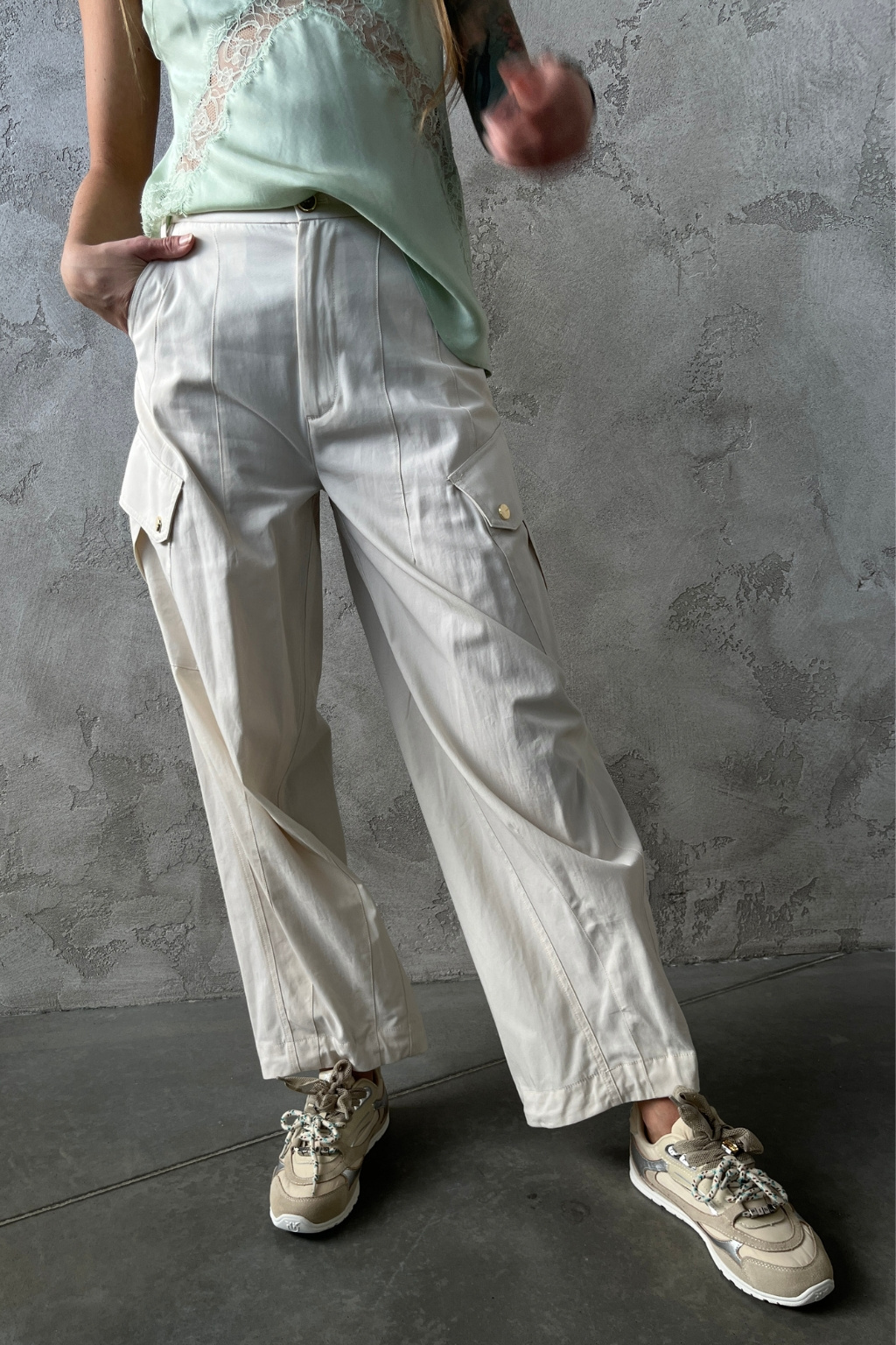 Dámské kalhoty značky PINKO mají střih s širokými nohavicemi a vysoký pas. Model má v pase manžetu a zapínání na zip a knoflík. Po stranách jsou dvě průhmatové kapsy, na zadní straně také dvě. Na nohavicích jsou z vnější strany cargo kapsy s klopami a knoflíky. Vespod nohavic je manžeta.