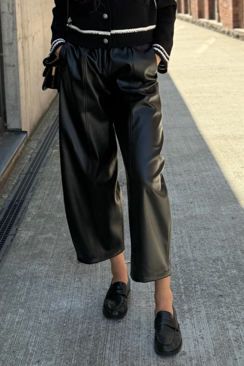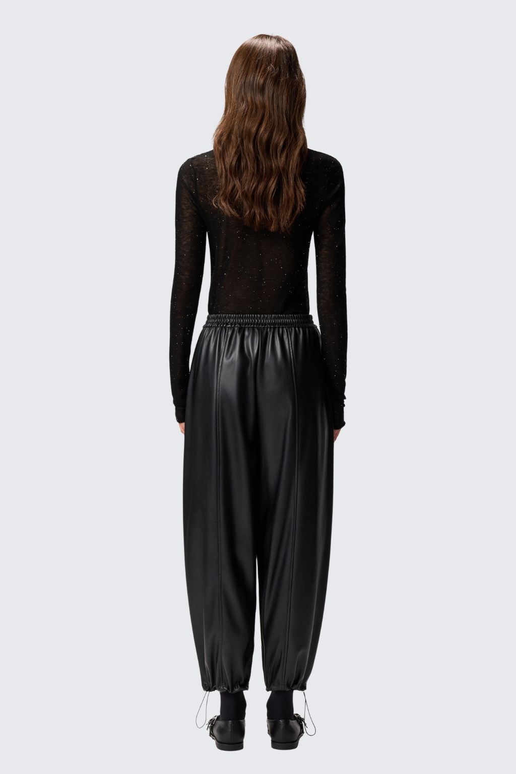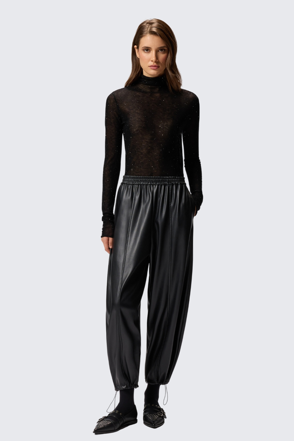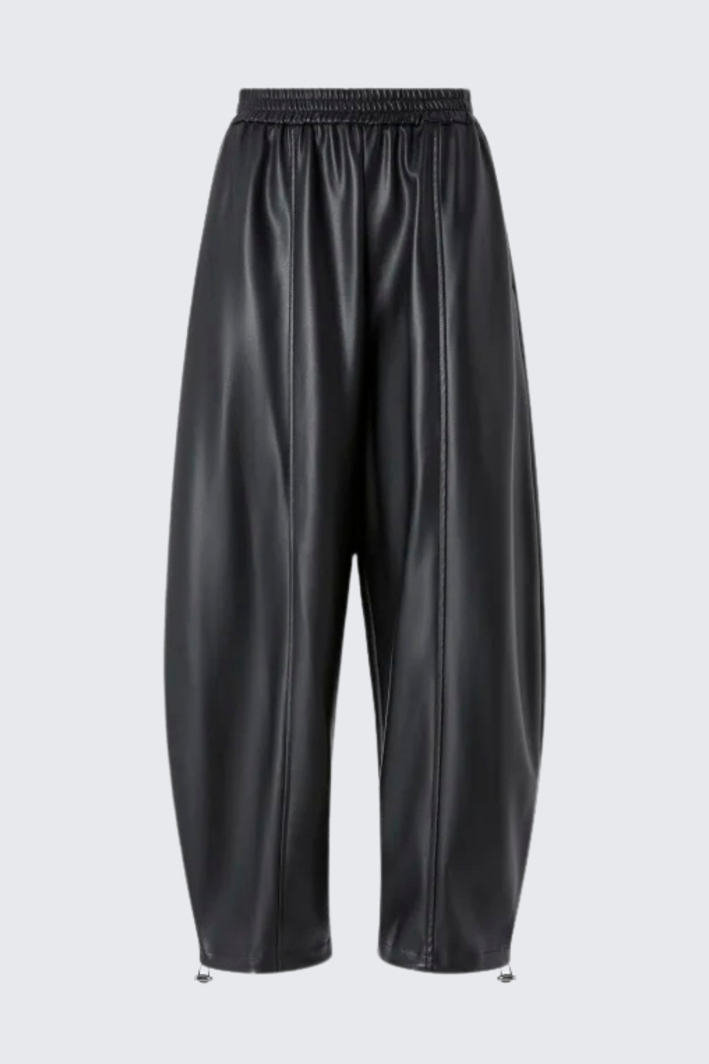 Dámské kalhoty značky PINKO jsou balonového střihu. Vespod nohavic jsou uvnitř stahovací gumičky. Tento model je vyroben z obzvláště lehké látky potažené imitací kůže a má pohodlný elastický pas. V pase je žebrovaná, elastická manžeta a po stranách jsou dvě průhmatové kapsy. Model má středové svislé lemy vepředu i vzadu nohavic.