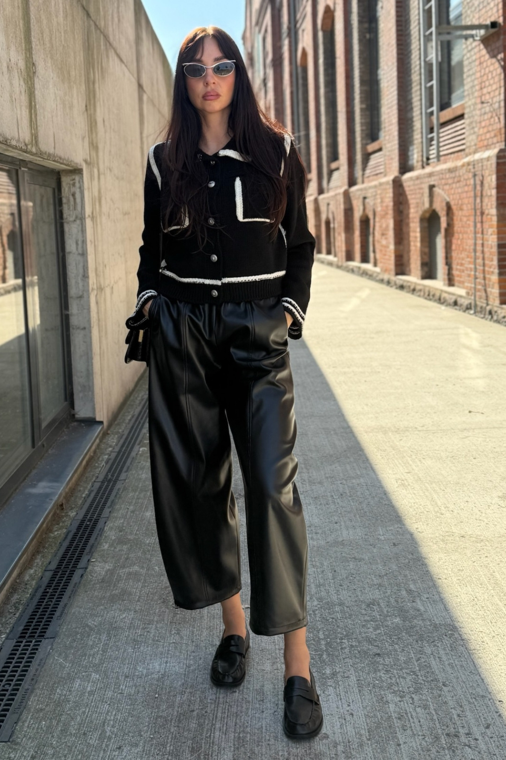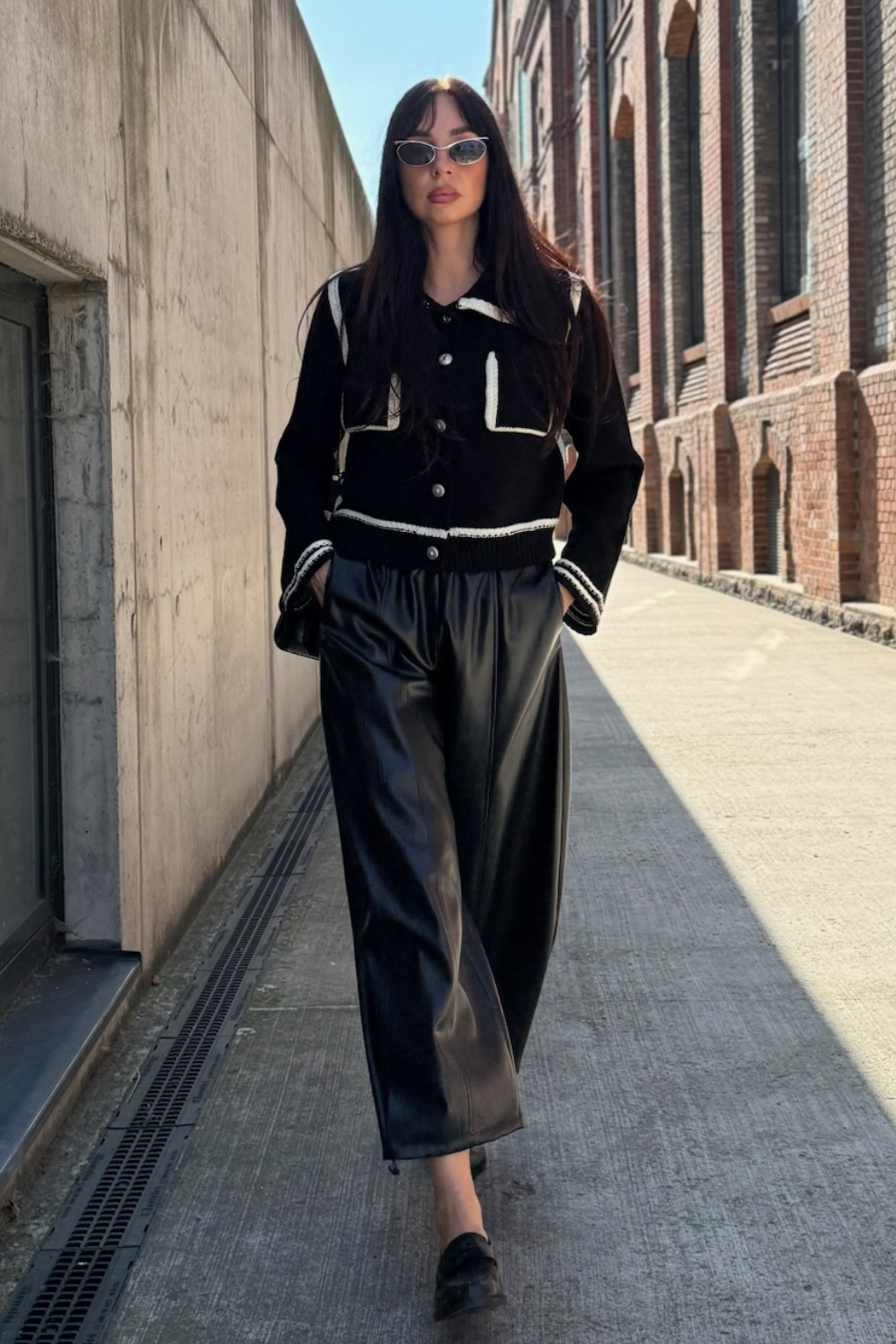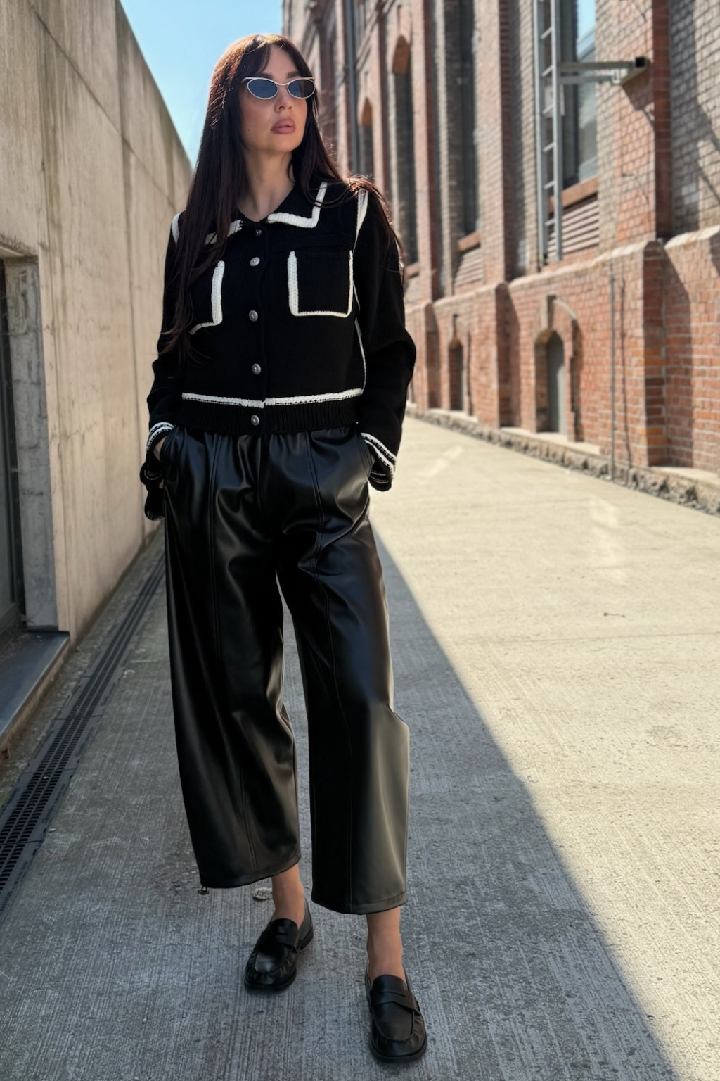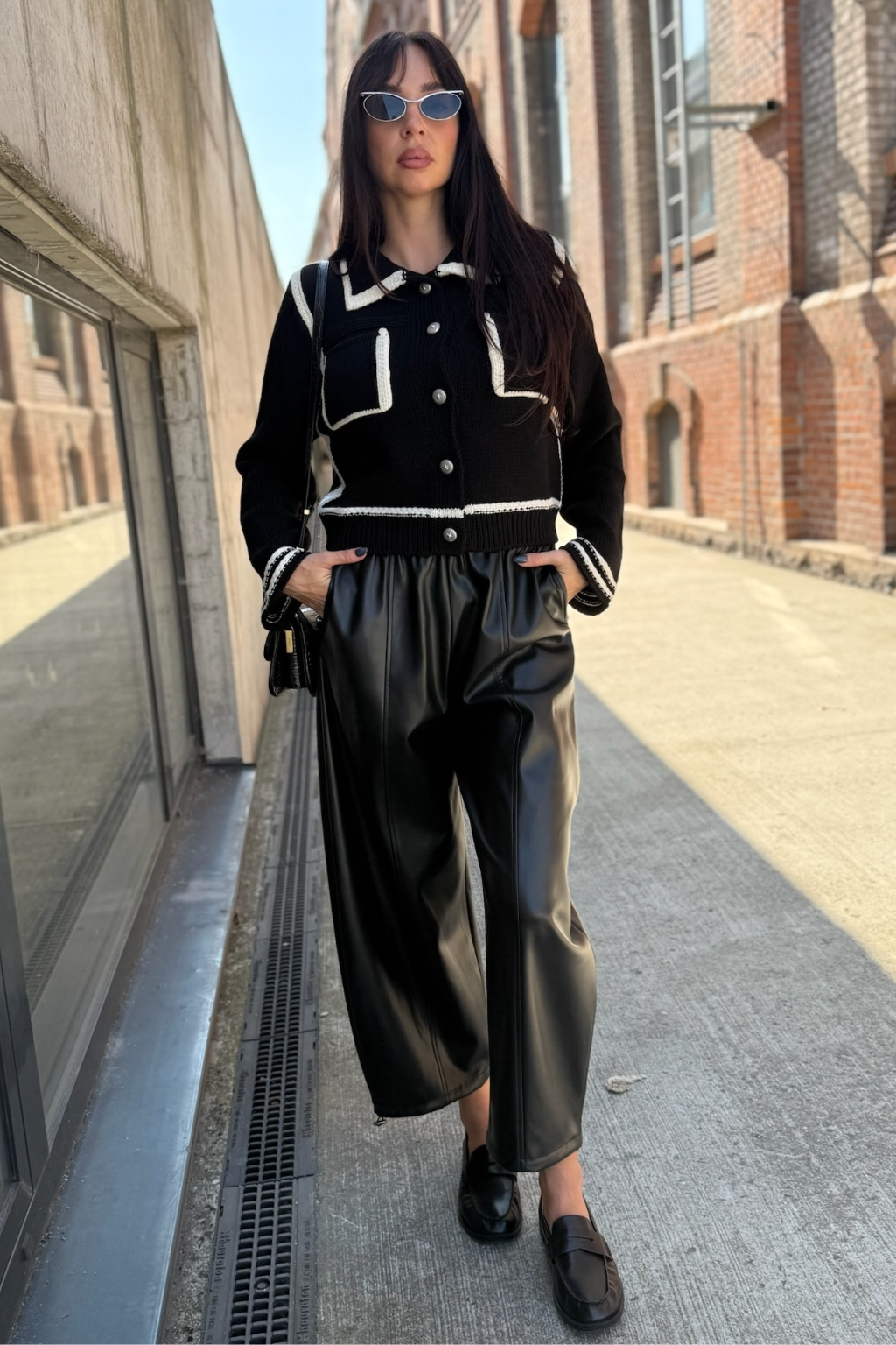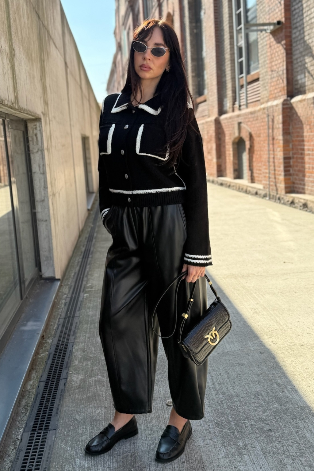 Dámské kalhoty značky PINKO jsou balonového střihu. Vespod nohavic jsou uvnitř stahovací gumičky. Tento model je vyroben z obzvláště lehké látky potažené imitací kůže a má pohodlný elastický pas. V pase je žebrovaná, elastická manžeta a po stranách jsou dvě průhmatové kapsy. Model má středové svislé lemy vepředu i vzadu nohavic.