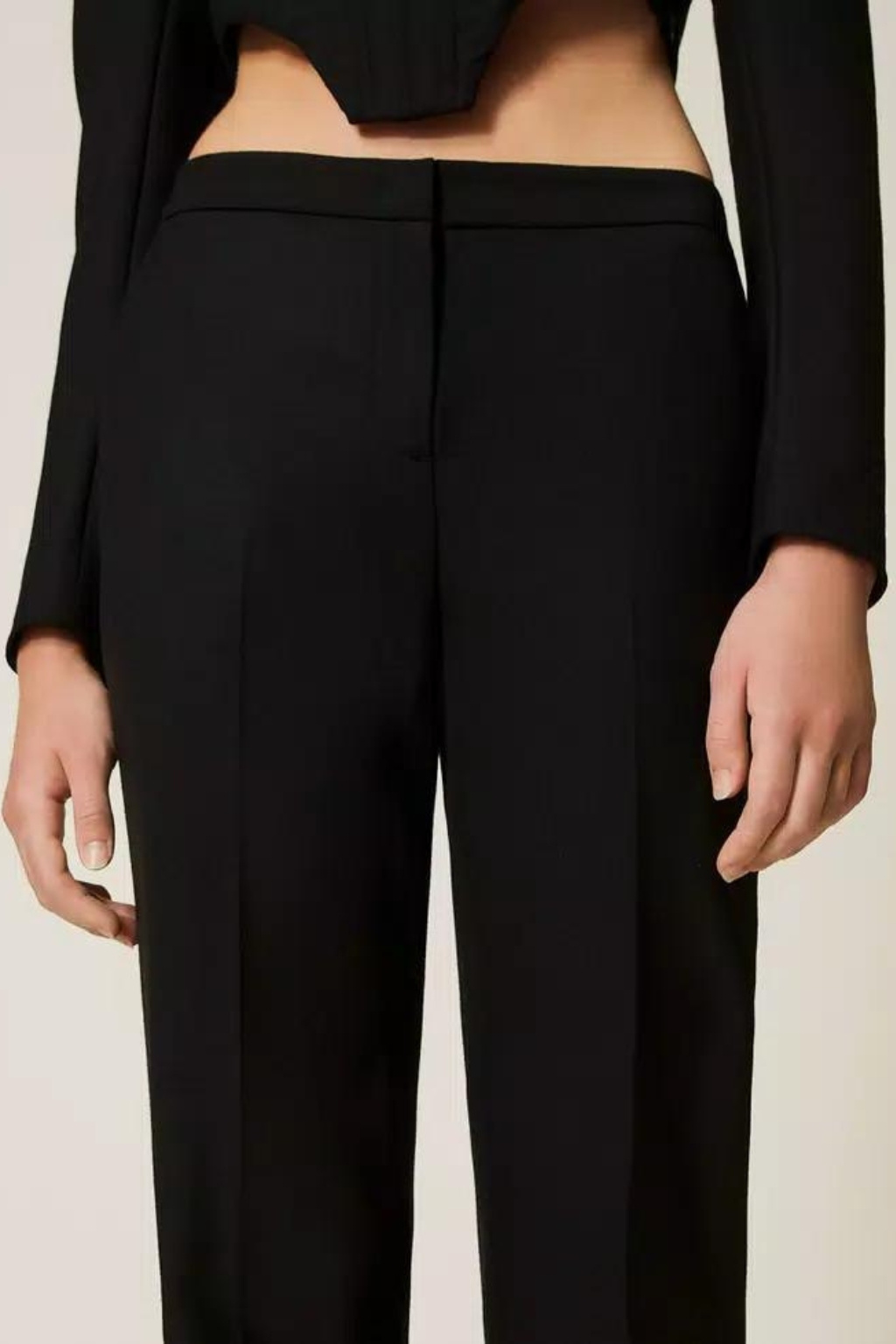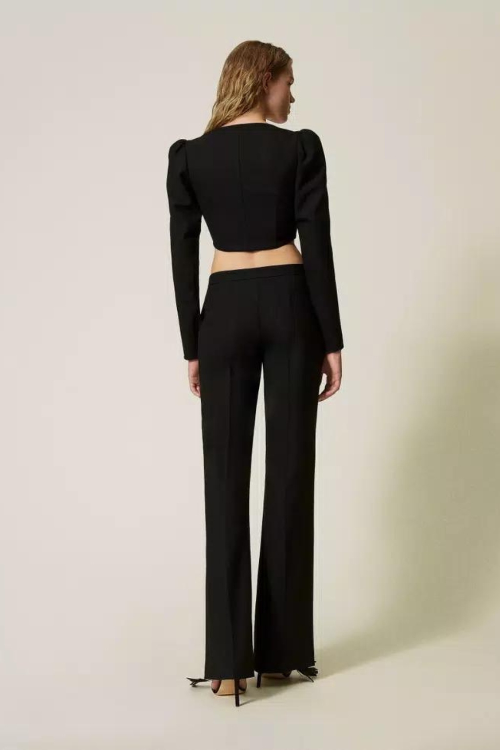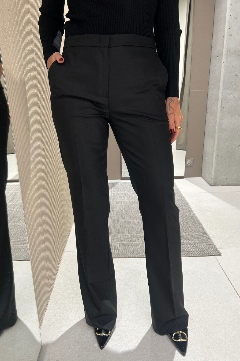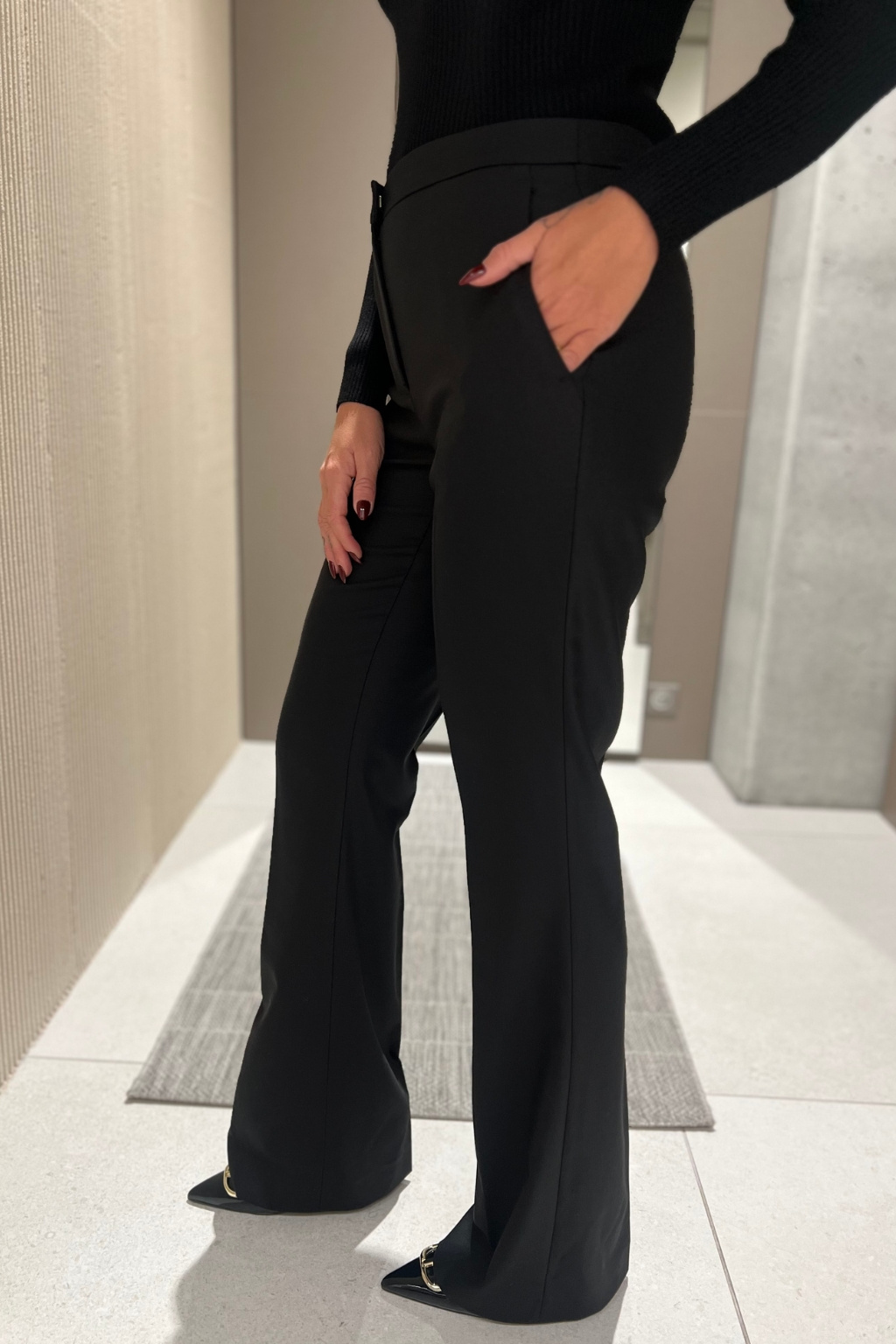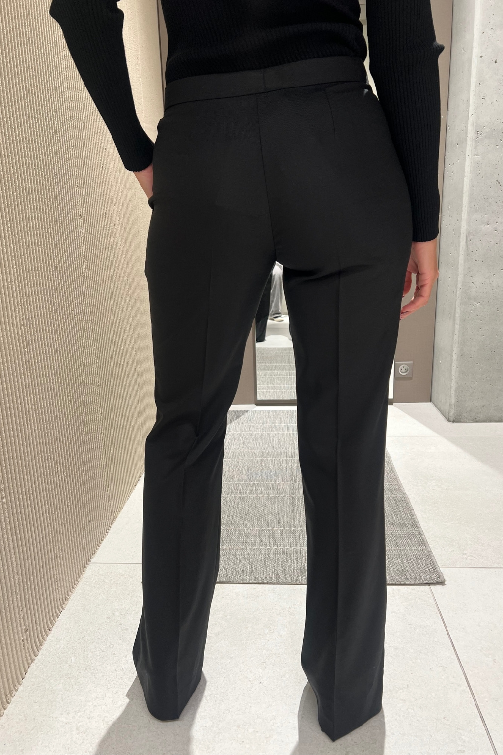 Dámské kalhoty jsou vyrobeny z hedvábné směsi strečové vlny. Mají rozšířené nohavice a zapínání na zip. Kalhoty jsou velice příjemného