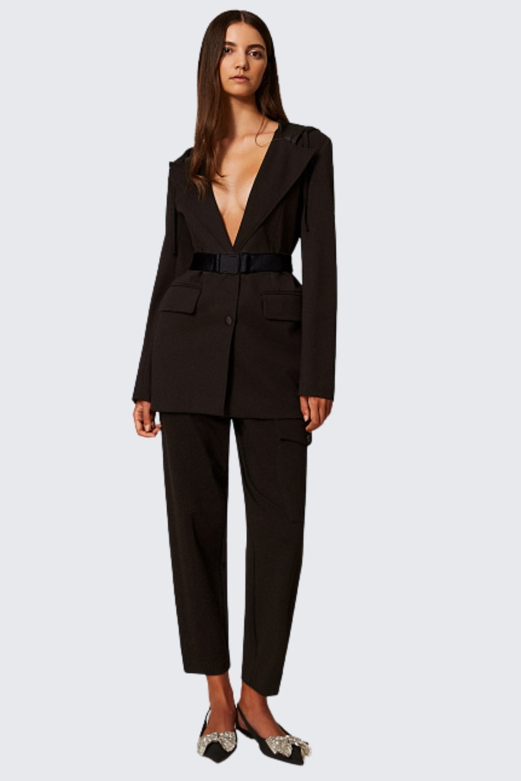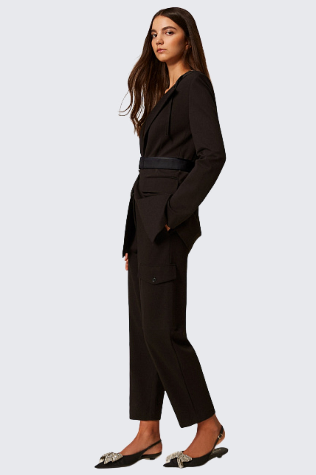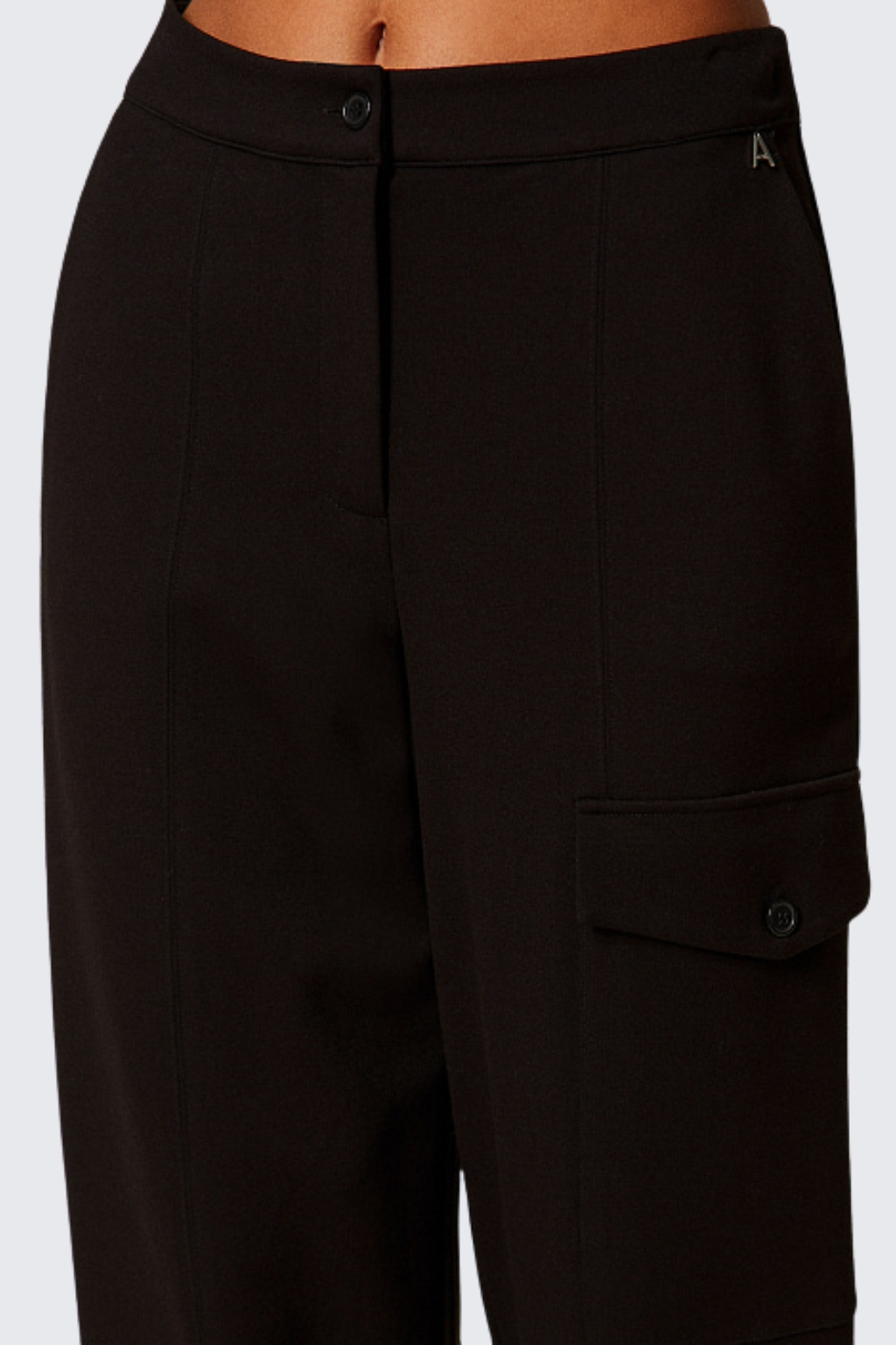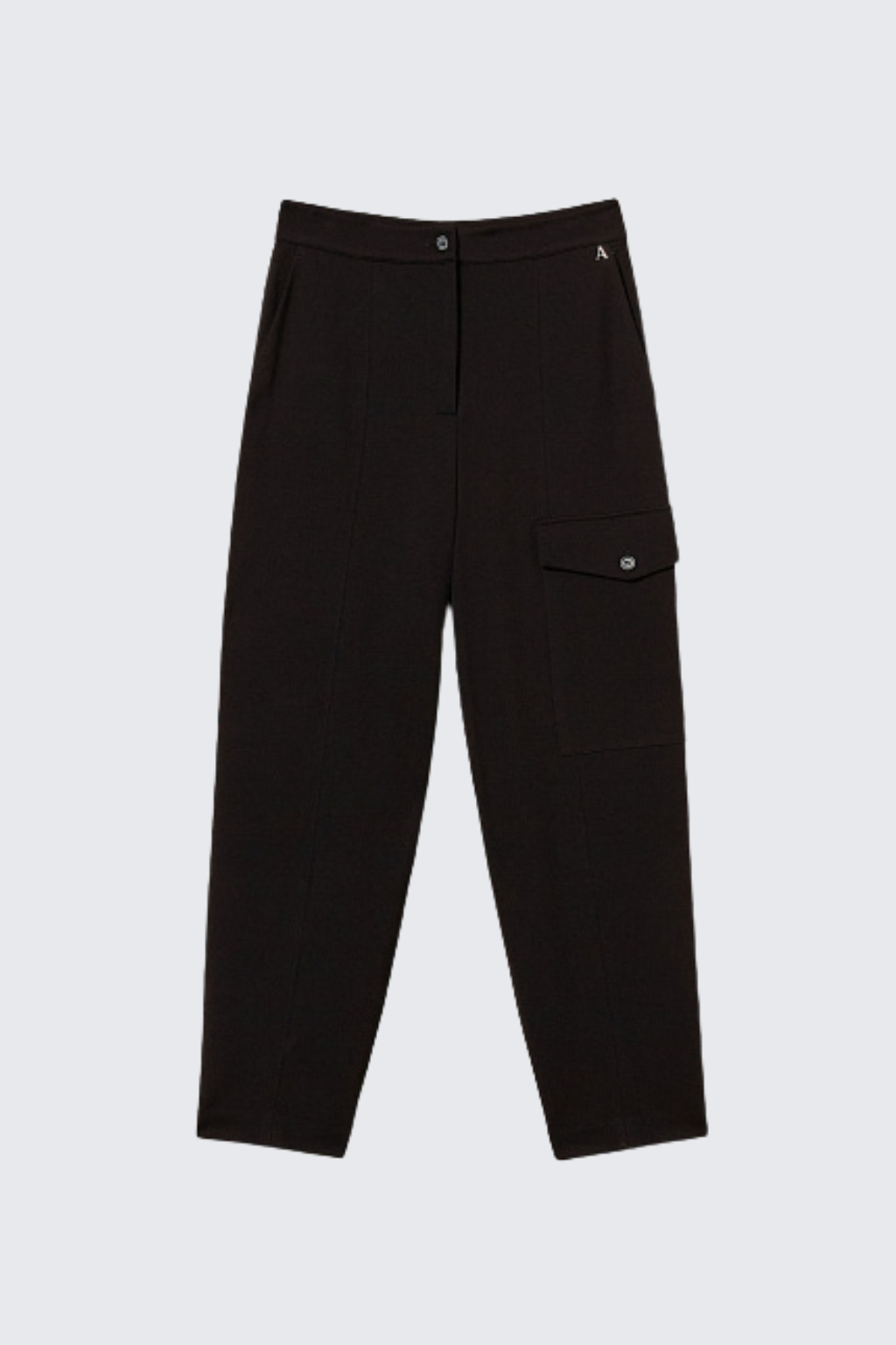Dámské kalhoty značky TWINSET mají rovný střih a zkrácenou délku. Model má v pase manžetu a zapínání na zip a knoflík. Po stranách jsou dvě průhmatové kapsy a nad přední levou je nášivka písmene A. Na levé nohavici je cargo kapsa na knoflík.