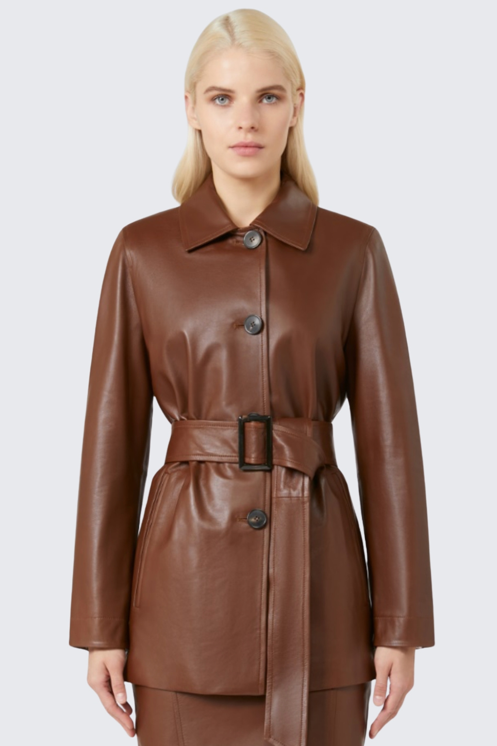Dámské kožené sako značky MaxMara má košilový límeček a opasek s přezkou v pase pro zdůraznění siluety postavy. Sako je vyrobeno z nappa kůže a má dlouhé rukávy a střední délku. Po stranách jsou lemované kapsy, zapínání je na čtyři knoflíky.