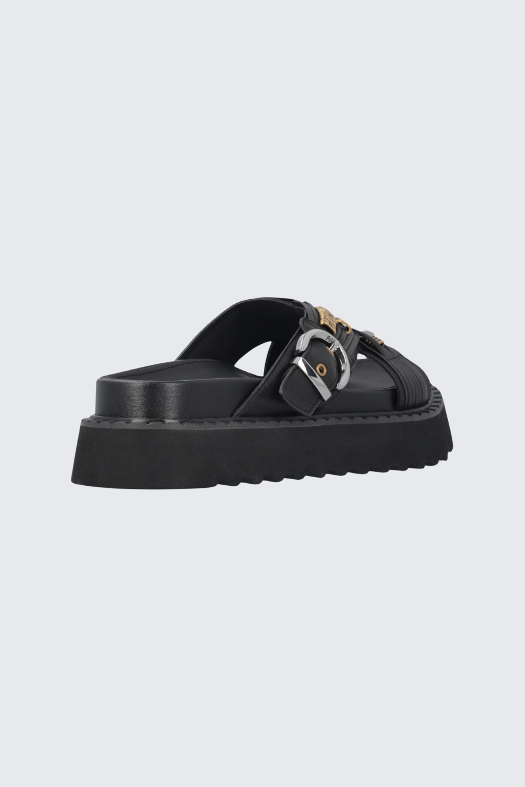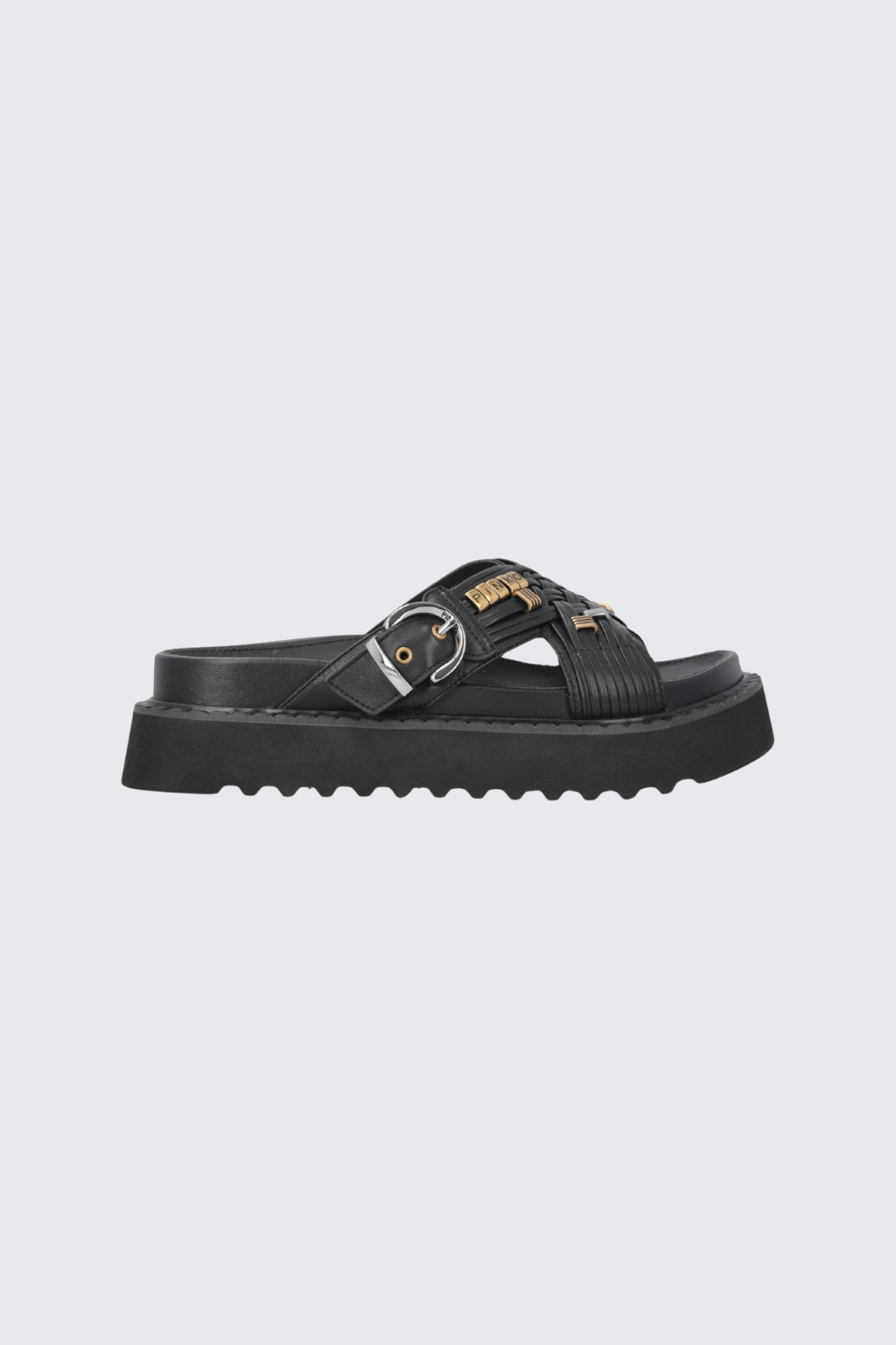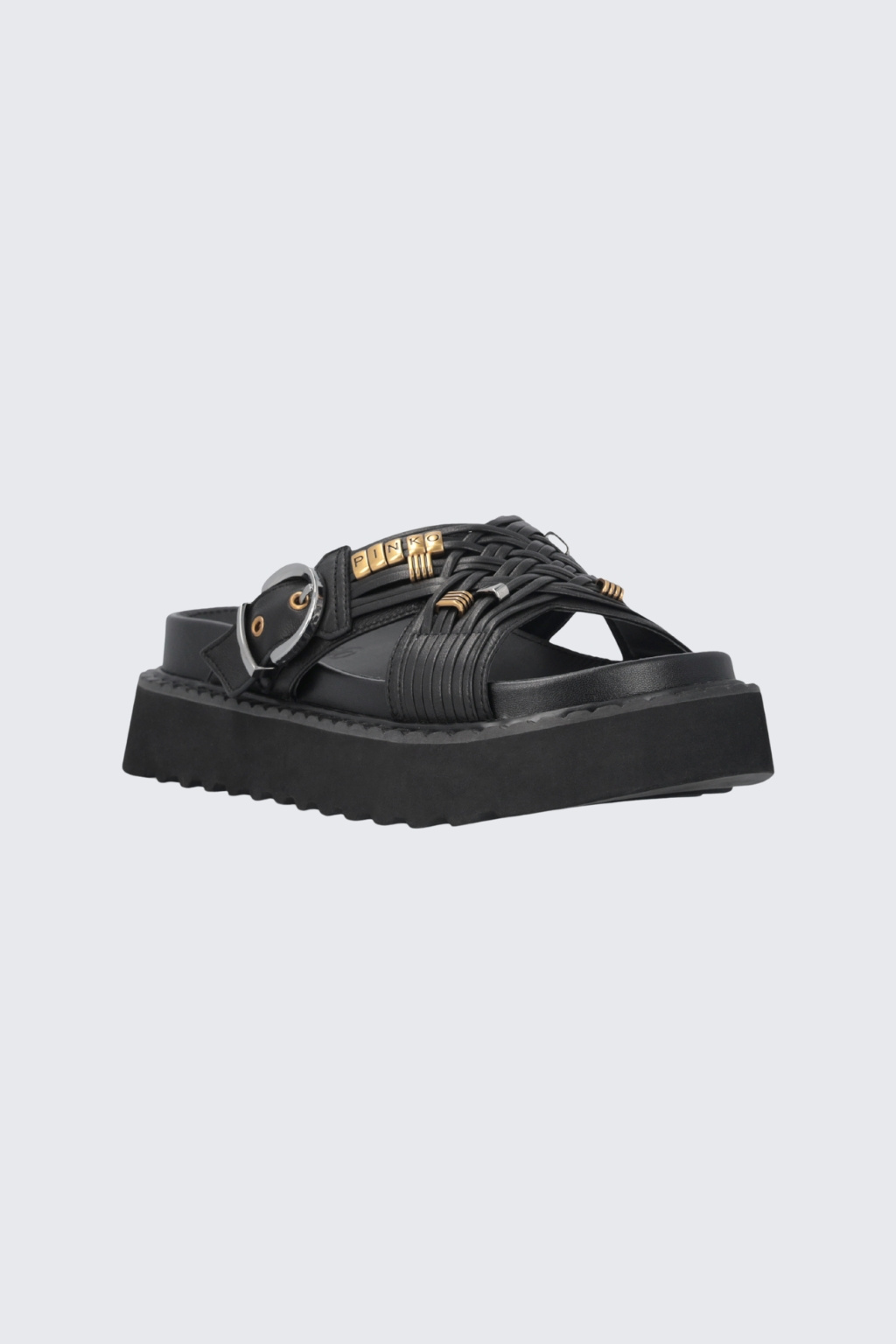 Dámské pantofle značky PINKO mají dva zkřížené a propletené pásky, které stylově obepínají chodidlo. Boty jsou zdobené zlatým písmem, kovovými detaily a přezkou na přední straně. Mají vroubkovanou podrážku a vyšší platformu.