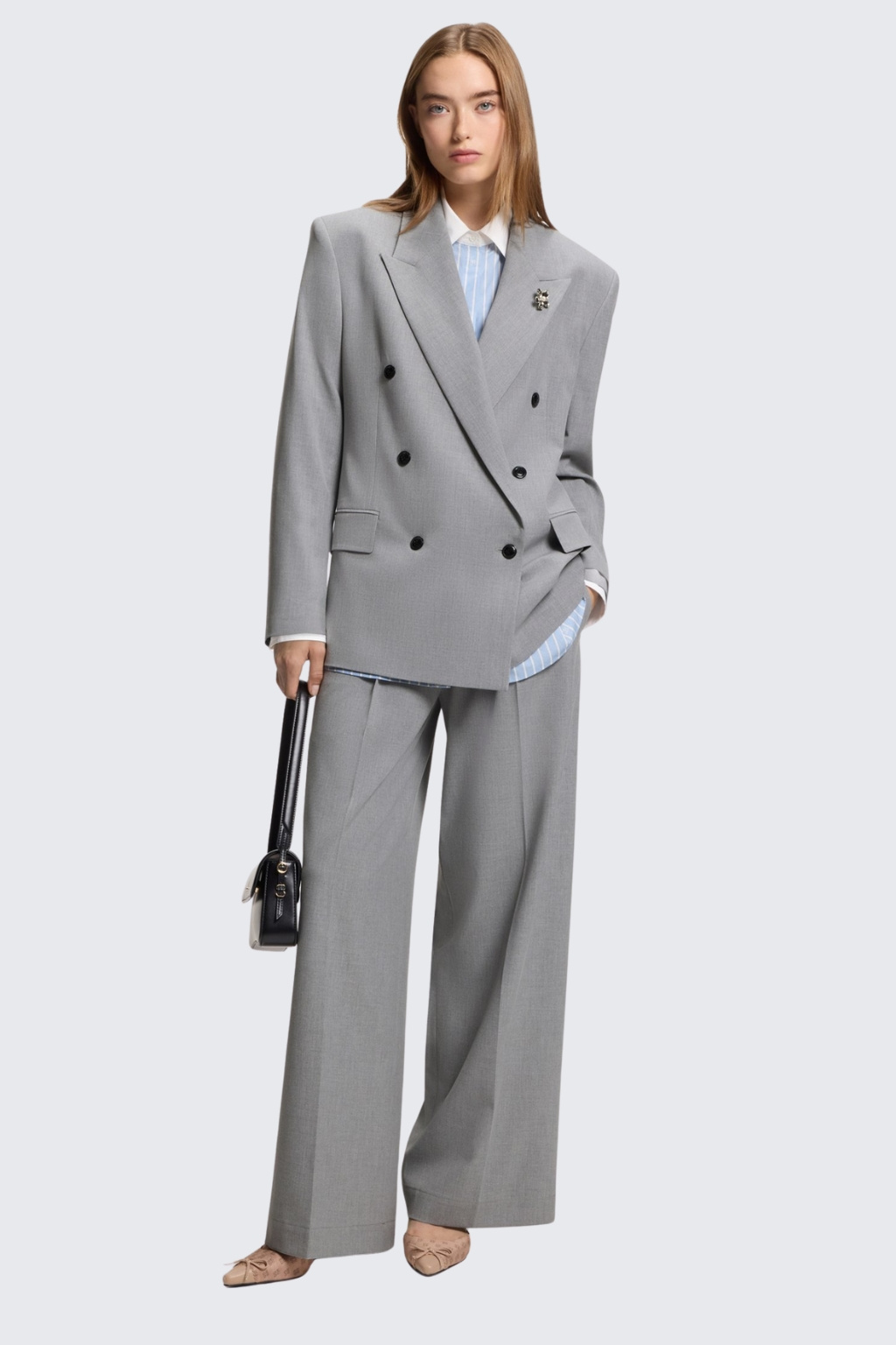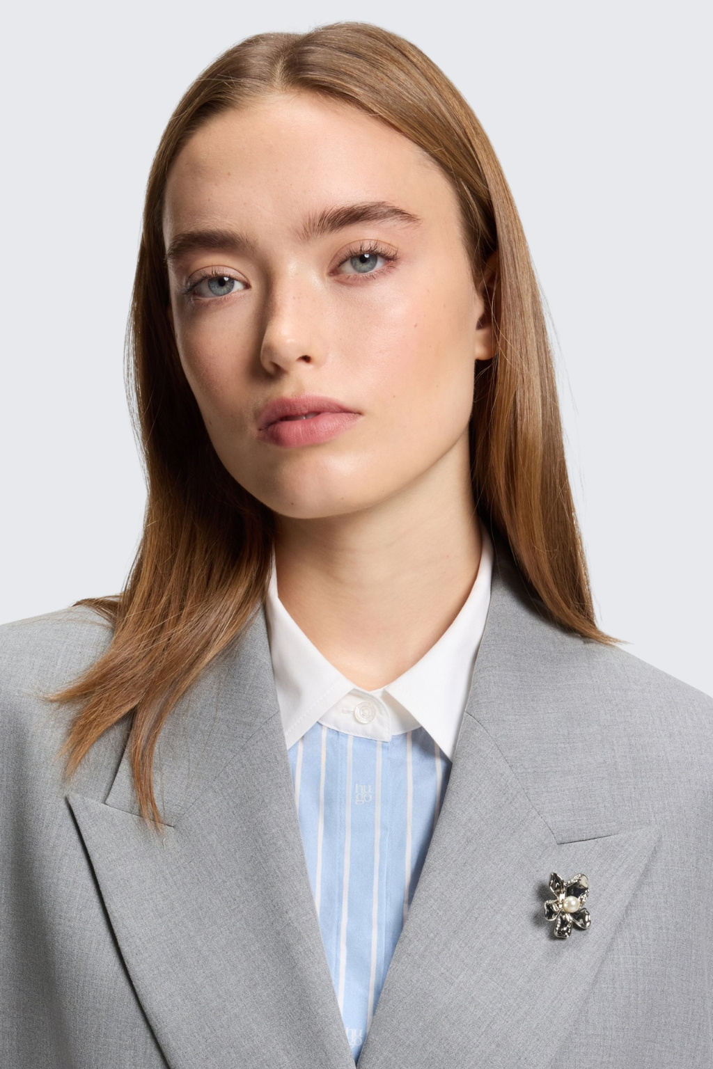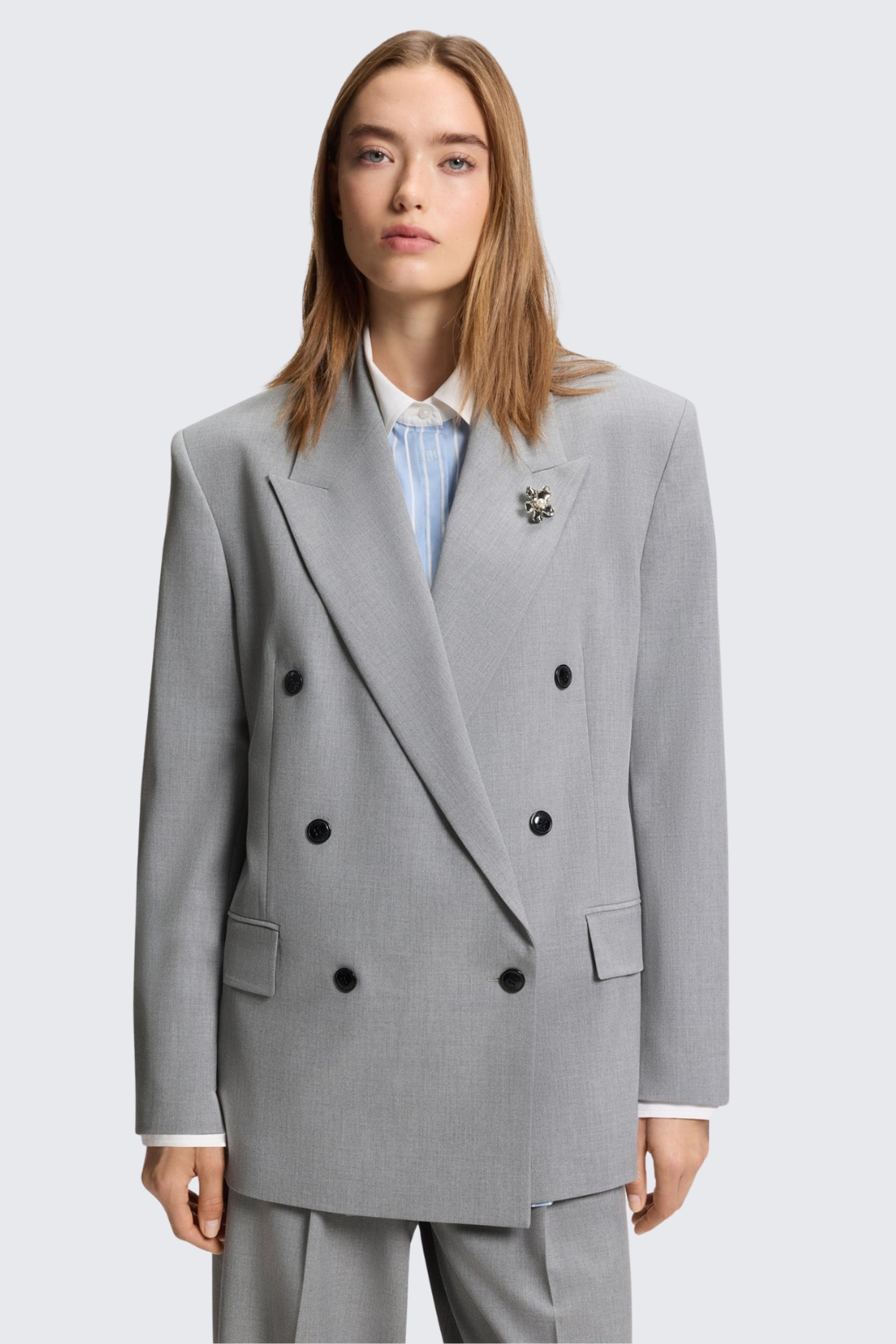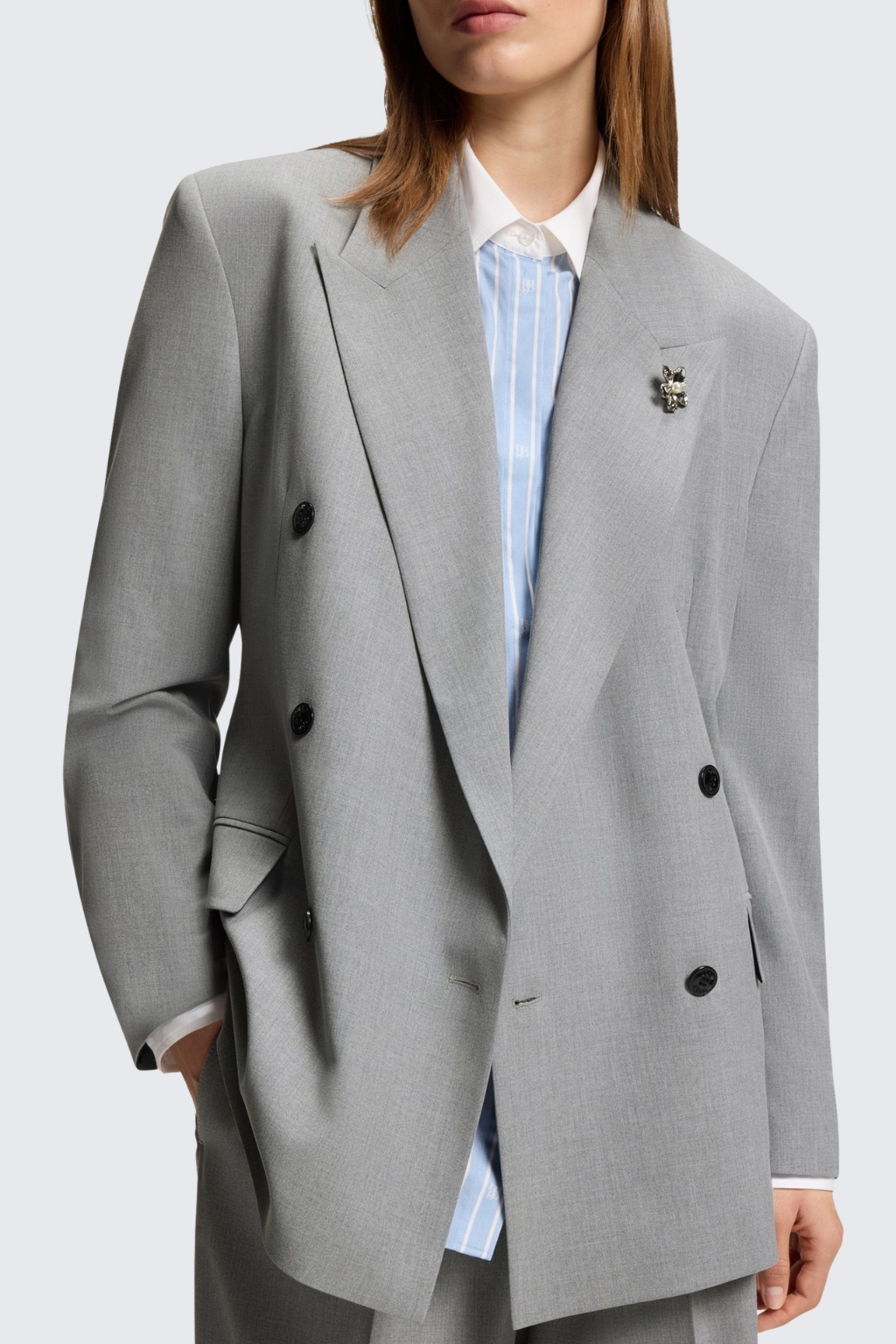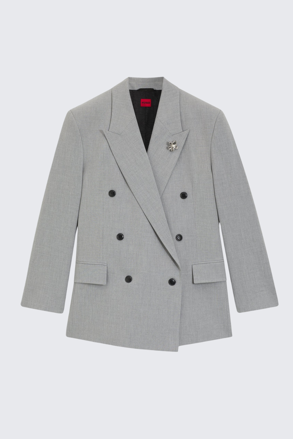 Dámské sako značky HUGO je vyrobeno z jednobarevné látky. Sako má lesklý dojem díky použití kovové nitě. Má zapínání na knoflíky a klasické, špičaté klopy. Sako má na hrudi brož a vespod dvě klopové kapsy.