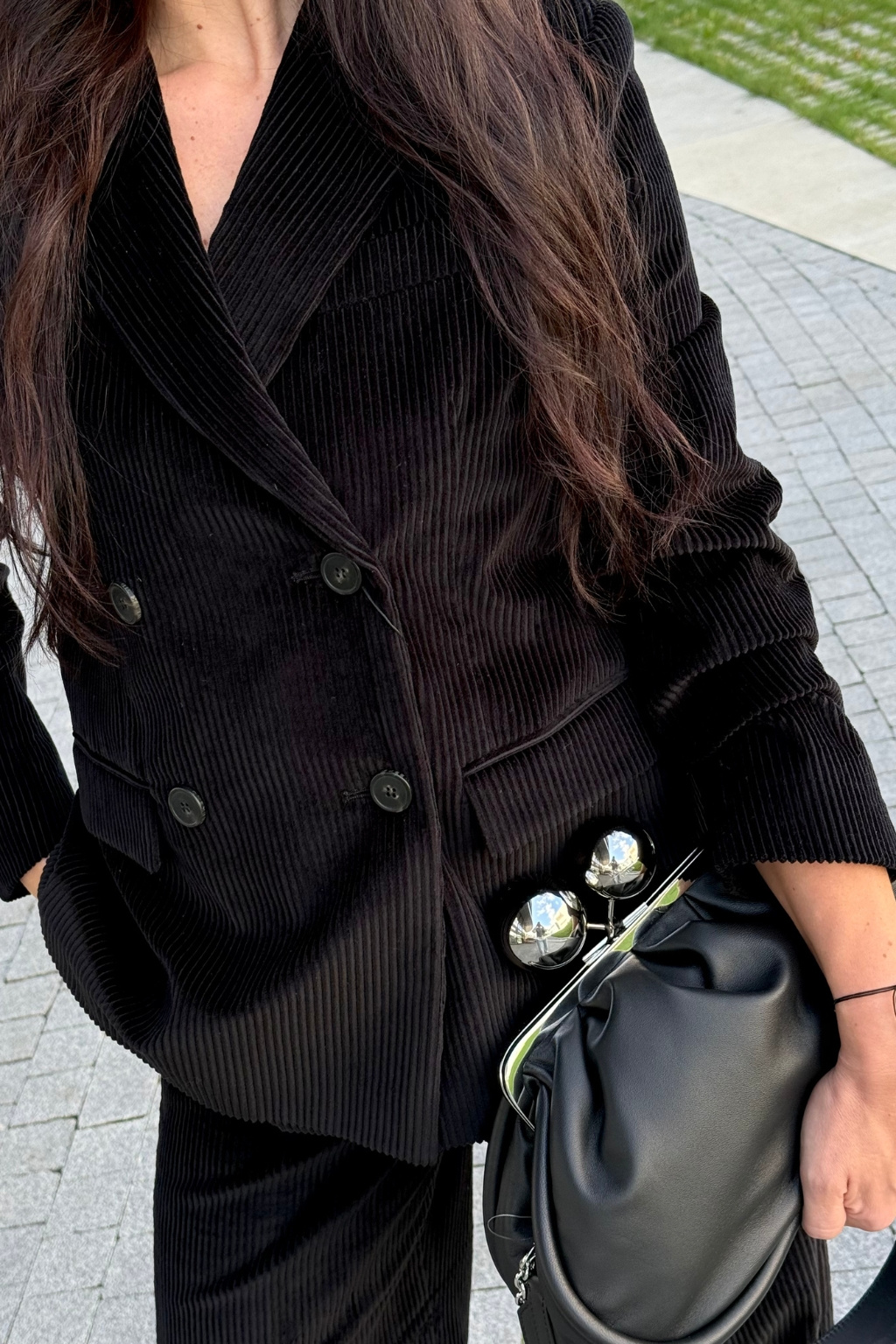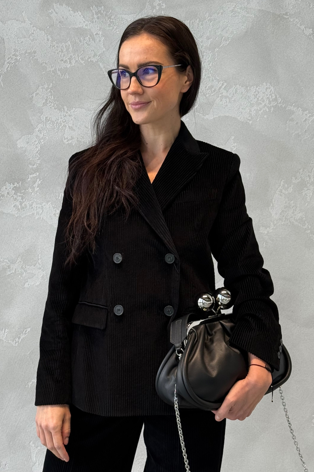 Dámské manšestrové dvouřadé sako značky MaxMara má mírně širší siluetu. Sako má límec s klopami a dlouhé rukávy s knoflíky pro individuální nastavení. Model má dvouřadé zapínání na knoflíky a vespod dvě klopové kapsy. Na hrudi je jedna náprsní kapsička, na zadní straně je uprostřed krátký rozparek. Sako je vyrobeno z čisté bavlny.
