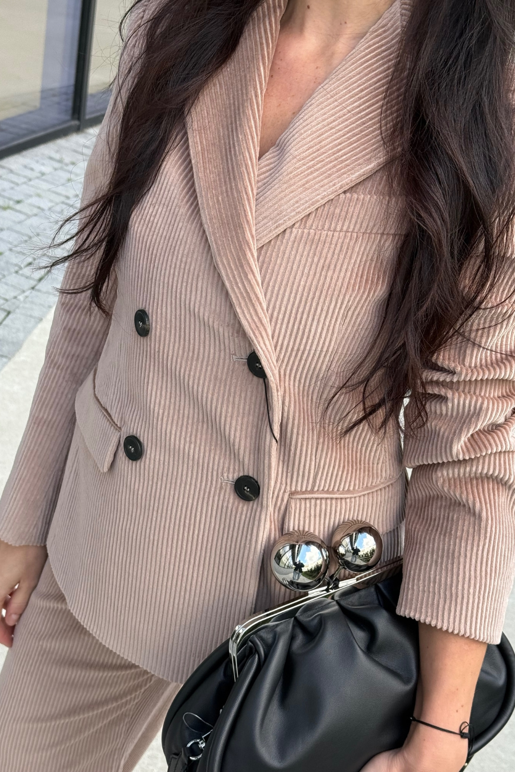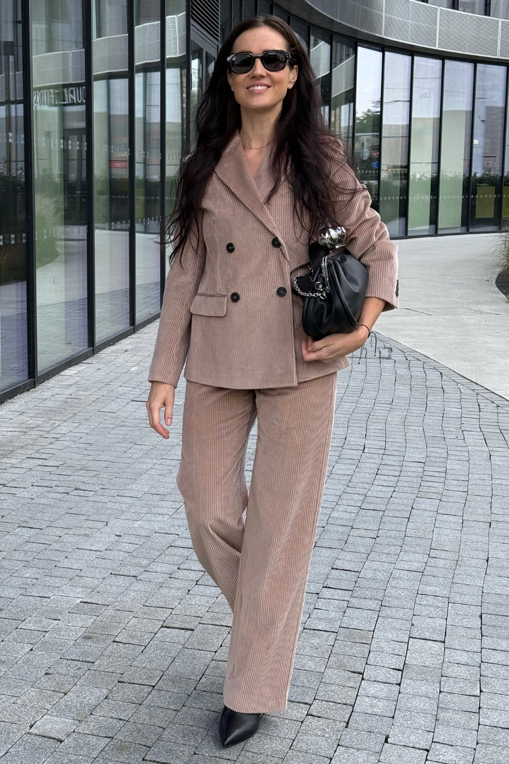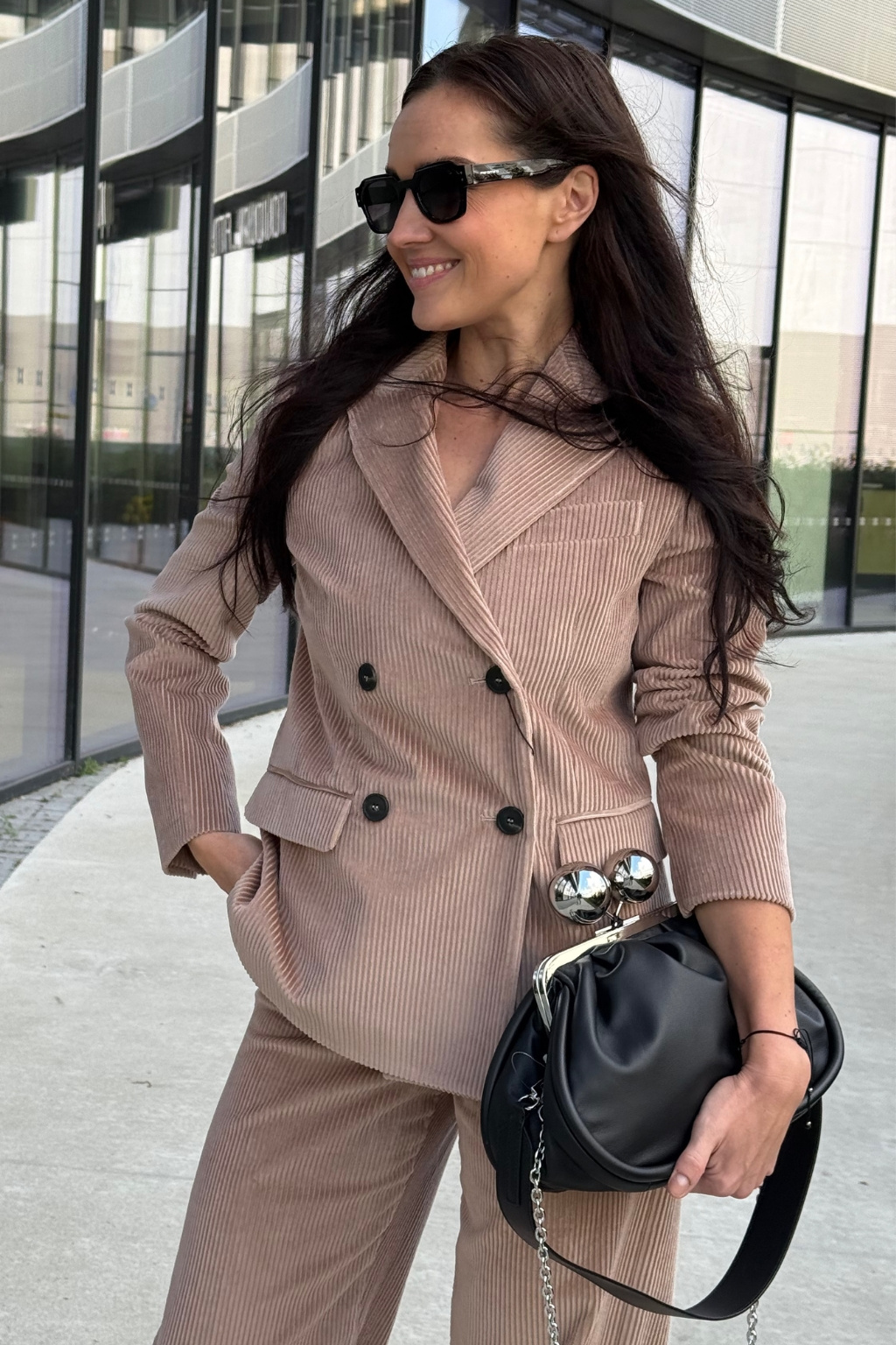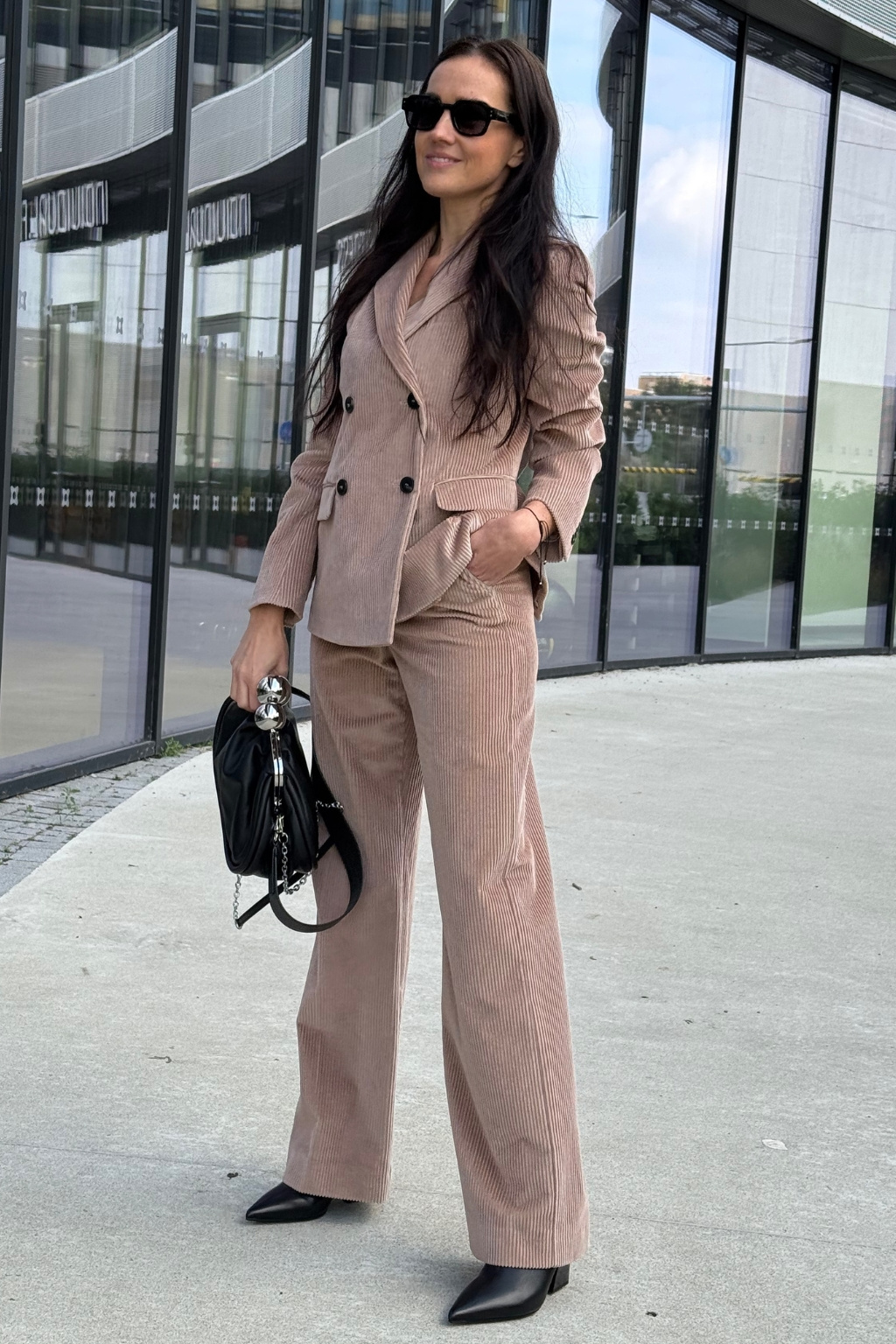 Dámské manšestrové dvouřadé sako značky MaxMara má mírně širší siluetu. Sako má límec s klopami a dlouhé rukávy s knoflíky pro individuální nastavení. Model má dvouřadé zapínání na knoflíky a vespod dvě klopové kapsy. Na hrudi je jedna náprsní kapsička, na zadní straně je uprostřed krátký rozparek. Sako je vyrobeno z čisté bavlny.