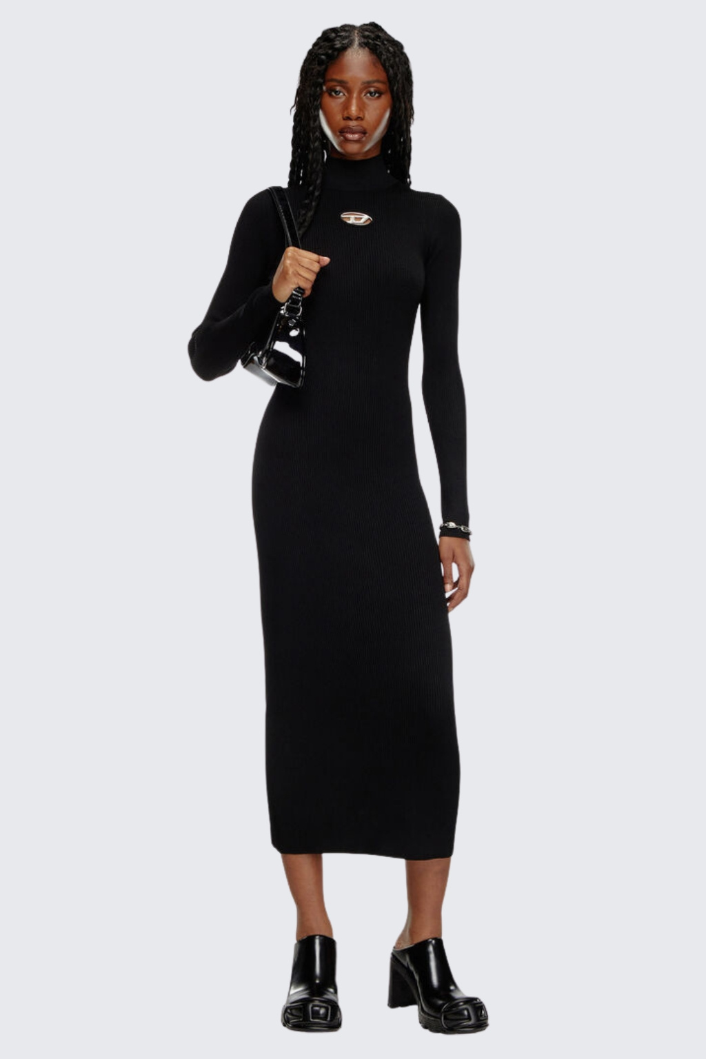 Dámské šaty z kolekce Diesel jsou vyrobené z extrémně příjemného materiálu s vysokým obsahem viskozy. Model má vypasovaný střih, dlouhé rukávy a midi délku. Mají u krku krátký stojáček a na hrudi je ikonické logo značky DIESEL.