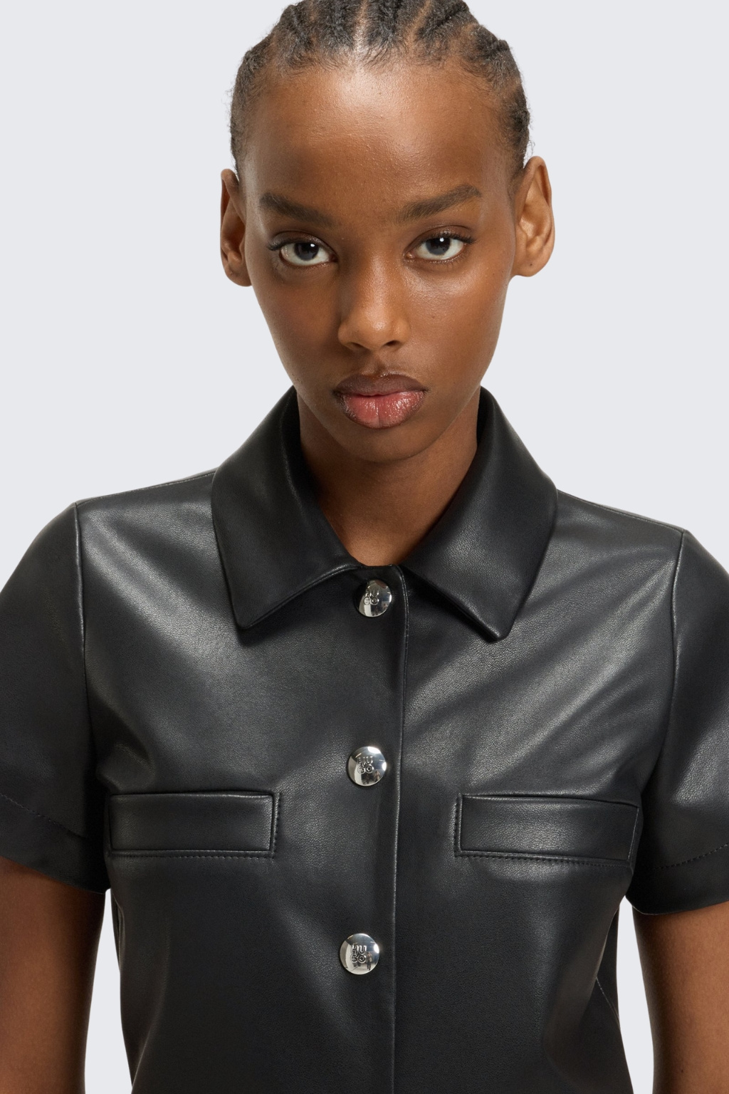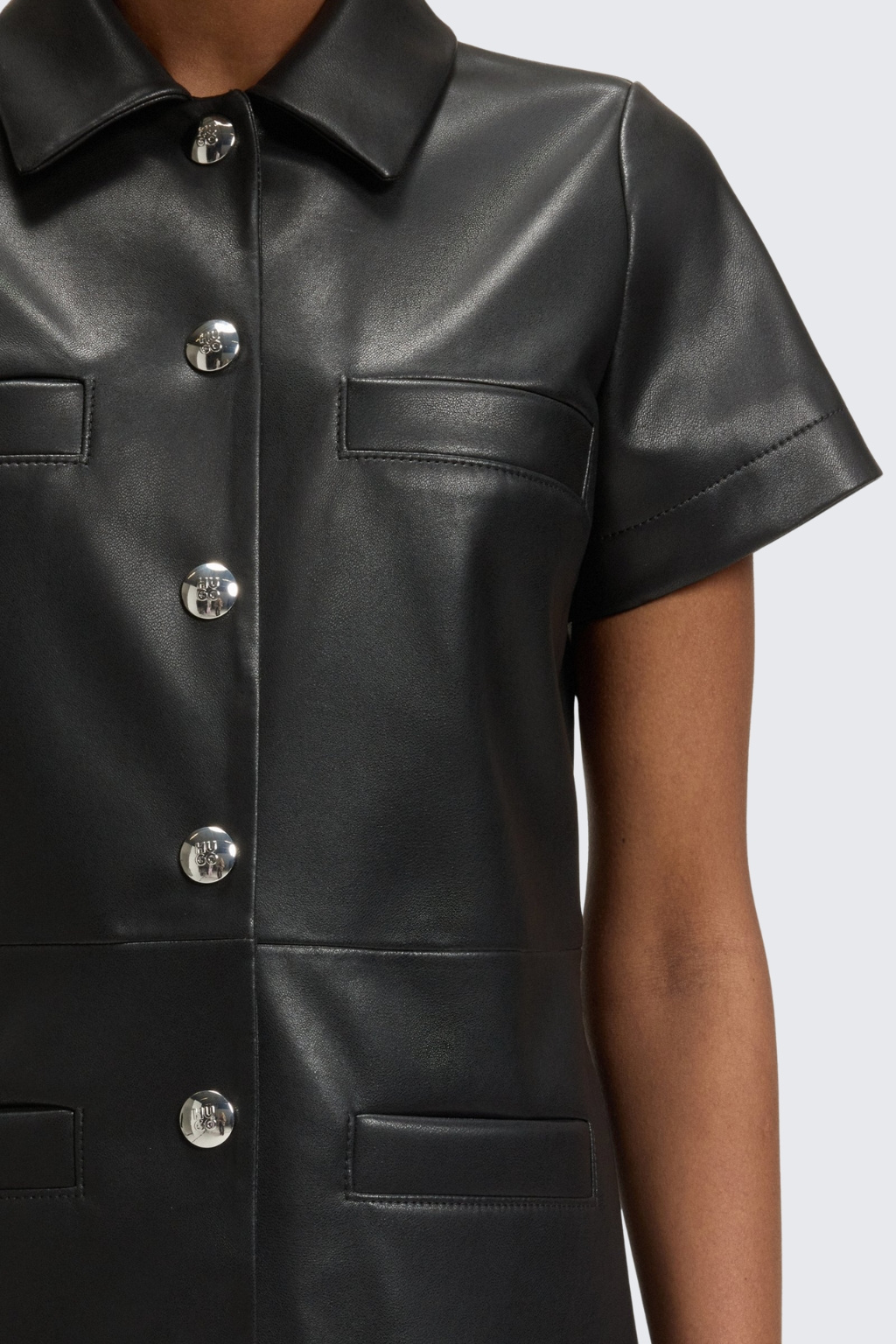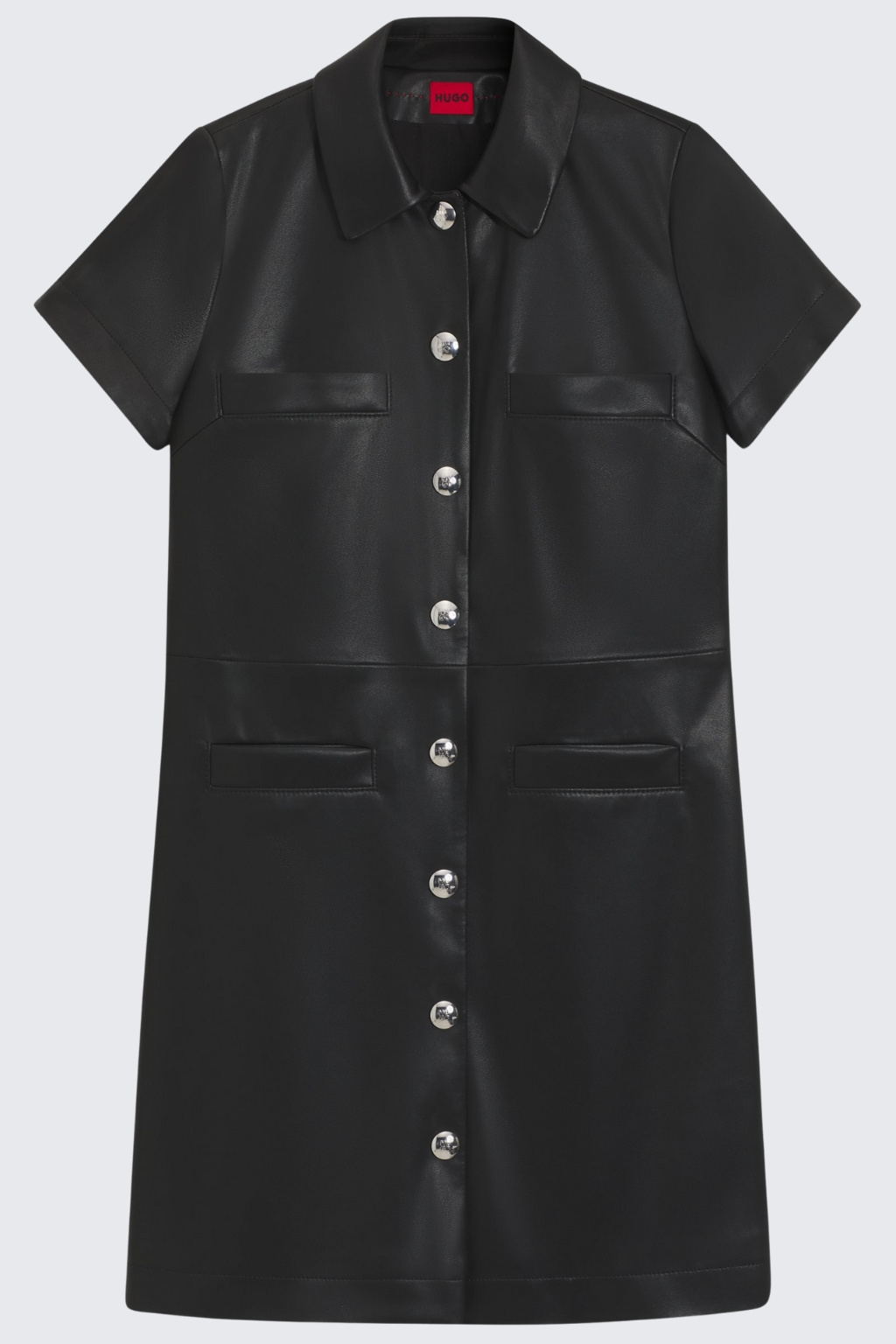 Dámské mini šaty z kolekce HUGO jsou přiléhavého střihu s krátkým rukávem. Mají klasický, košilový límeček a zapínání po celé délce na druky, na kterých je personalizováno logo značky HUGO. Šaty jsou vyrobeny z lesklého, hladkého materiálu a mají čtyři kapsy (dvě náprsní a dvě vespod).
