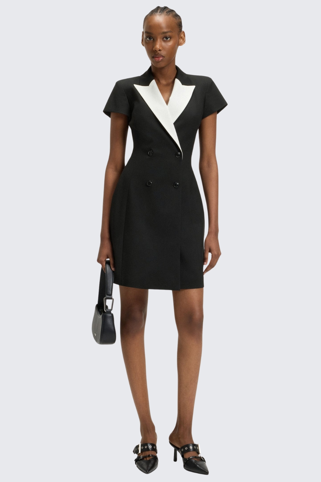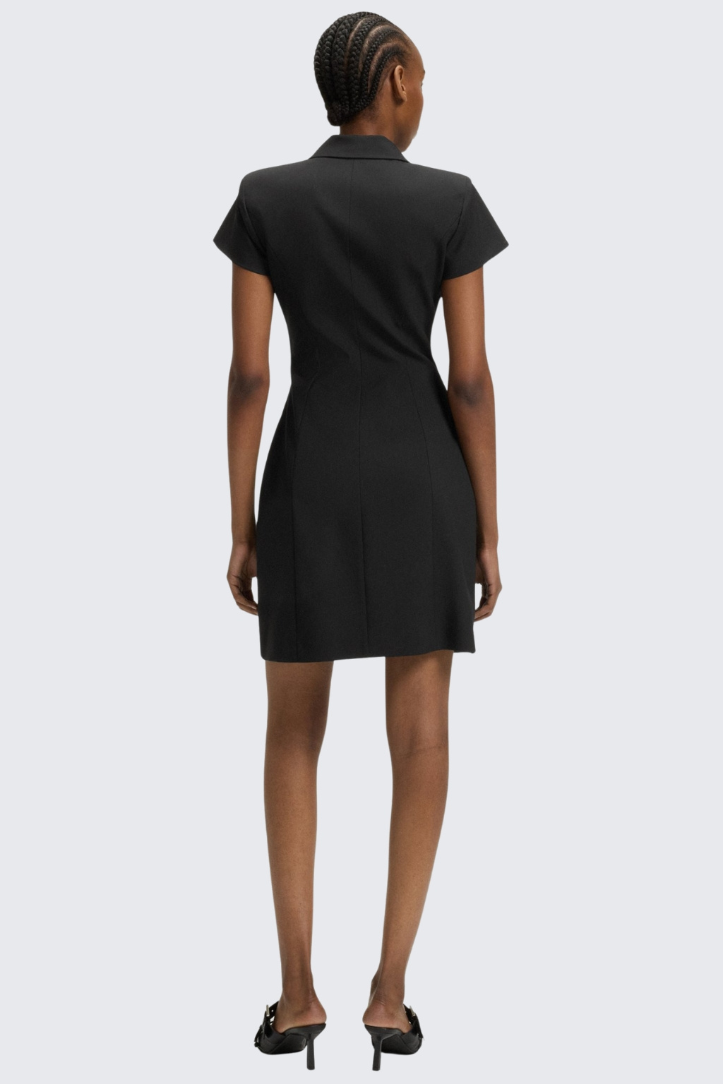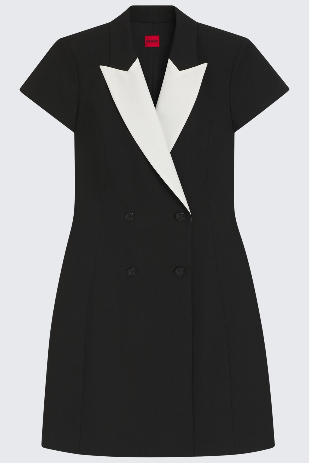Dámské mini šaty z kolekce HUGO jsou přiléhavého střihu s krátkým rukávem. Model je vyroben z lehce elastické látky. Má klopy a dvouřadé zapínání na knoflíky. V ramínkách jsou všité polštářky a vespod sukýnky mají krátký rozparek.