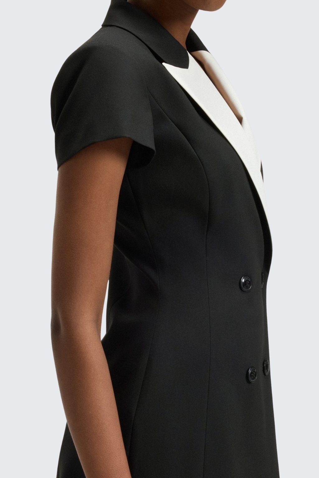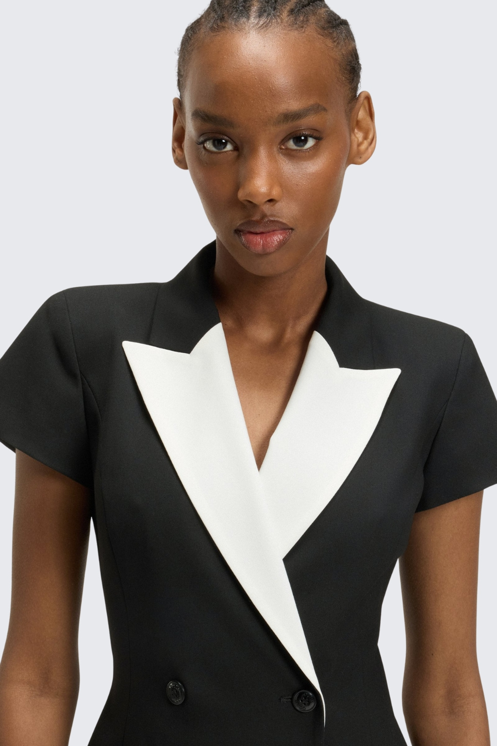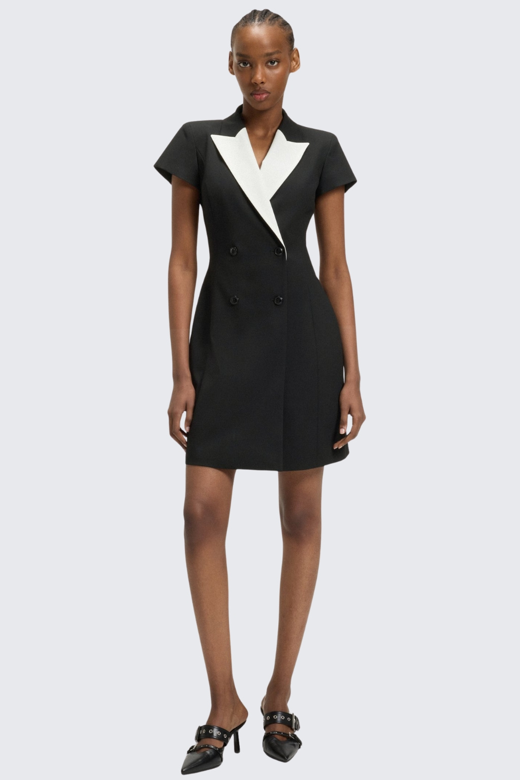 Dámské mini šaty z kolekce HUGO jsou přiléhavého střihu s krátkým rukávem. Model je vyroben z lehce elastické látky. Má klopy a dvouřadé zapínání na knoflíky. V ramínkách jsou všité polštářky a vespod sukýnky mají krátký rozparek.
