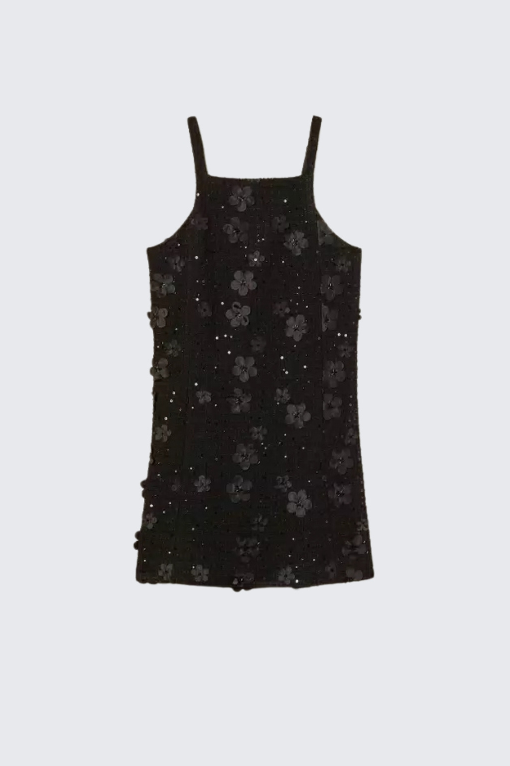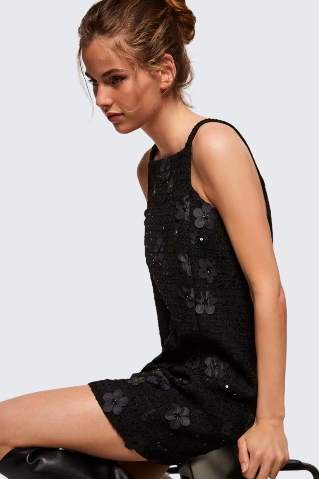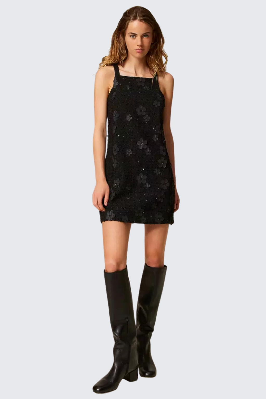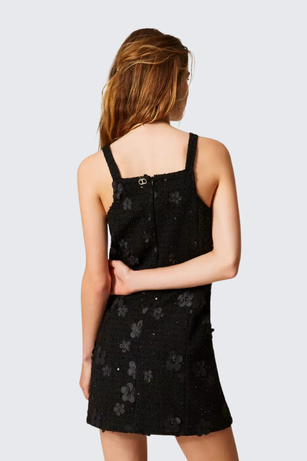 Dámské šaty značky TWINSET jsou vyrobeny z tkaniny s kamínkovou a květovanou aplikací. Model má mini délku, áčkový střih a zapínání na zip na zadní straně. Šaty mají tenká ramínka a hranatý výstřih. Na zadní straně je malá nášivka s oválným logem značky TWINSET ve tvaru T.