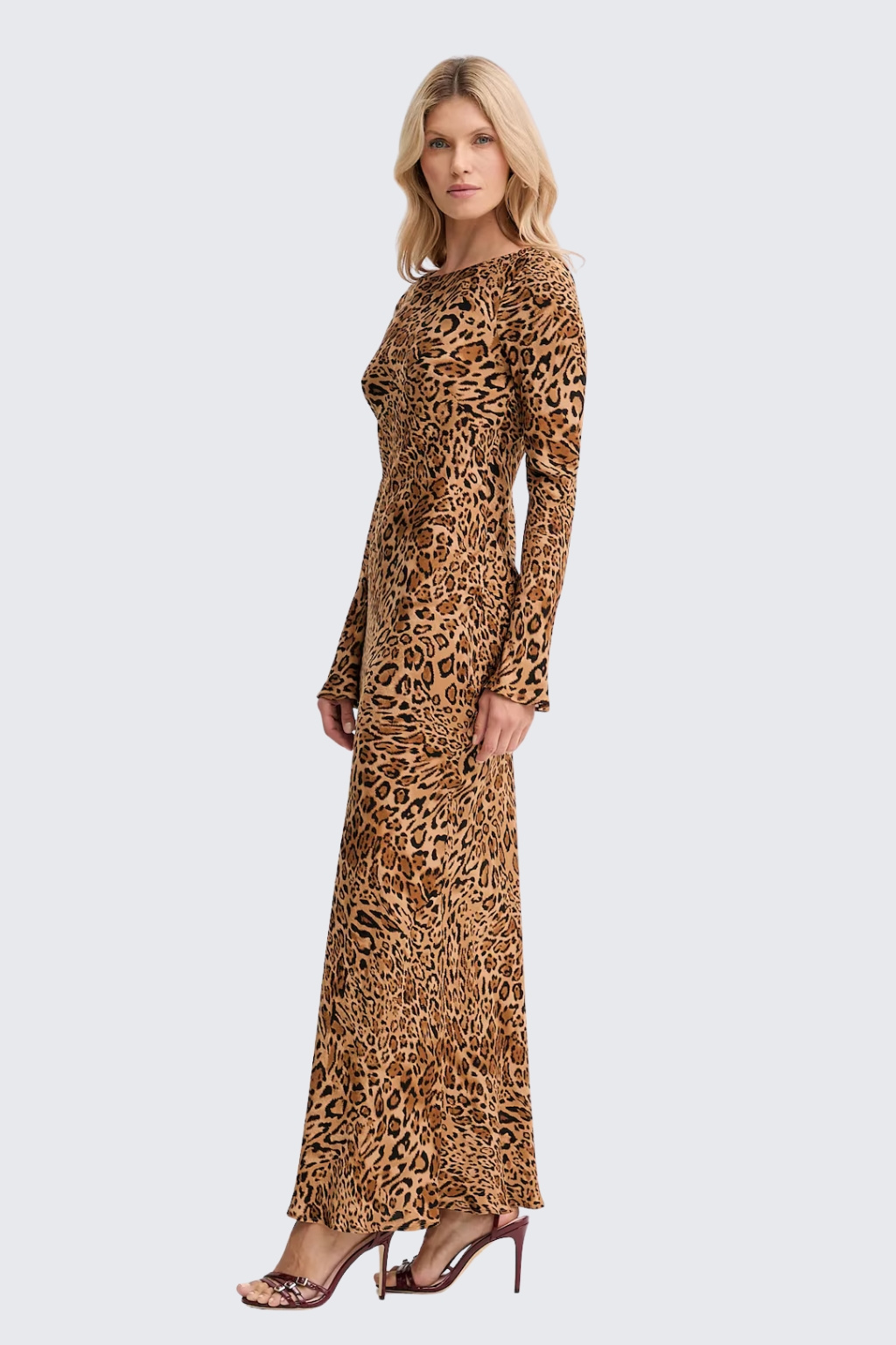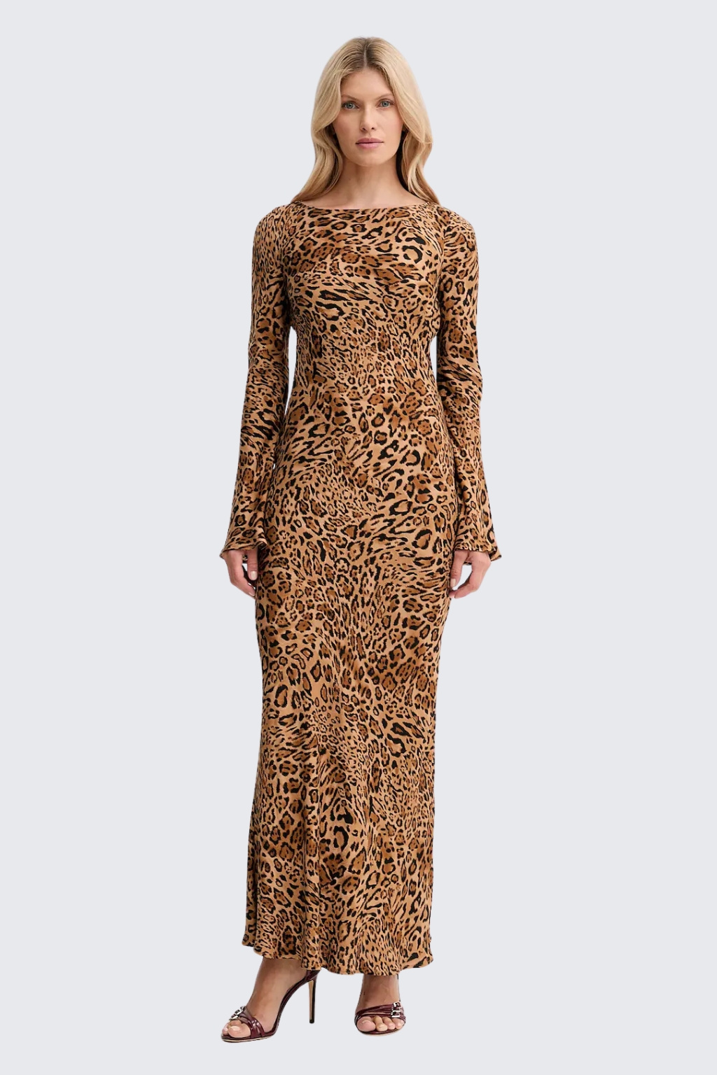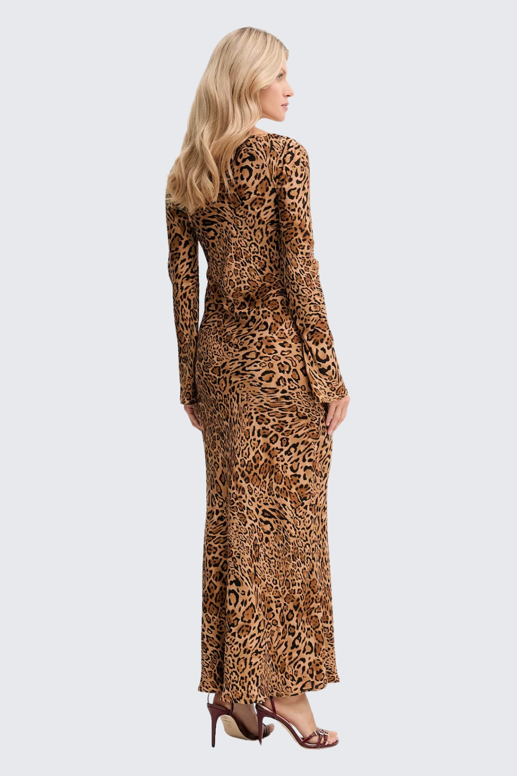 Dámské šaty značky TWINSET jsou dlouhého střihu s dlouhými rozšiřujícími se rukávy. Jsou vyrobeny z viskozy se zvířecím potiskem. Šaty mají klasický, kulatý výstřih a boční zapínání na zip. Model má áčkový střih a na zadní straně je nášivka s oválným logem značky TWINSET ve tvaru T.