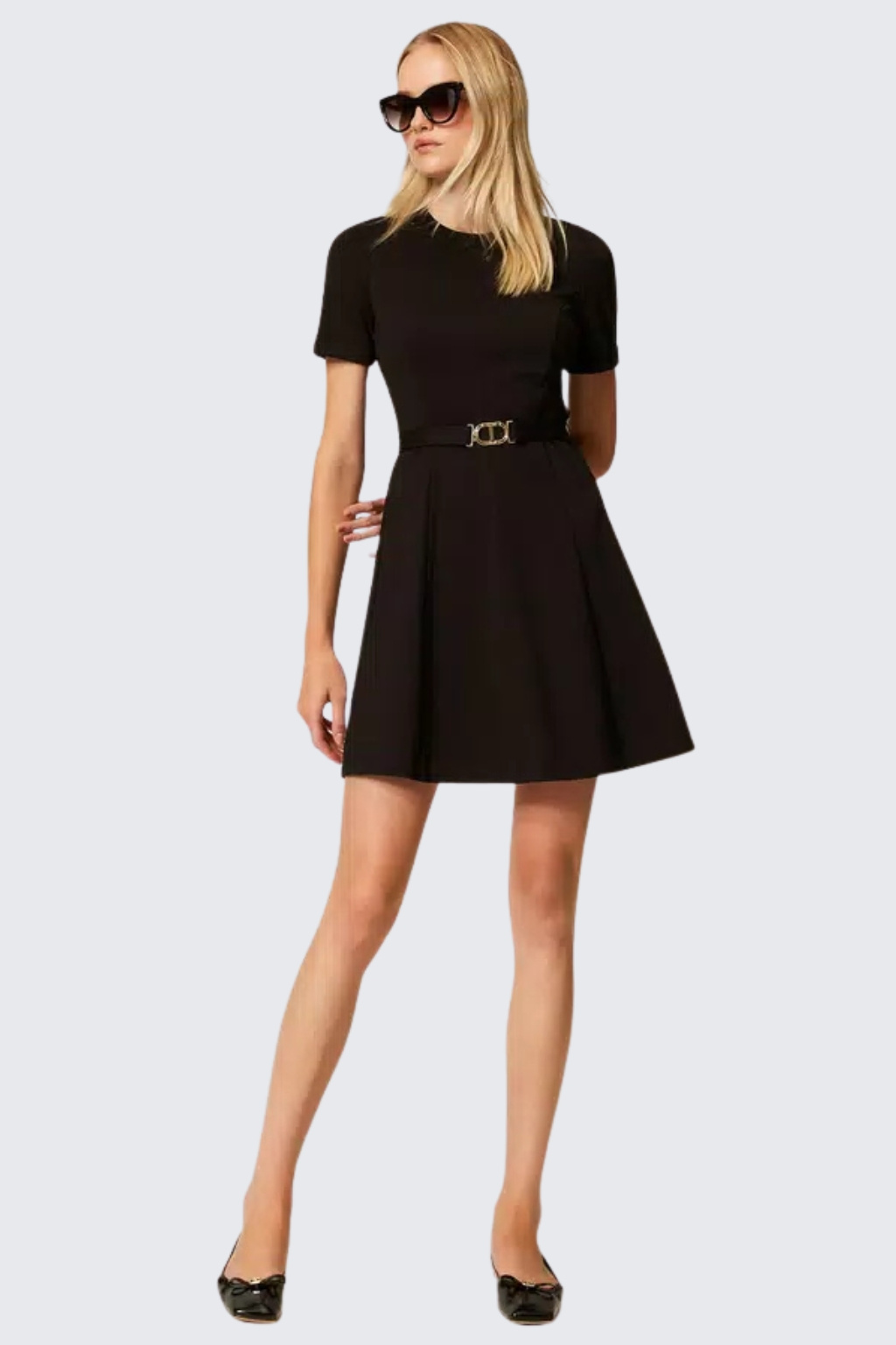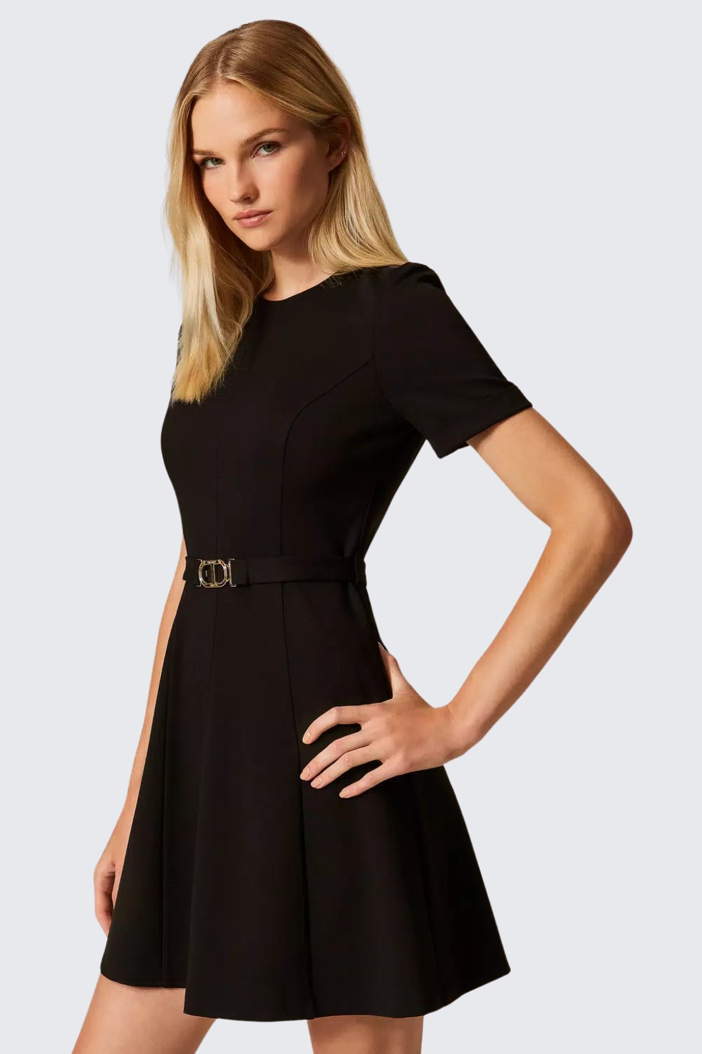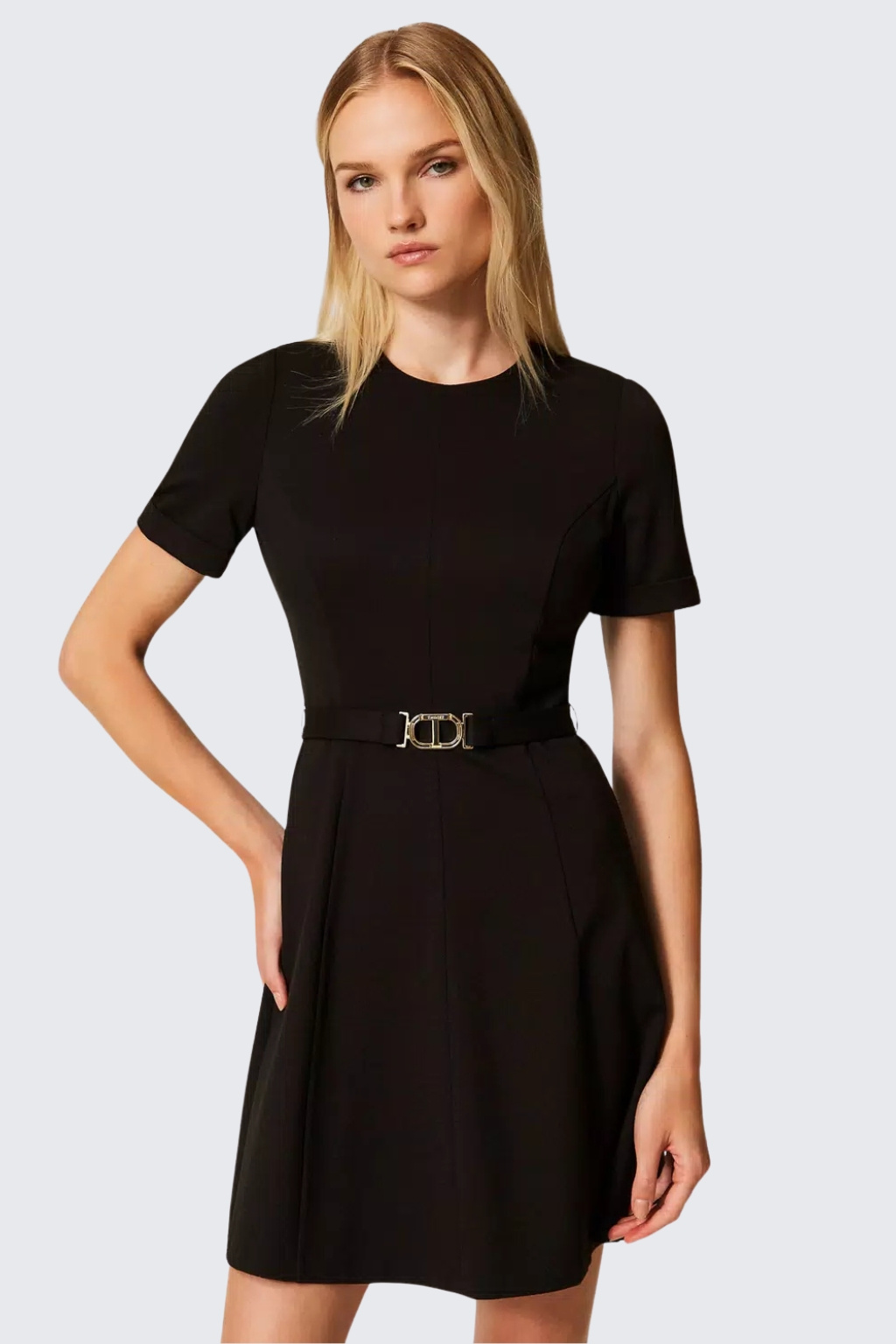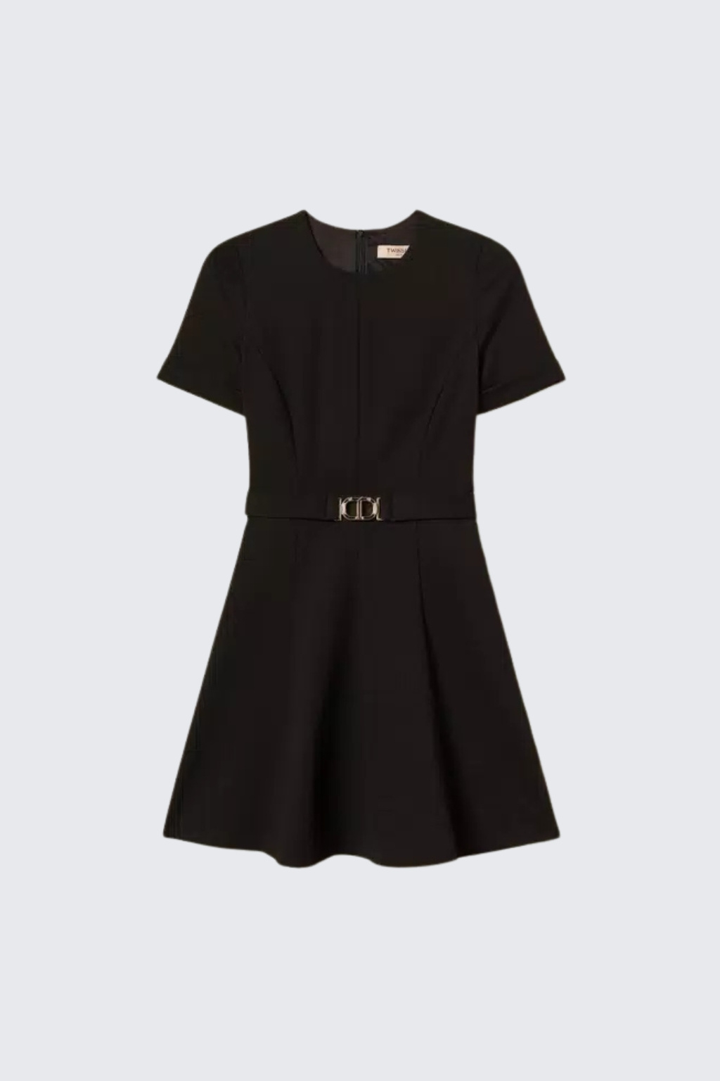 Dámské šaty značky TWINSET jsou krátkého střihu s krátkými rukávy. Jsou vyrobeny z extrémně příjemného materiálu s vysokým obsahem viskózy. Šaty mají klasický, kulatý výstřih a áčkový střih s textilním páskem v pase, na kterém je doplněno oválné logo značky TWINSET ve tvaru T. Model má zapínání na skrytý zip a háček, na zadní straně je u krku nášivka s logem značky.