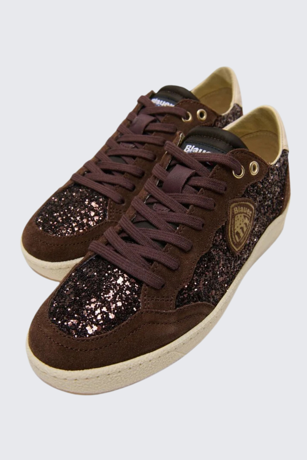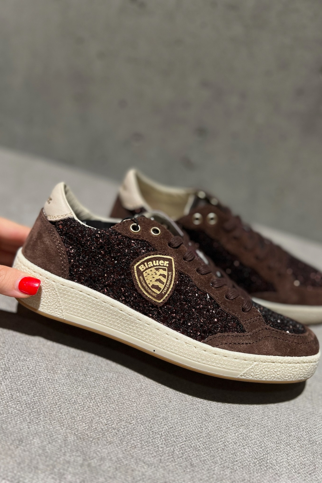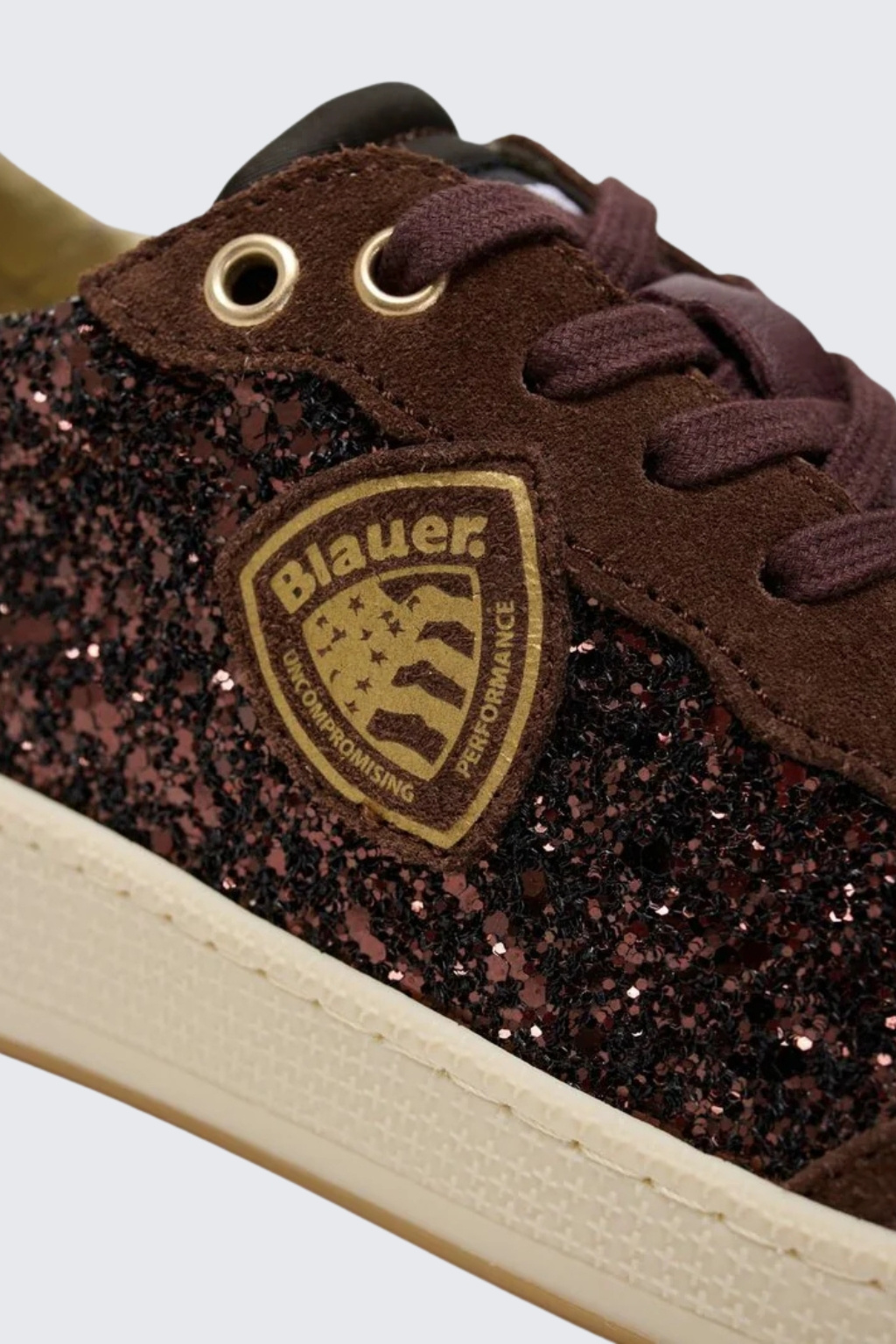 Dámské tenisky značky BLAUER. Model je vyroben z kombinace semiše, přírodní a ekologické kůže. Boty mají vyztuženou patu a kulatou špičku, boty mají třpytivé bloky. Zavazování je na ploché tkaničky. Na vnější straně boty je logo erbu značky BLAUER a na jazyku a patě je nápis BLAUER. Boty mají vroubkovanou podrážku.