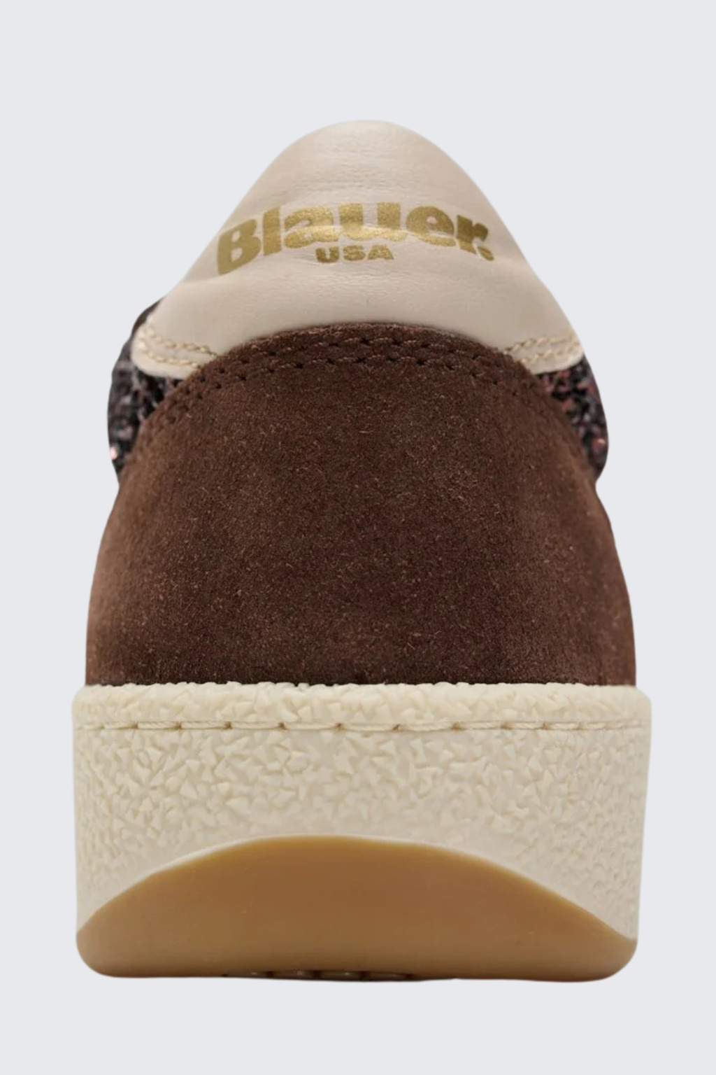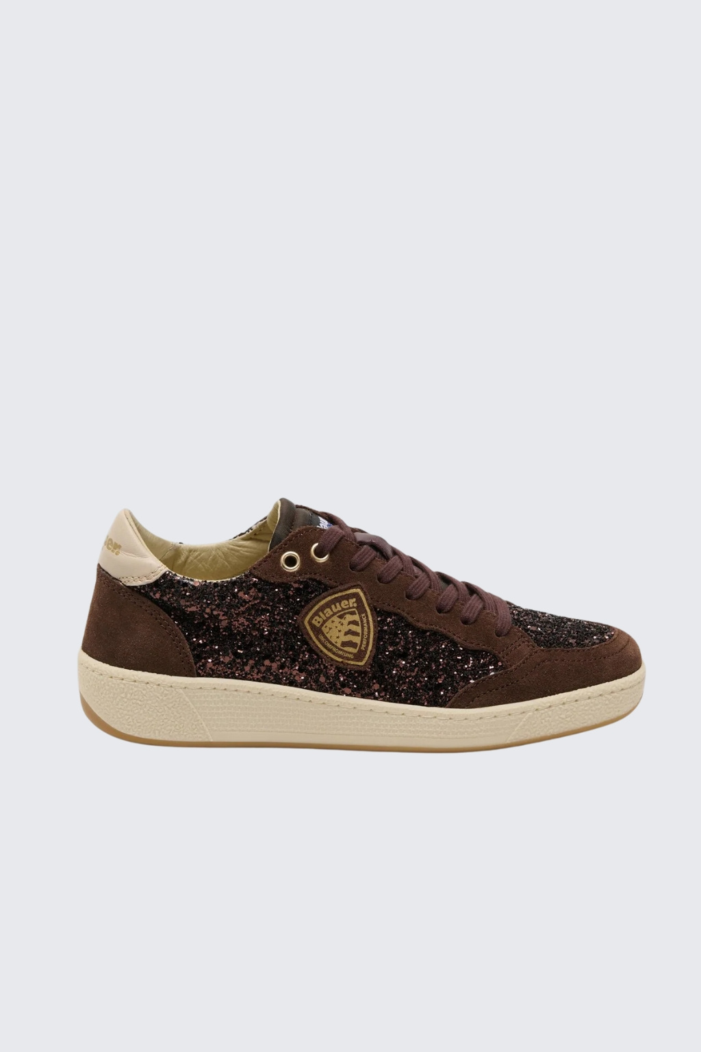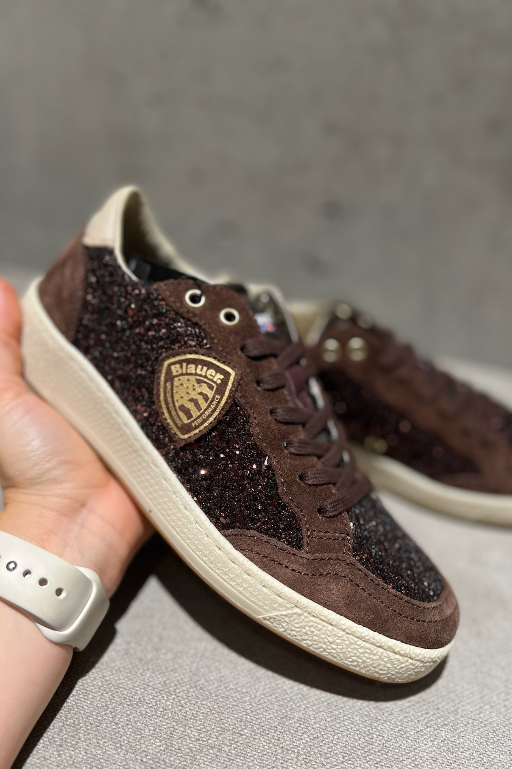 Dámské tenisky značky BLAUER. Model je vyroben z kombinace semiše, přírodní a ekologické kůže. Boty mají vyztuženou patu a kulatou špičku, boty mají třpytivé bloky. Zavazování je na ploché tkaničky. Na vnější straně boty je logo erbu značky BLAUER a na jazyku a patě je nápis BLAUER. Boty mají vroubkovanou podrážku.
