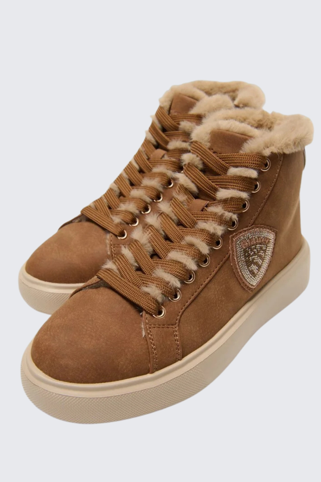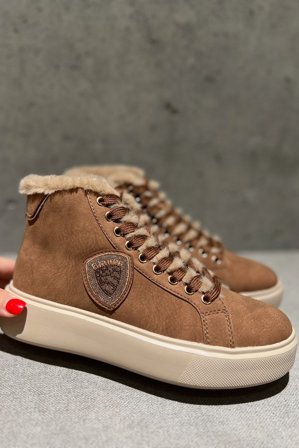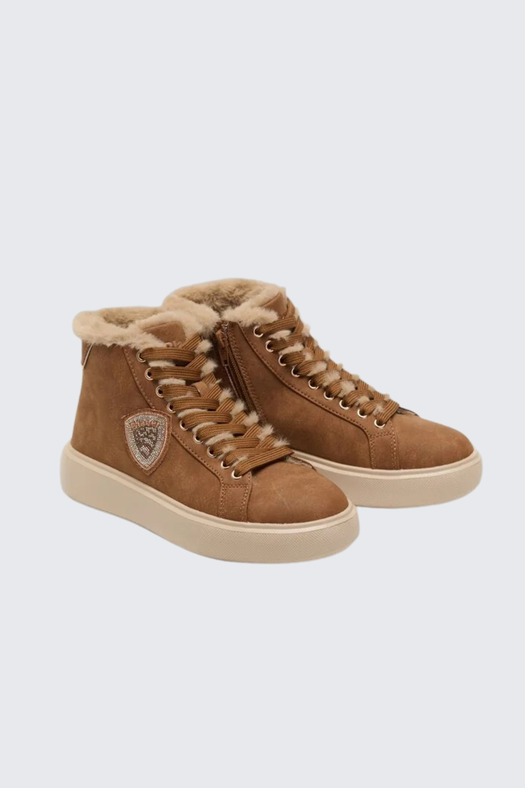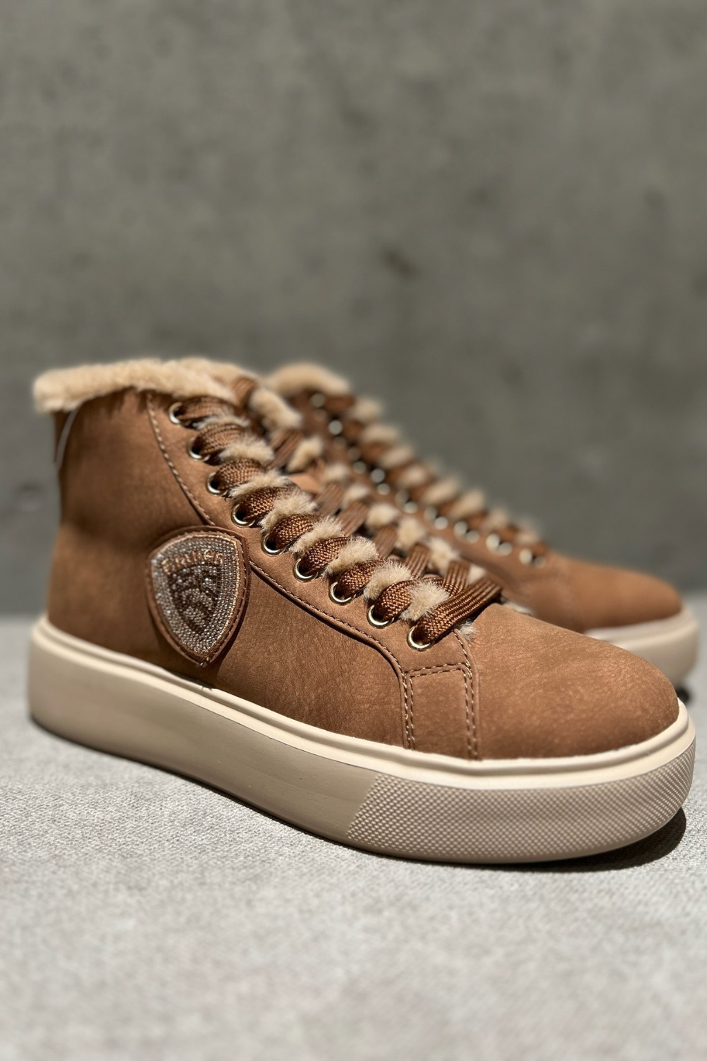 Dámské tenisky značky BLAUER jsou zateplené kožíškem. Model je vyroben z kombinace semišové kůže, ekologické kůže a textilního materiálu. Boty mají vyztuženou patu a kulatou špičku. Zavazování je na ploché tkaničky. Na vnější straně boty je logo značky BLAUER ve tvaru erbu. Boty mají vroubkovanou podrážku a 4 cm platformu.