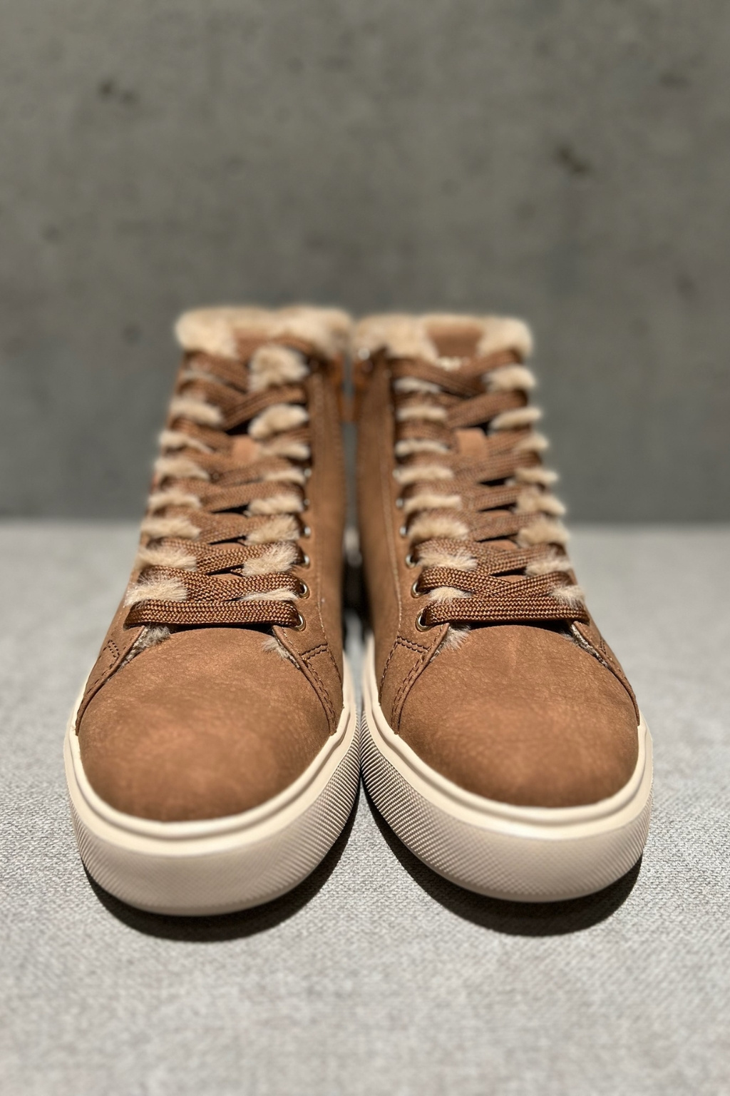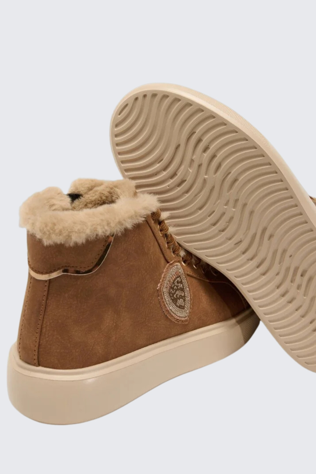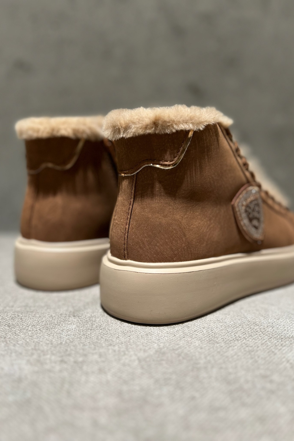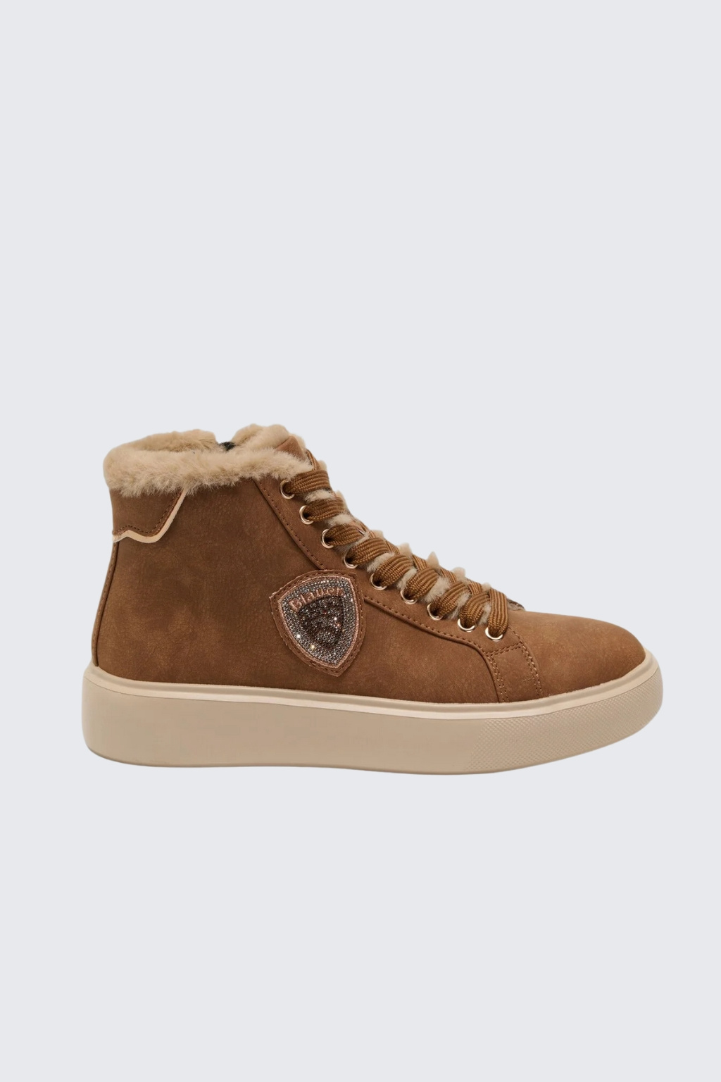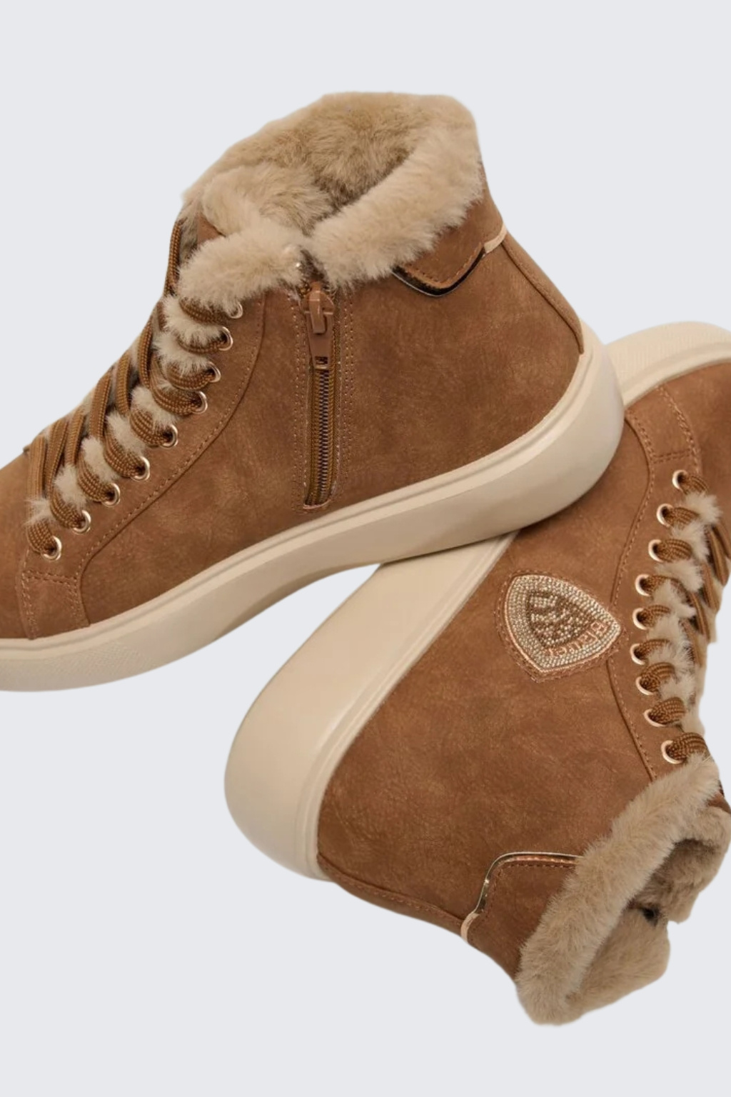 Dámské tenisky značky BLAUER jsou zateplené kožíškem. Model je vyroben z kombinace semišové kůže, ekologické kůže a textilního materiálu. Boty mají vyztuženou patu a kulatou špičku. Zavazování je na ploché tkaničky. Na vnější straně boty je logo značky BLAUER ve tvaru erbu. Boty mají vroubkovanou podrážku a 4 cm platformu.